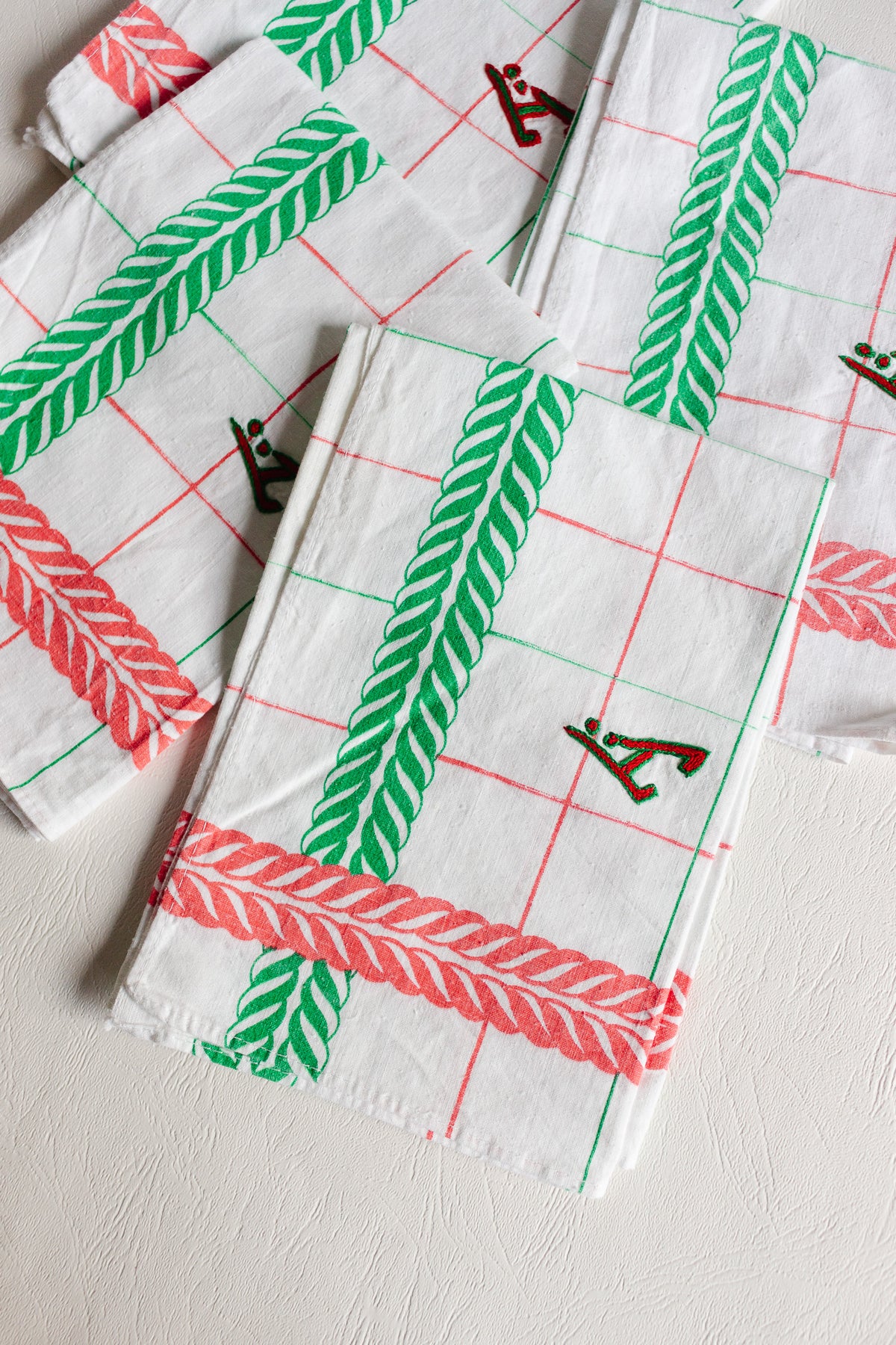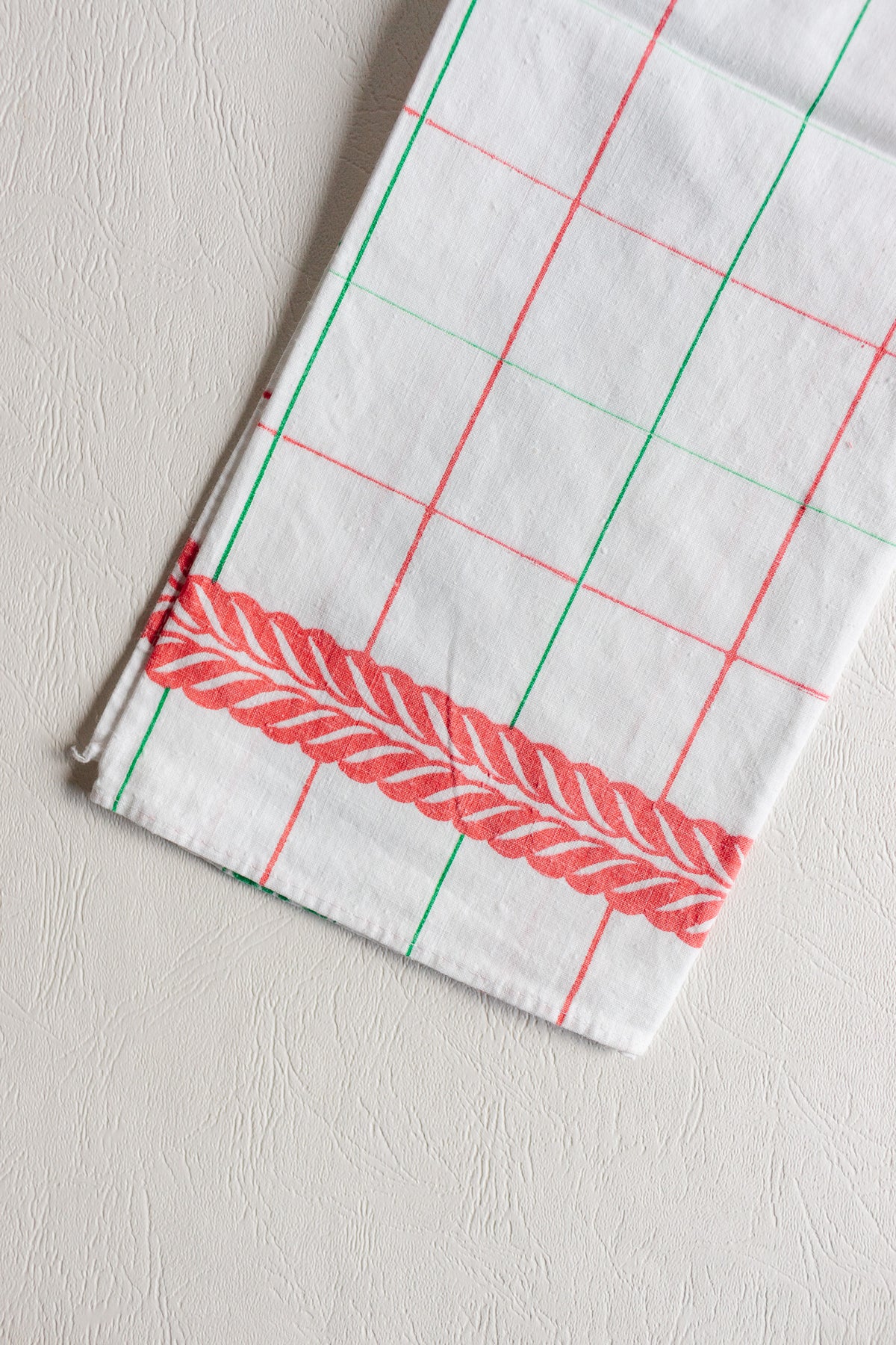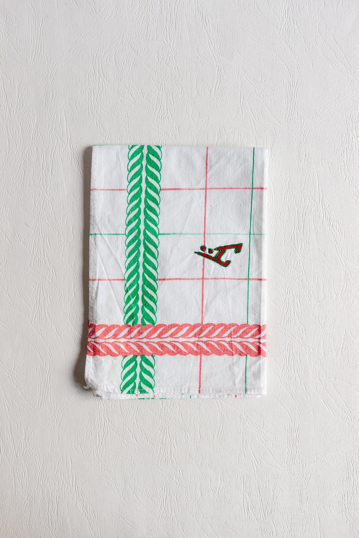 This set of four antique French kitchen torchons features a bold woven pattern in red and green, finished with an embroidered “A” monogram marked with a diaeresis (Ä)—a detail often associated with Alsace and eastern France, where Germanic influence shaped local textiles. Both practical and decorative, they work beautifully folded on open shelving or used daily in the kitchen. Sourced from a brocante in Marseille.