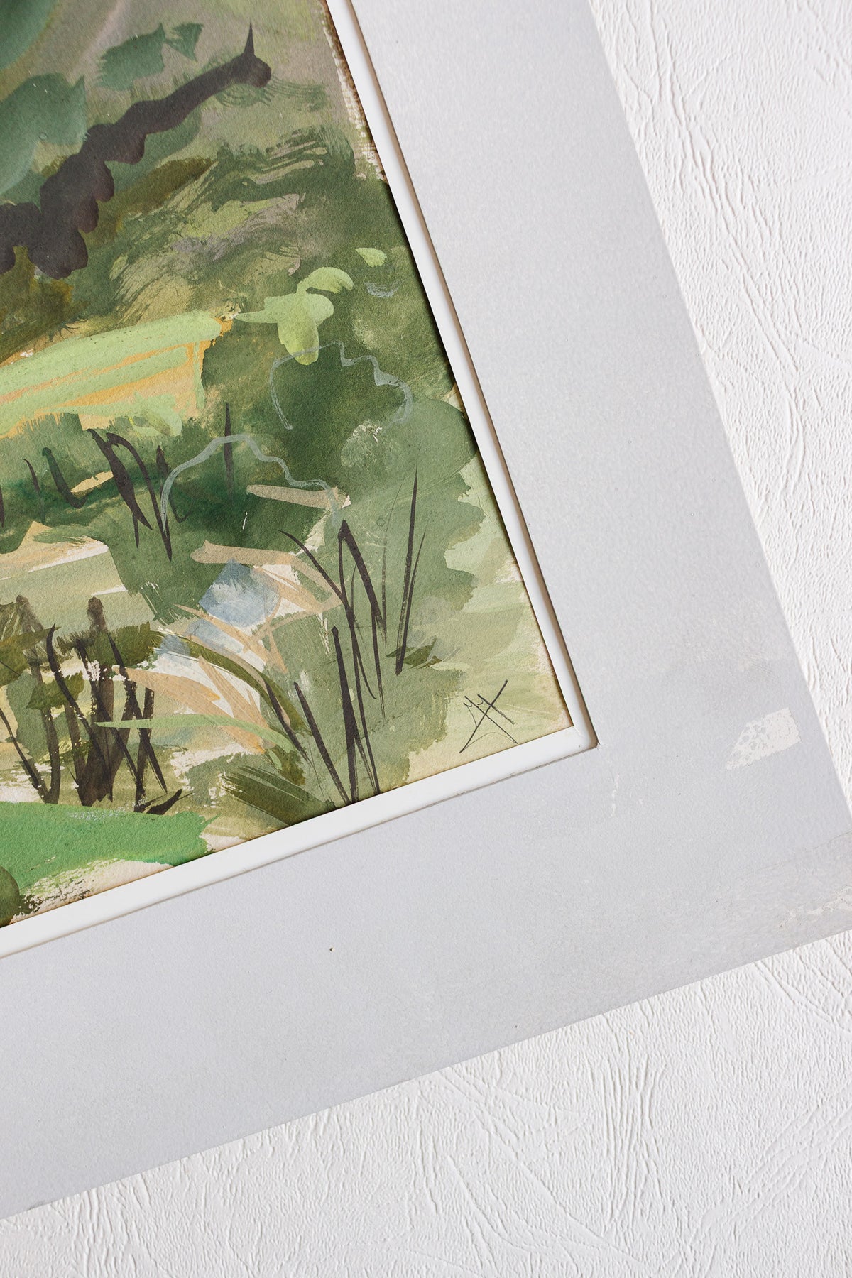 Vintage french watercolour on paper with matting, signed by the artist. This artworks depicts a lush countryside in shades of green. Sourced from a brocante in Marseille.
