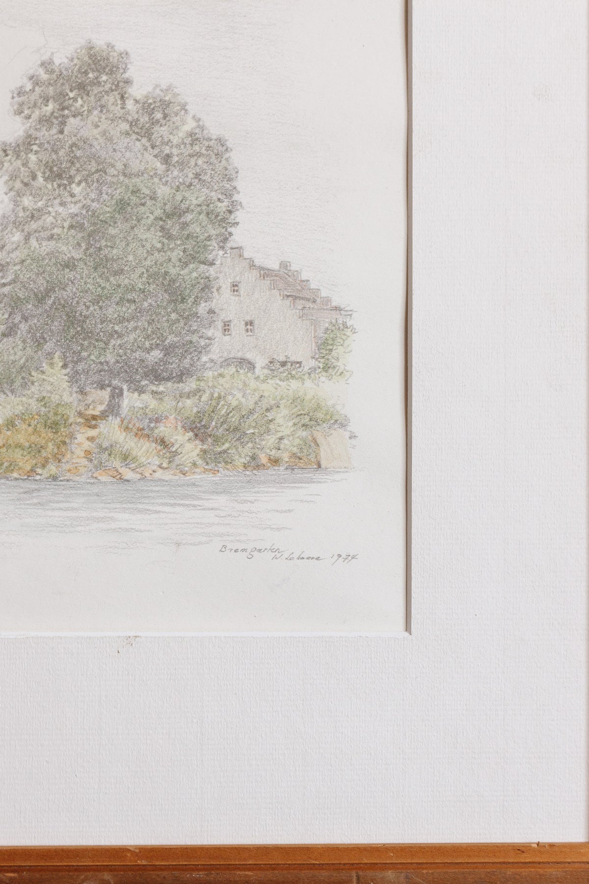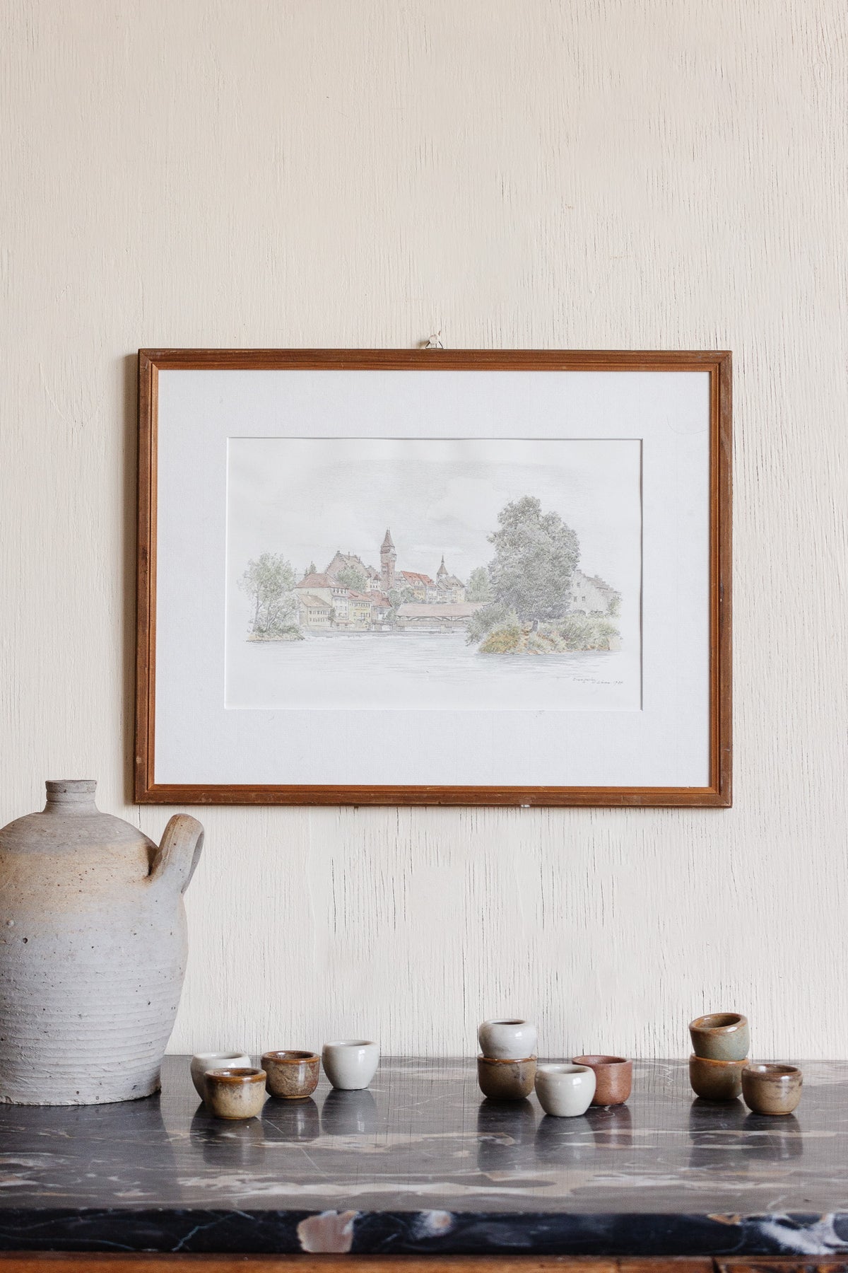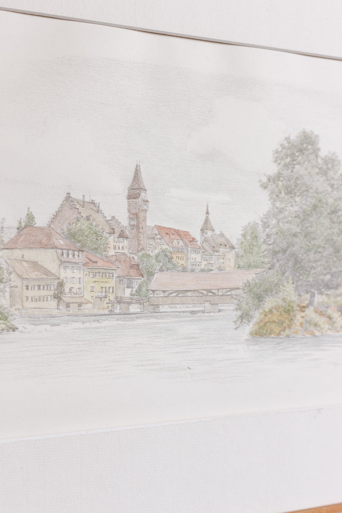 Vintage French sketches artwork of a German landscape. This piece is signed and dated by the artist and beautifully framed but without glass.  Sourced from a brocante in Marseille.