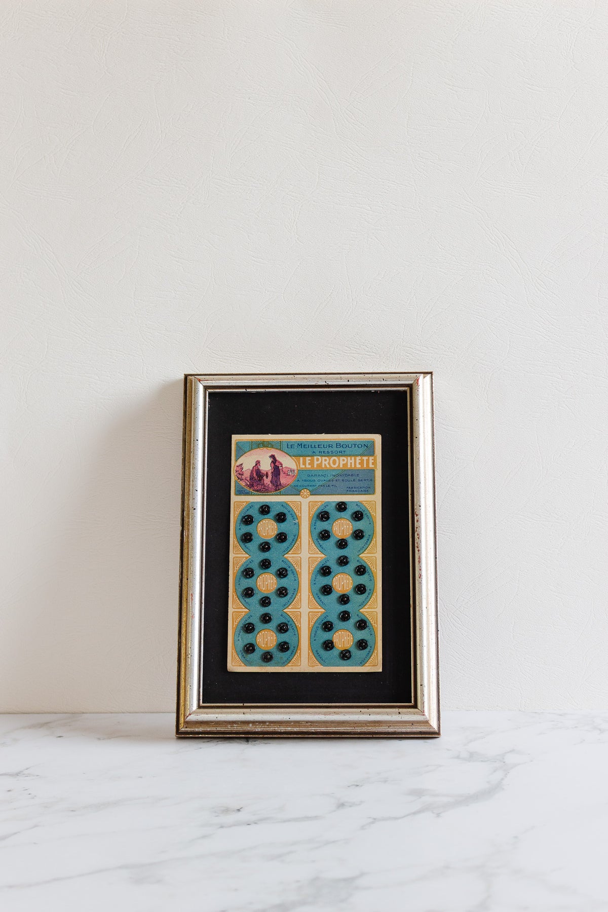 “Le Prophète” 1920s French button card, sourced from a brocante in Barjac and now preserved behind museum-quality glass. Originally printed on thick cardstock with elegant typography, these antique buttons were once utilitarian objects—now elevated to artwork. Framed as a visual archive of early 20th-century French design, it’s a striking piece for collectors of fashion history or graphic ephemera.