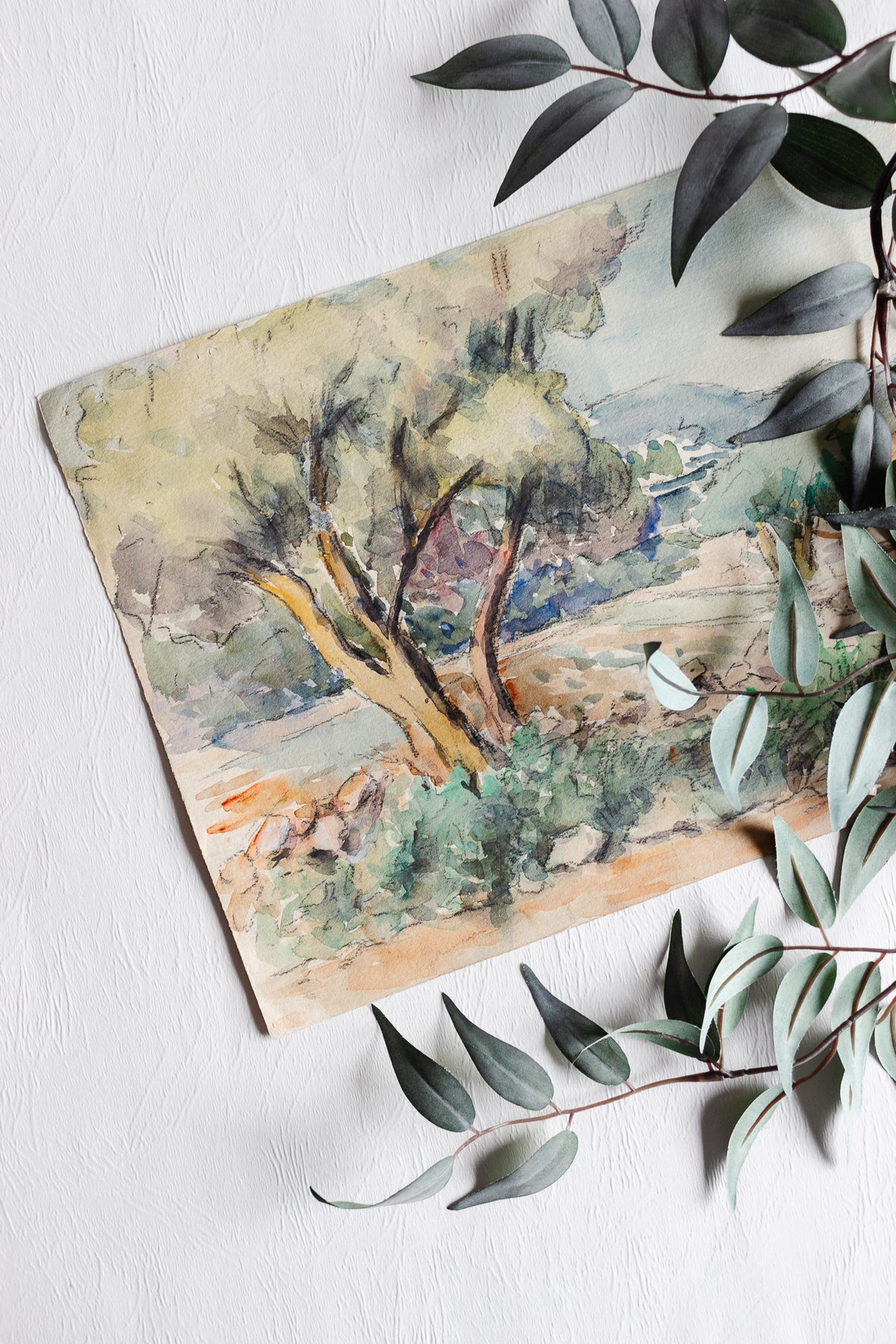 A serene vintage french watercolor on thick paper and dreamy colors of a quaint French landscape. Sourced from a brocante in Marseille.
