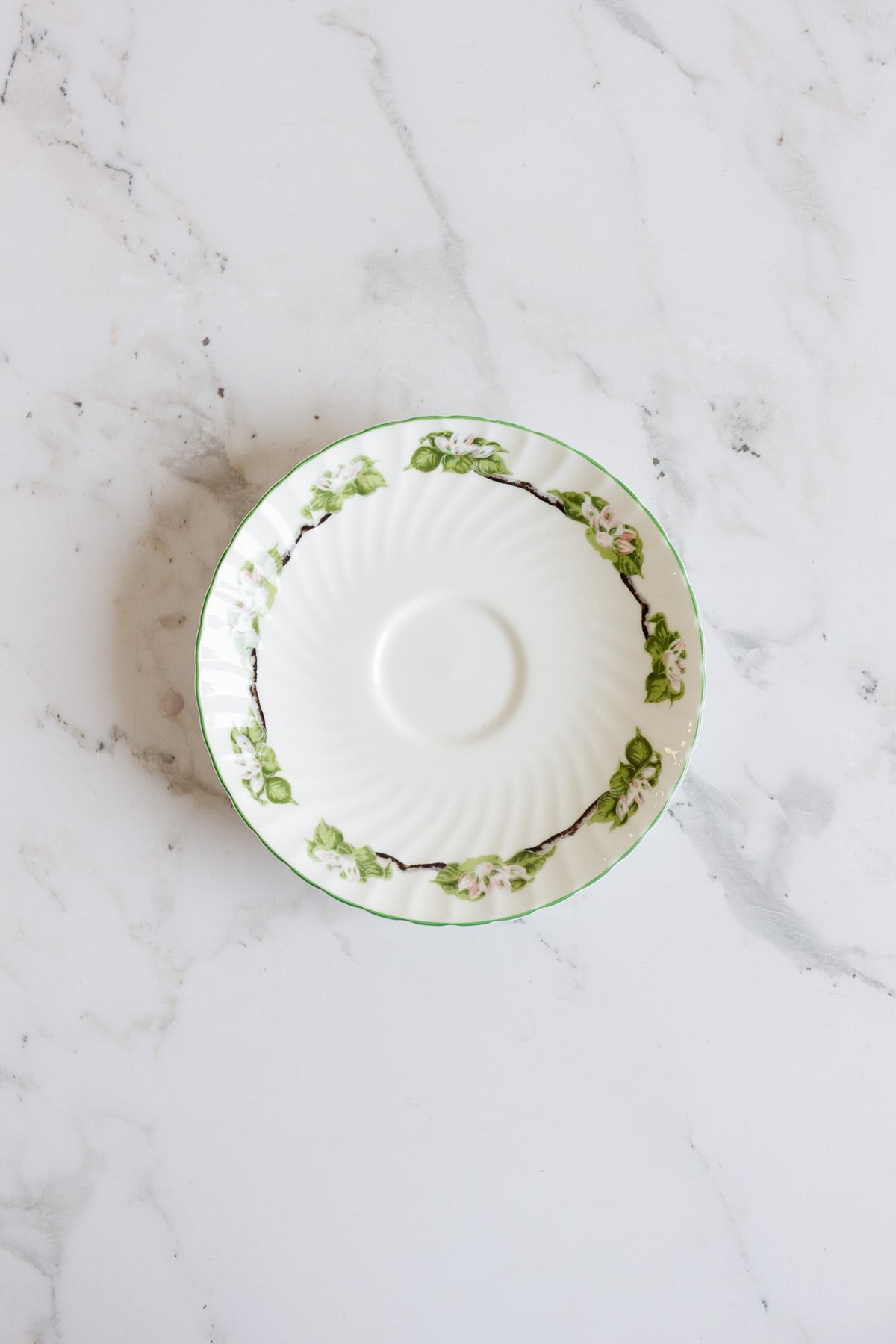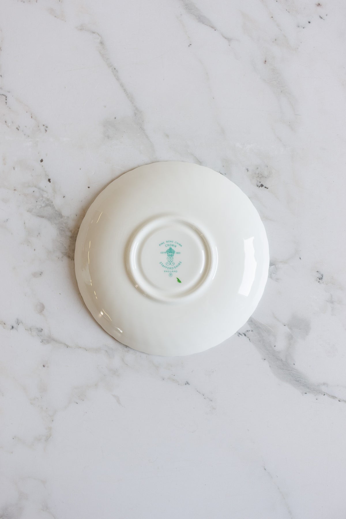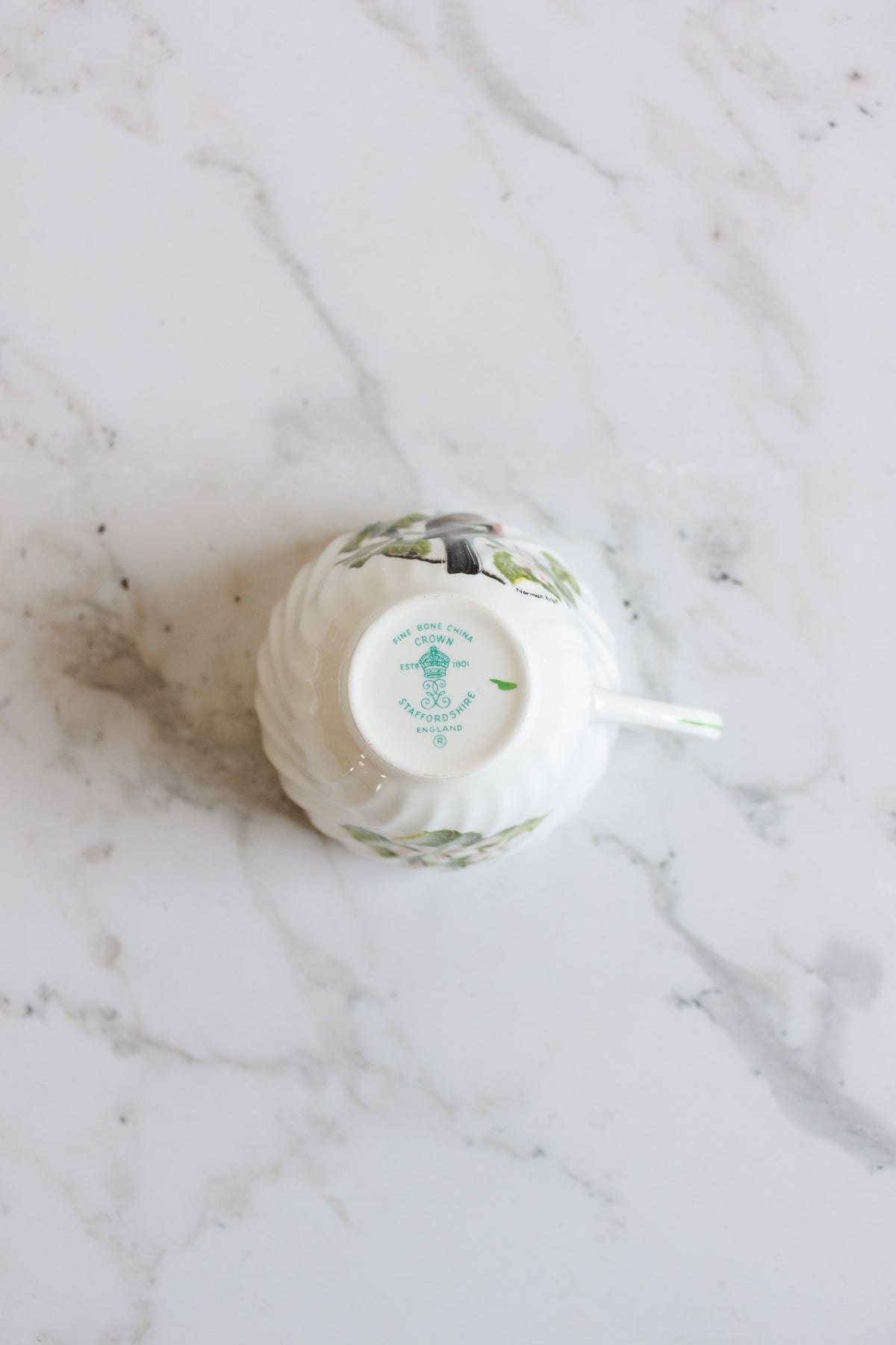 A fine bone china teacup and saucer set by Crown Staffordshire, decorated with a detailed bird motif. The smooth porcelain and careful illustration reflect the precision of English production. Whether placed on a table or within a collection, it stands out as a distinctive piece of mid-century design.