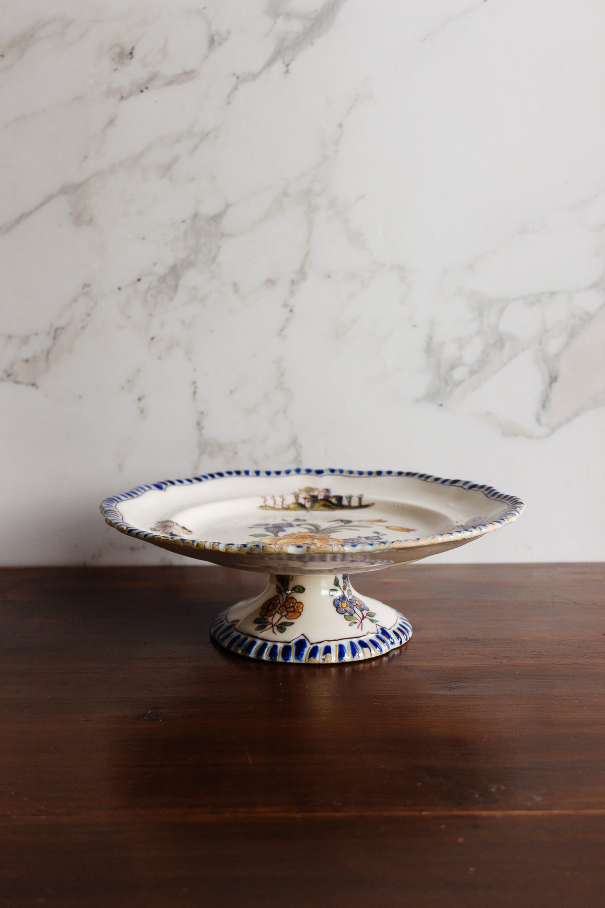 This late 19th–early 20th century French compotier features a tall pedestal form with a softly scalloped rim and finely hand-painted floral decoration in a restrained palette of blues, yellows, and greens. Signed by the decorator on the underside, it reflects the Belle Époque taste for balanced, naturalistic motifs. Sourced from a brocante in Carpentras.