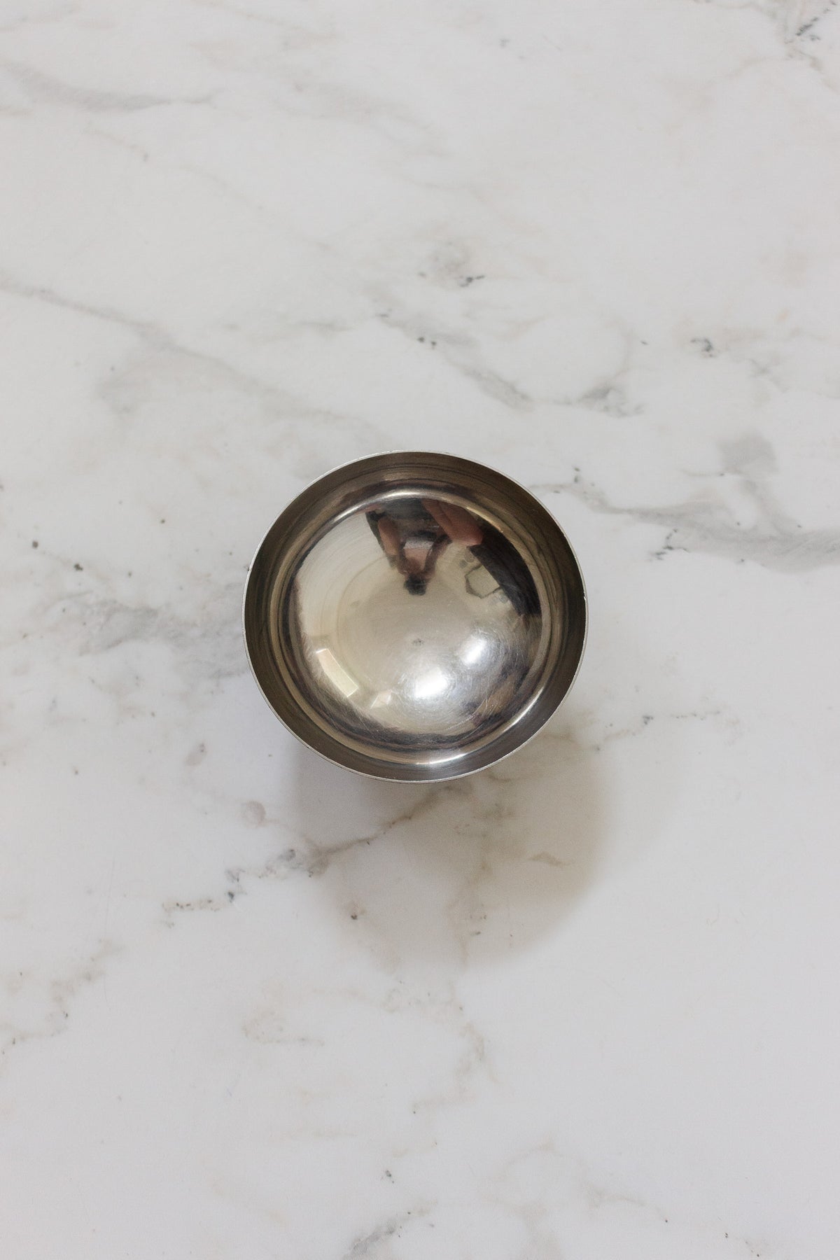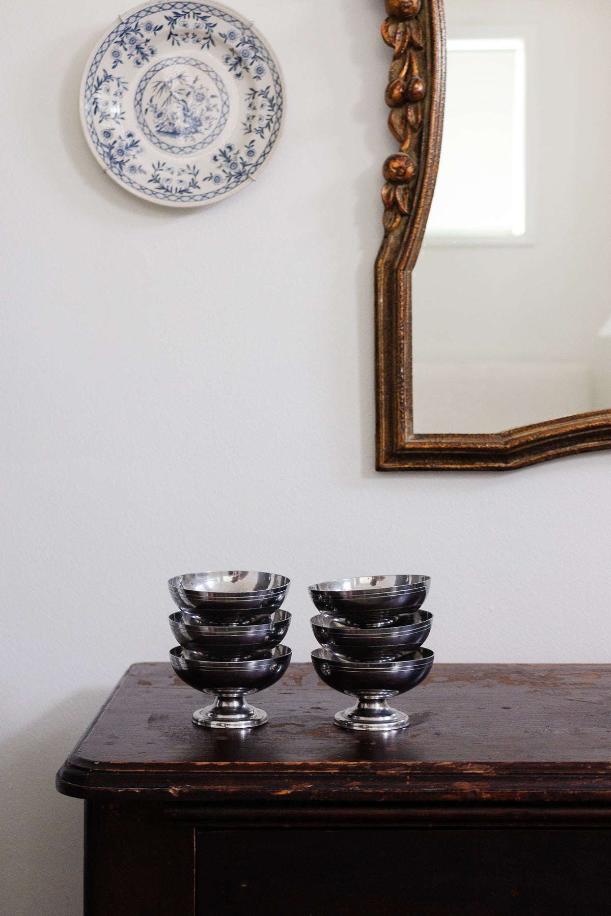 Set of 6 vintage French stainless steel ice cream cups with classic pedestal bases, sourced from a brocante in Marseille. Sleek and timeless, these cups are perfect for serving sorbet, gelato, or fruit, with their reflective finish and weighty feel adding a touch of vintage charm. A versatile summer staple for any table or picnic spread.
