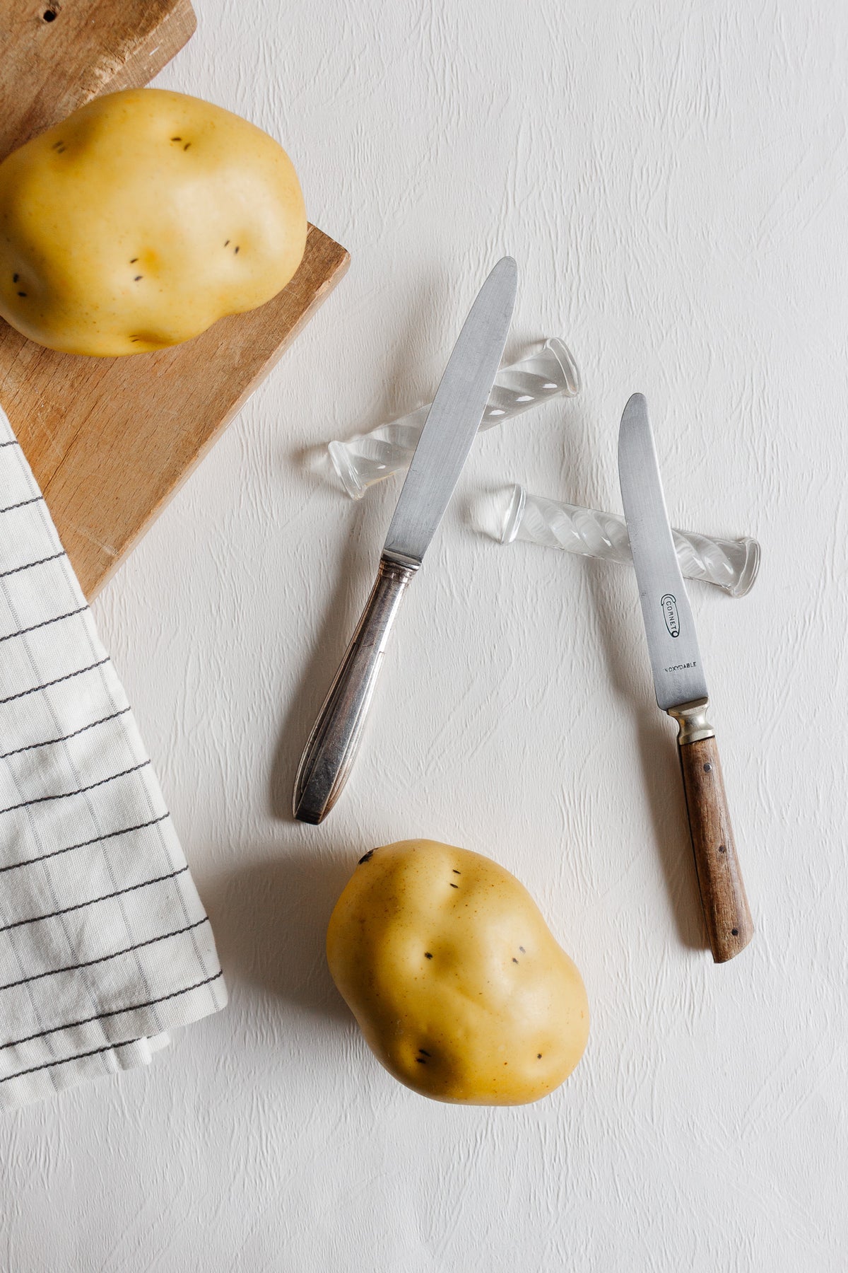 This set of 12 vintage French cristal torsodé knife rests features twisted clear crystal rods designed to keep cutlery elevated from the table between courses. Elegant yet understated, they catch the light beautifully and add a refined finishing touch to a formal place setting. The set is presented in its original box, making it ideal for entertaining, collecting, or gifting. Sourced from a brocante in Marseille and comes in their original box.