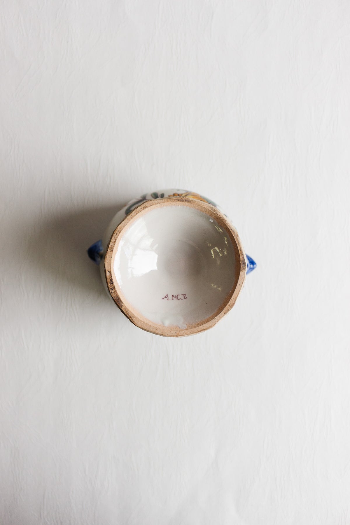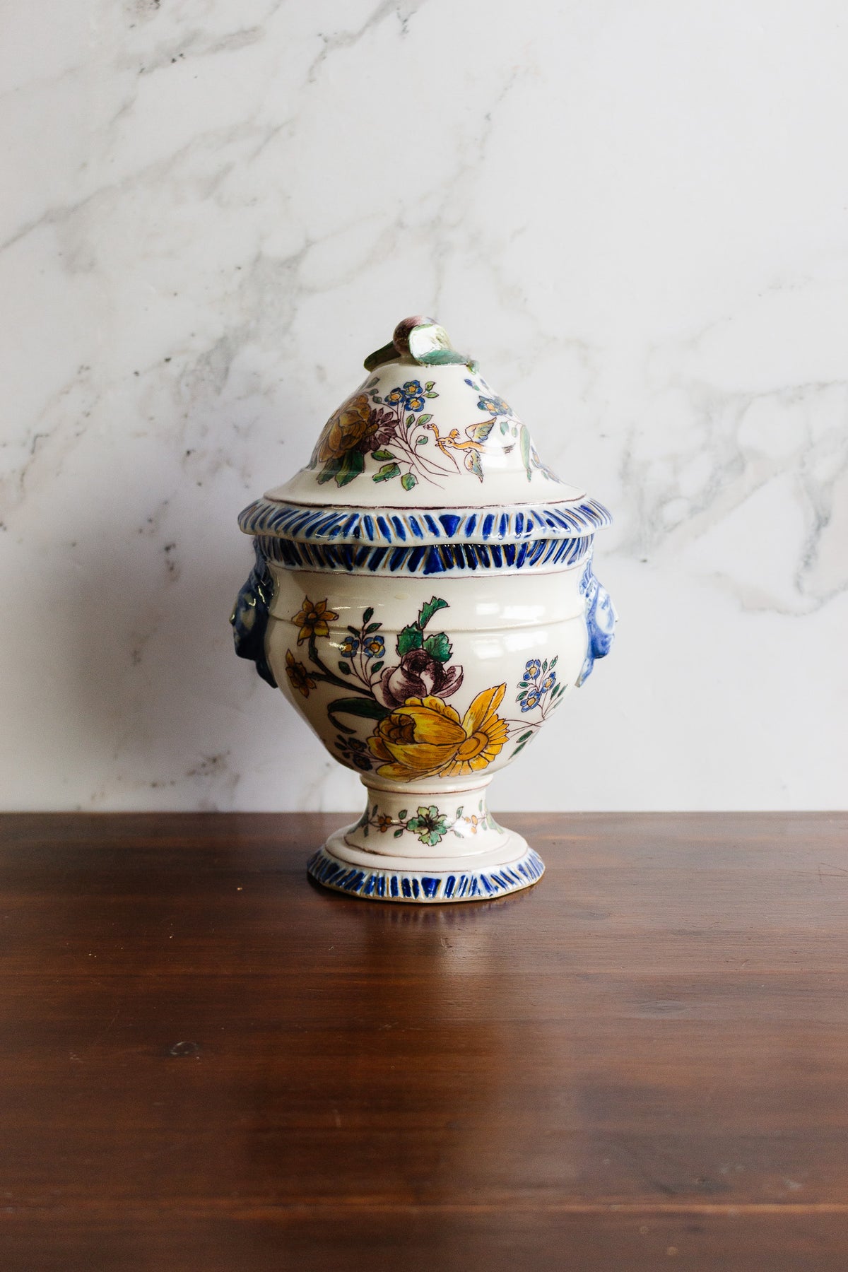 This late 19th–early 20th century French soupière features a tall, slim profile with a softly scalloped rim and finely hand-painted floral decoration in a restrained palette of blues, yellows, and greens. Signed by the decorator on the underside, it reflects the Belle Époque taste for balanced, naturalistic motifs. Sourced from a brocante in Carpentras.