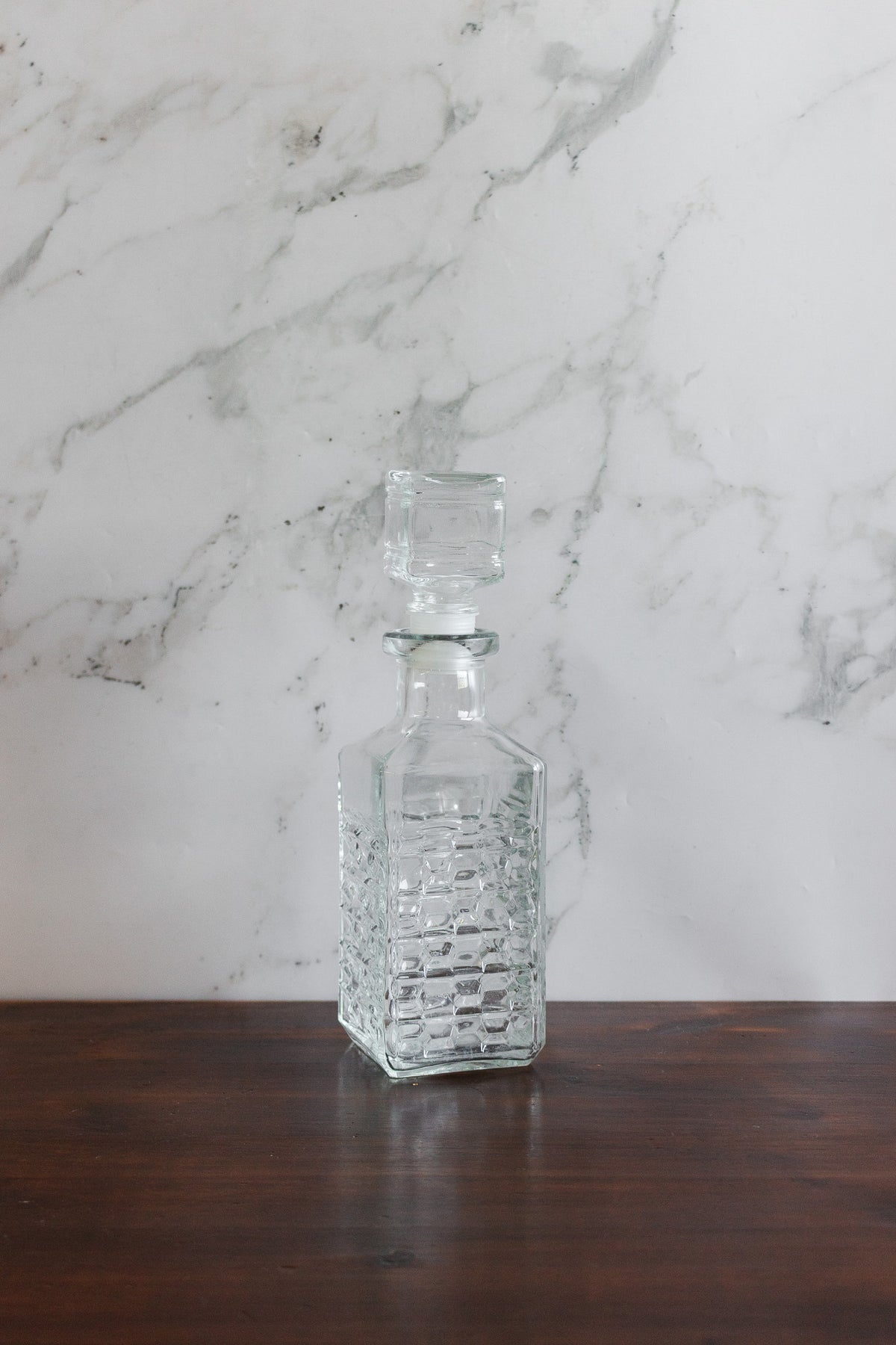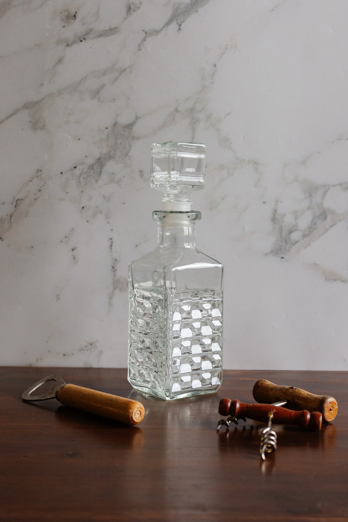 A vintage French cut glass decanter, sourced from a brocante in Marseille, featuring crisp faceting that catches and reflects the light beautifully. This petite version features a balanced silhouette and weighty feel speak to its quality, while subtle signs of age add depth and character.