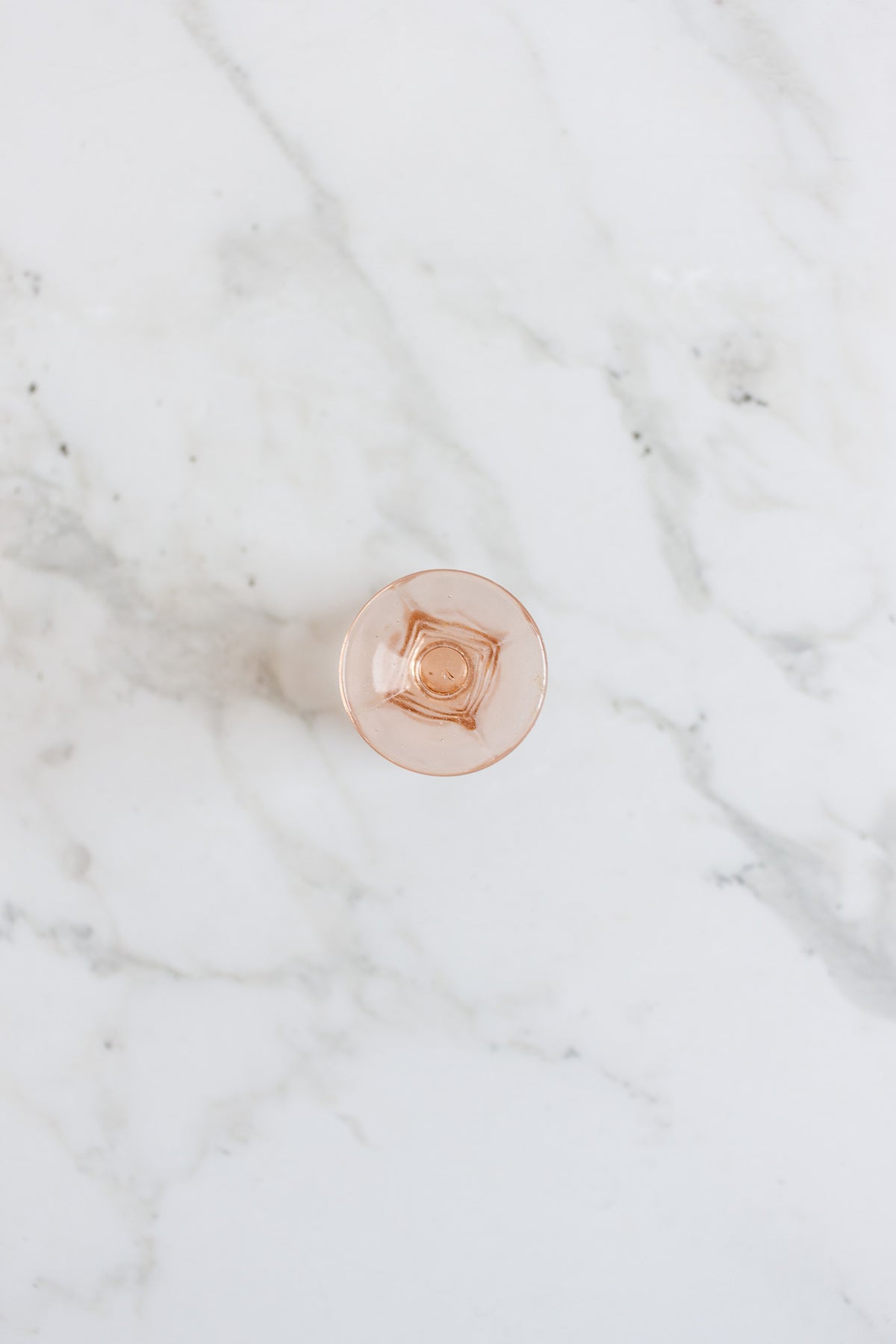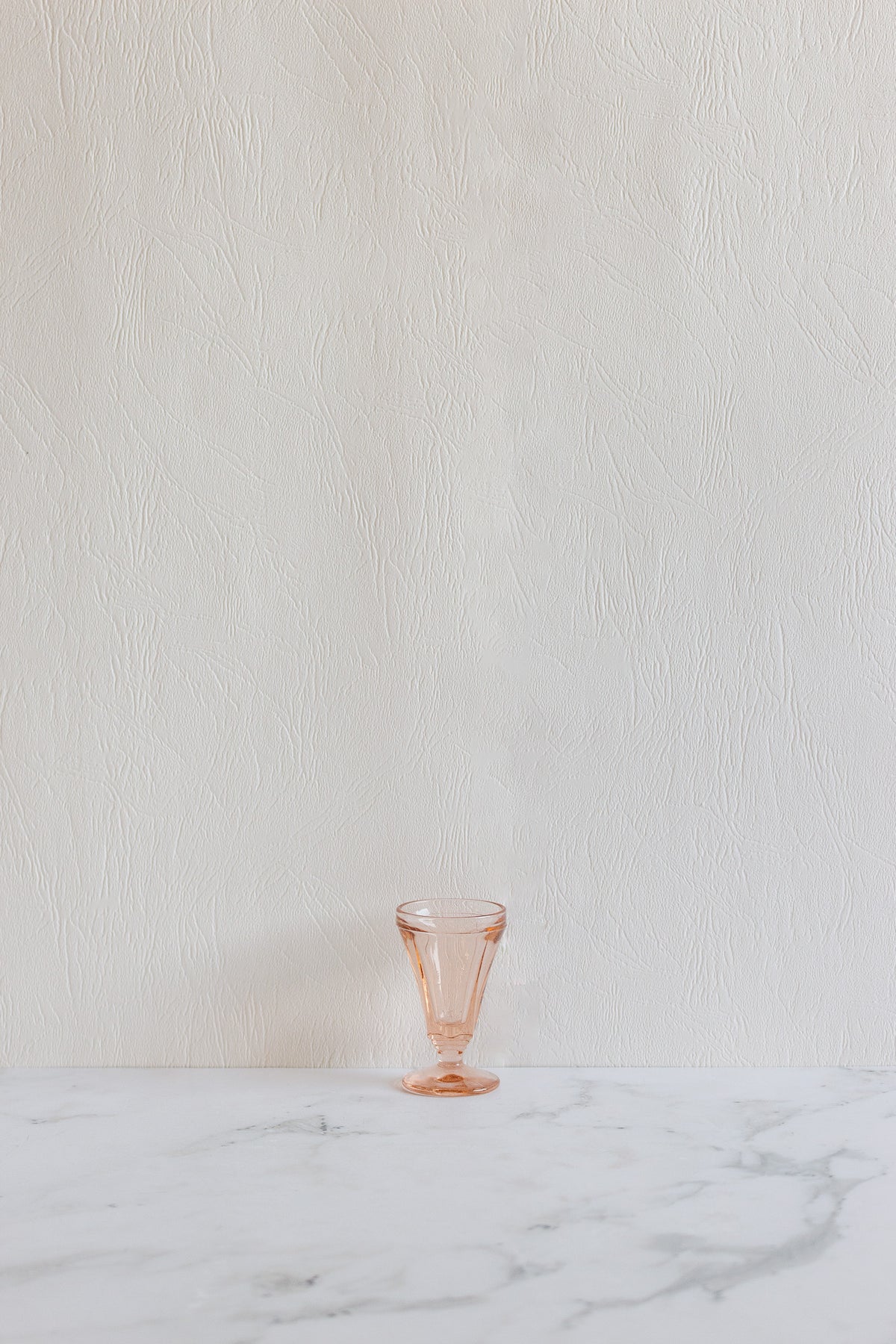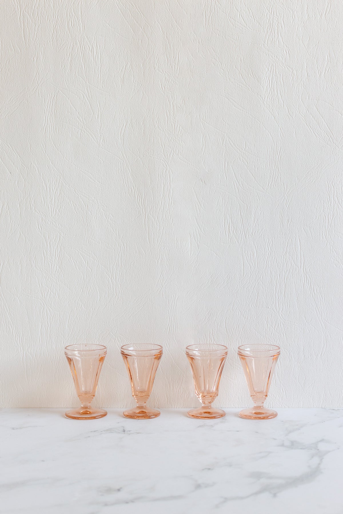 A delicate set of four liqueur glasses, footed and awash in soft pink glass, sourced from a brocante in Marseille. Small in scale but rich in character, they lend a whisper of colour to any display—perfect perched on a tray, clustered on a bar cart, or tucked into a glass-fronted cabinet.