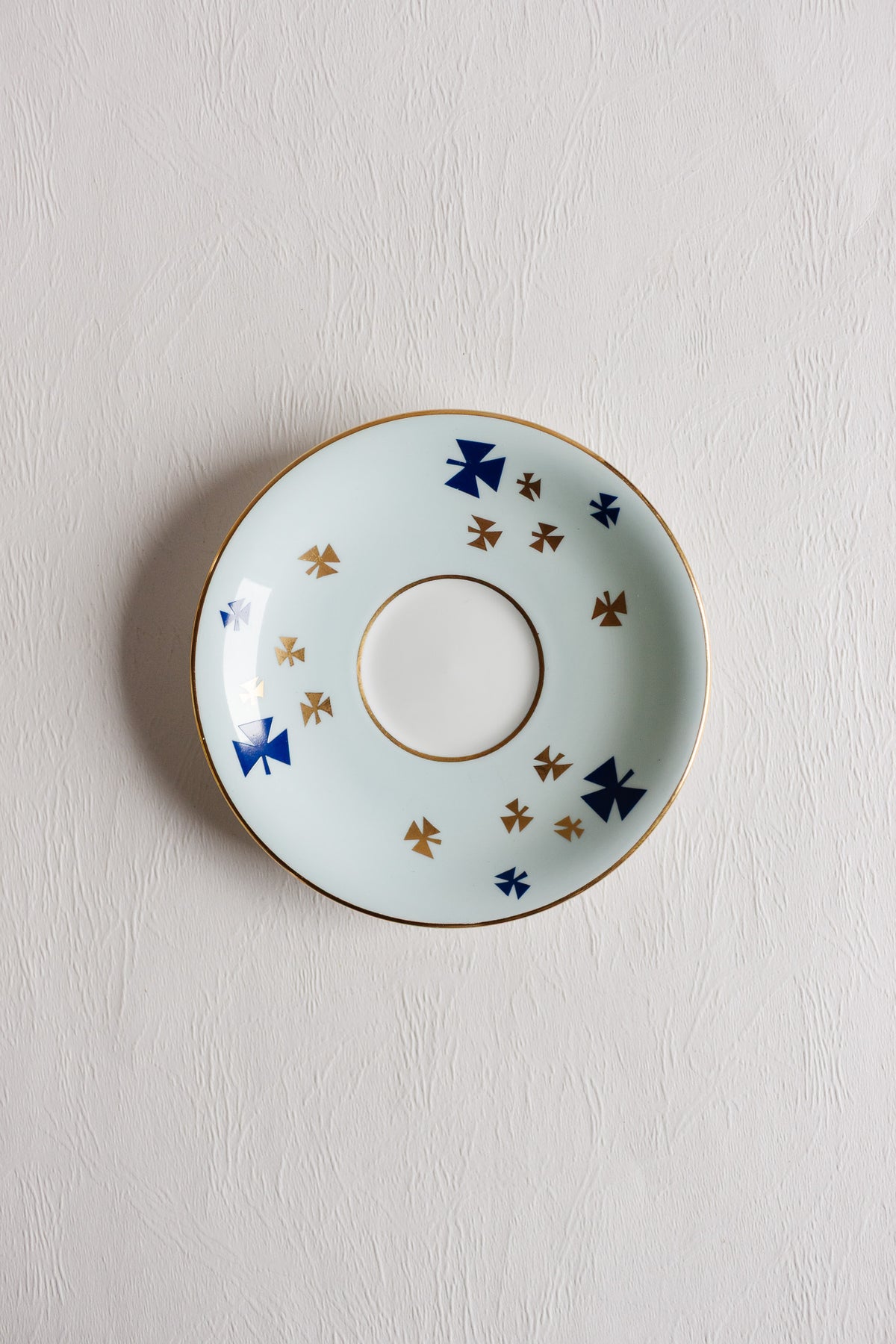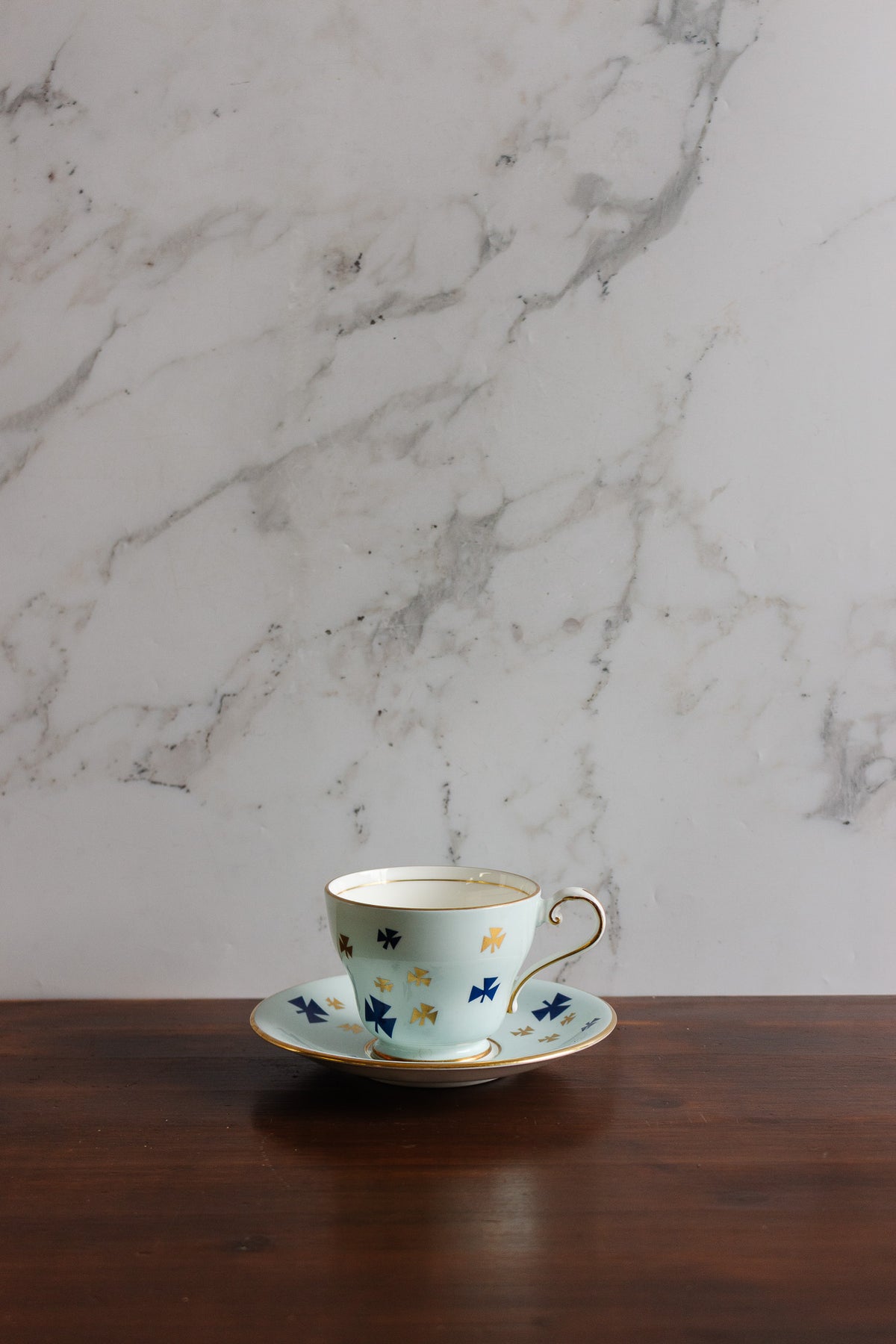 This vintage Aynsley Girl Guide teacup and saucer features a soft pale blue ground decorated with stylized Guiding trefoil crosses in navy and gold, finished with a delicate gilt rim and handle. Both decorative and functional, it works beautifully for afternoon tea, display in a cabinet, or as a thoughtful collectible tied to Girl Guide history. A charming example of mid-20th-century English porcelain with a crisp graphic motif and refined proportions.