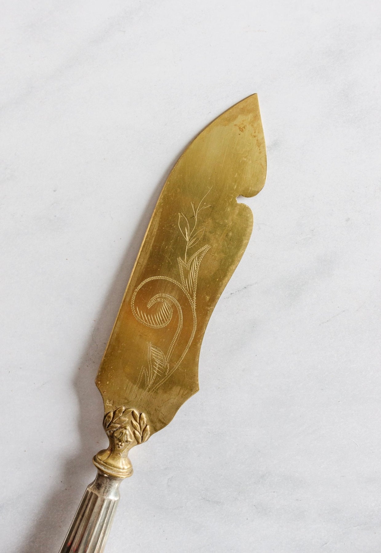 A one of a kind cake server with silver plate handle and gold vermeil blade. Featuring art nouveau etching on the blade, laurel leaf detail on the base of the blade and silversmith hallmark stamps.