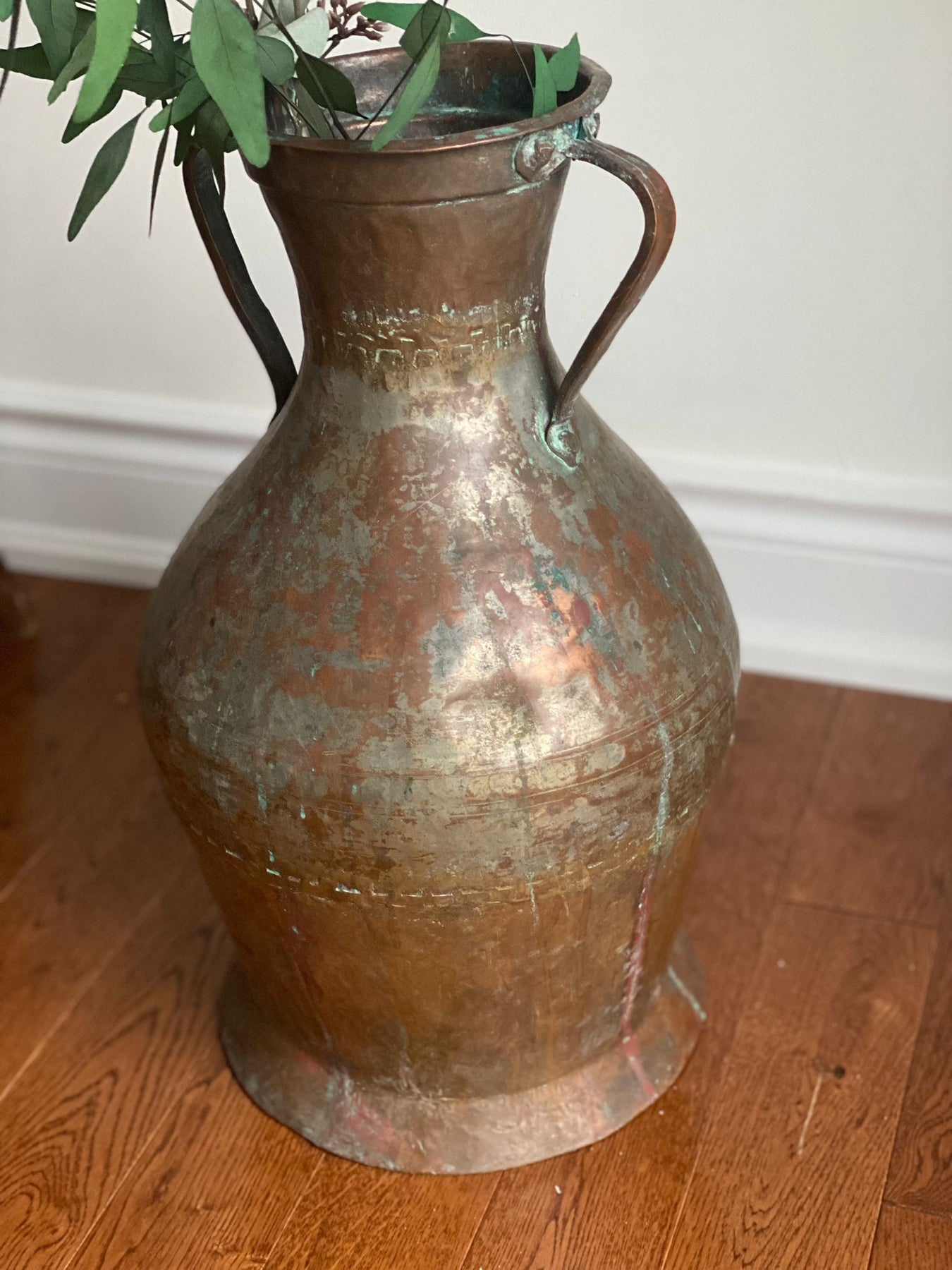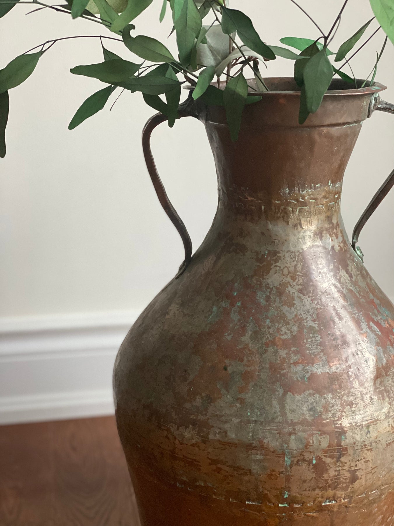 This antique french copper vessel has so much to love: the generous size, the time worn patina, hints of verdigris, and visible seams where the metal was pieced together. We found this piece at a farmhouse in Marseille where it was used decoratively with foraged branches.