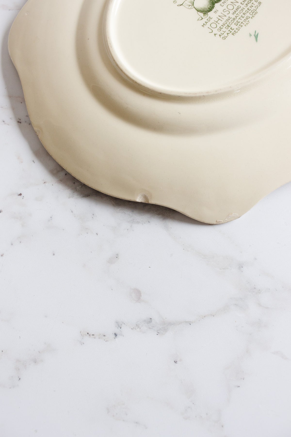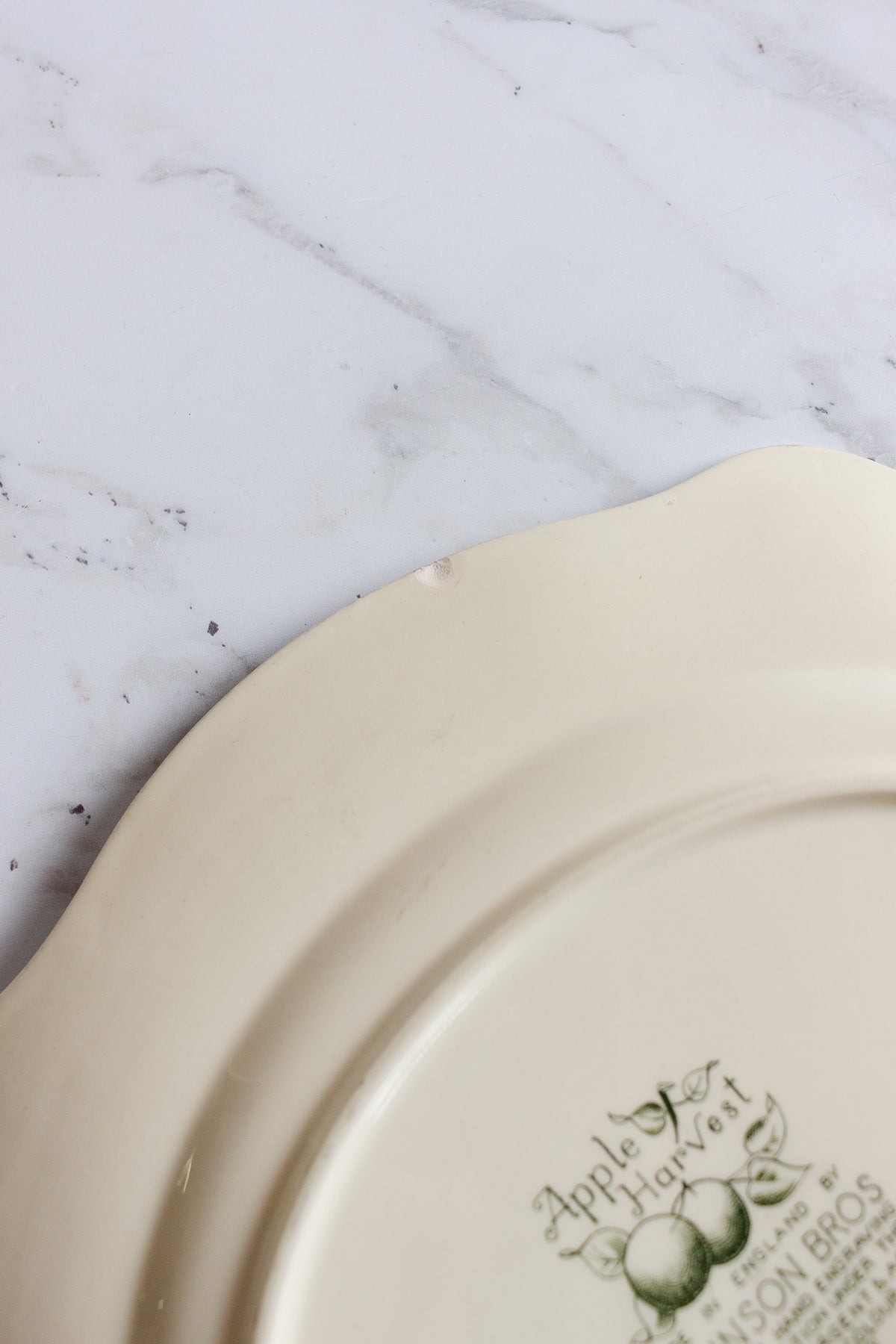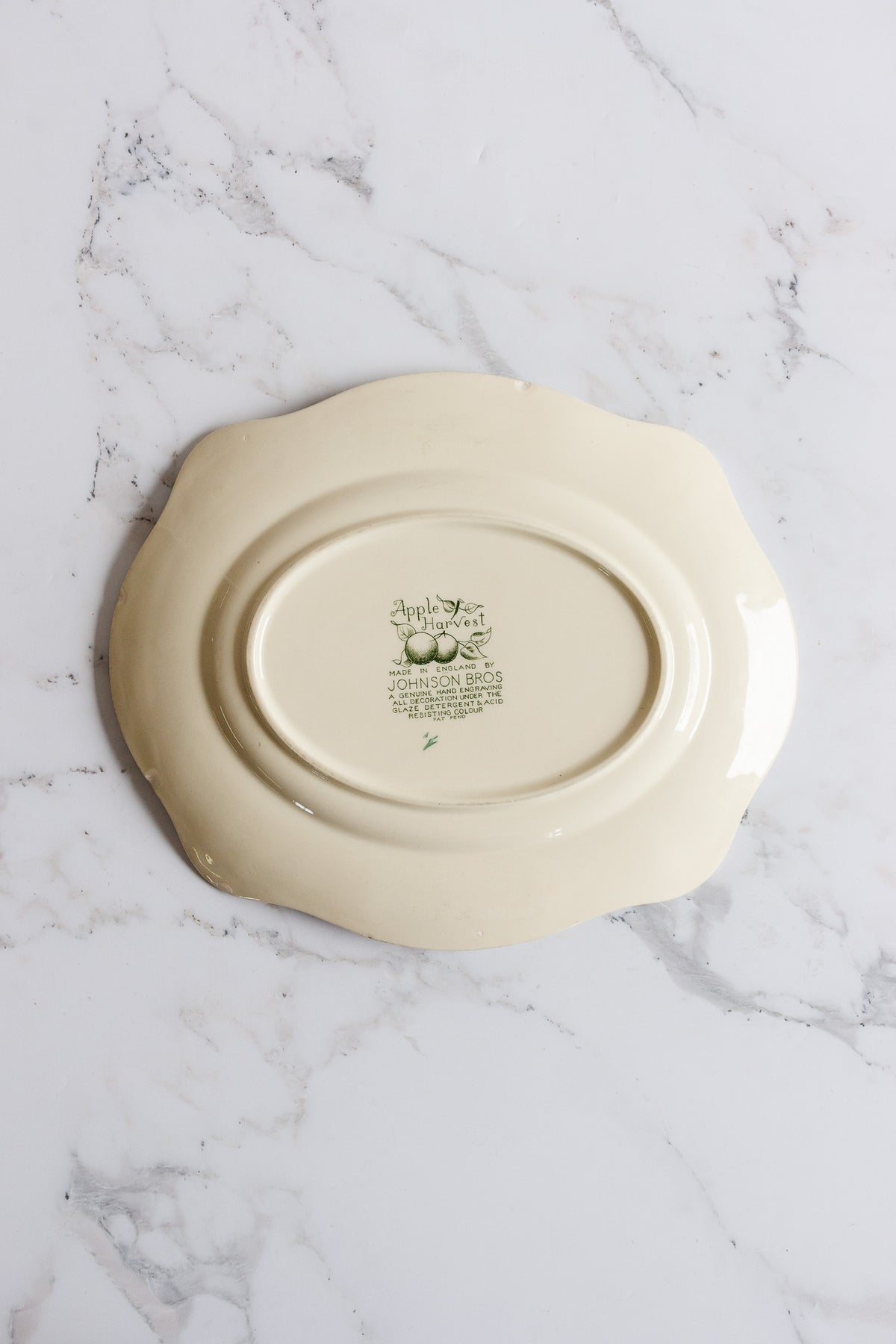 The Johnson Brothers "Apple Harvest" platter, made in England in the mid-20th century, features a hand-painted design of ripe red apples and green leaves on a lightly speckled background. With its rustic charm and durable earthenware construction, it's perfect for both everyday use and display. Collectors love its generous size and nostalgic appeal.
