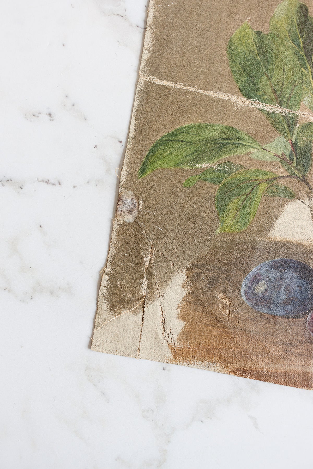 This pair of antique French artworks on loose, unframed canvas shows timeworn charm with visible wear, soft fading, and gentle folds. Their muted tones and delicate subject matter make them perfect candidates for framing and hanging in a bedroom. Sourced from a brocante in Marseille.