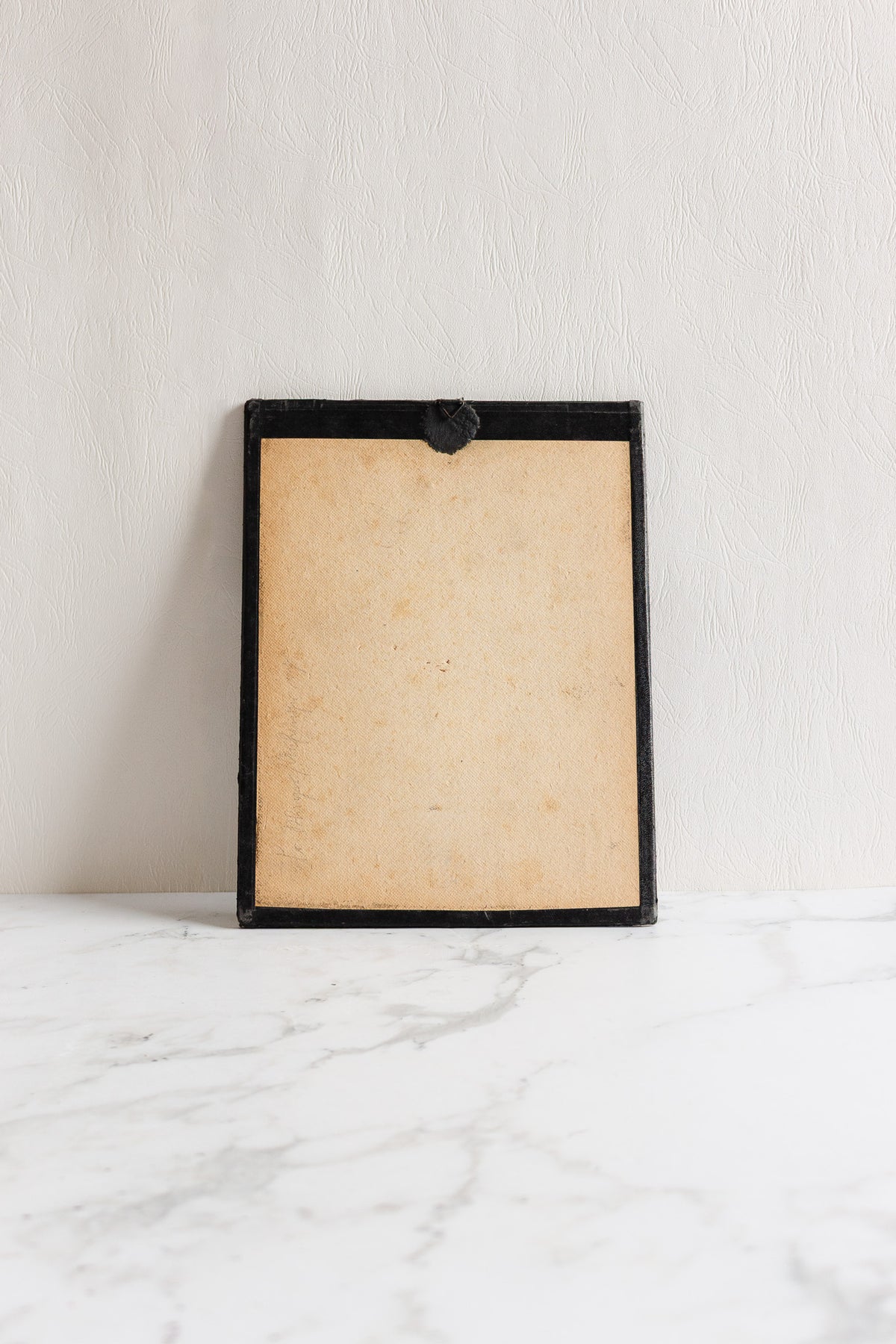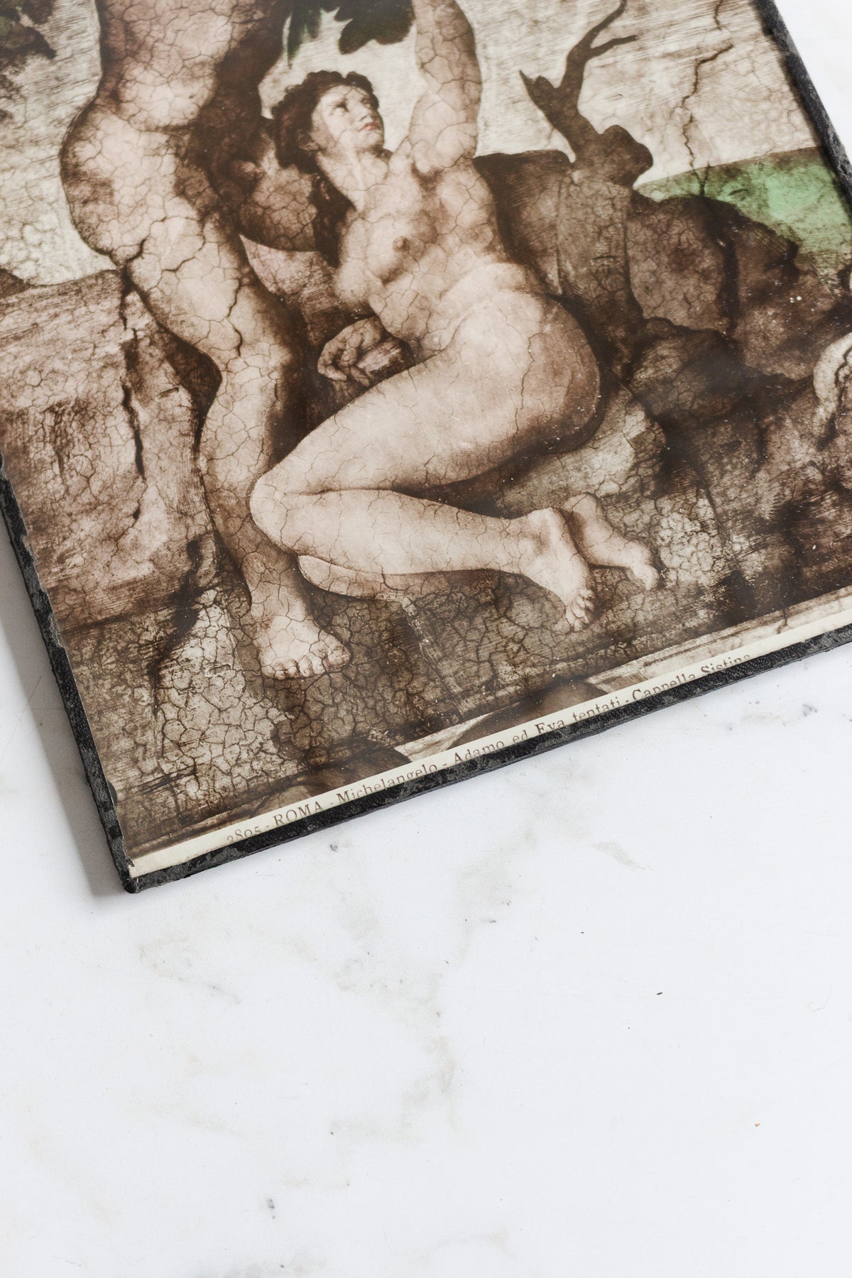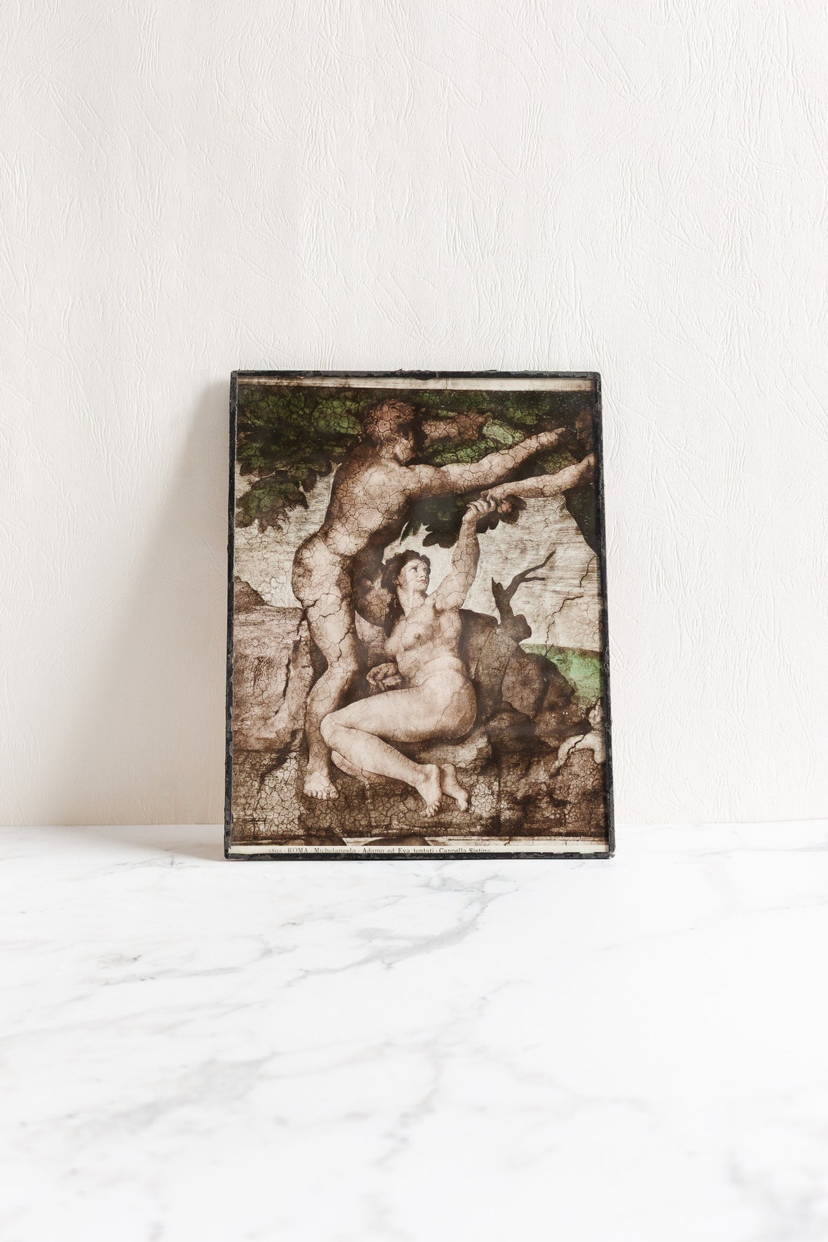 An antique print inspired by Michelangelo’s iconic Sistine Chapel fresco, capturing the pivotal Genesis moment in which innocence is lost and Adam and Eve are driven from paradise. The composition mirrors the original: the serpent with a human torso coils around the Tree of Knowledge, Eve reaches for the forbidden fruit, and an angel commands the couple into exile. Titled in Italian “Adamo ed Eva – Tendentri Cappella Sistina”. Sourced from a brocante in Marseille.  Print is behind glass.