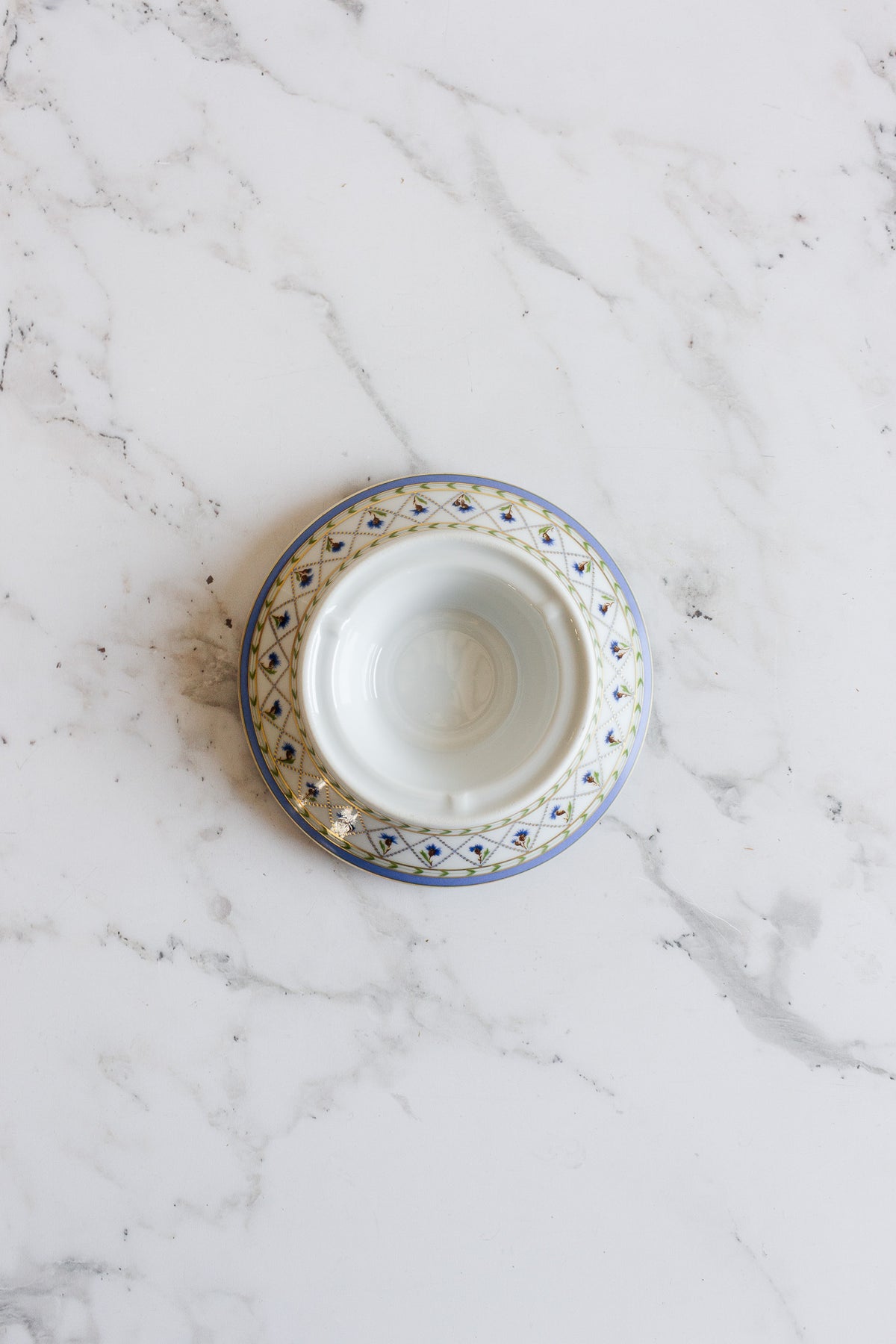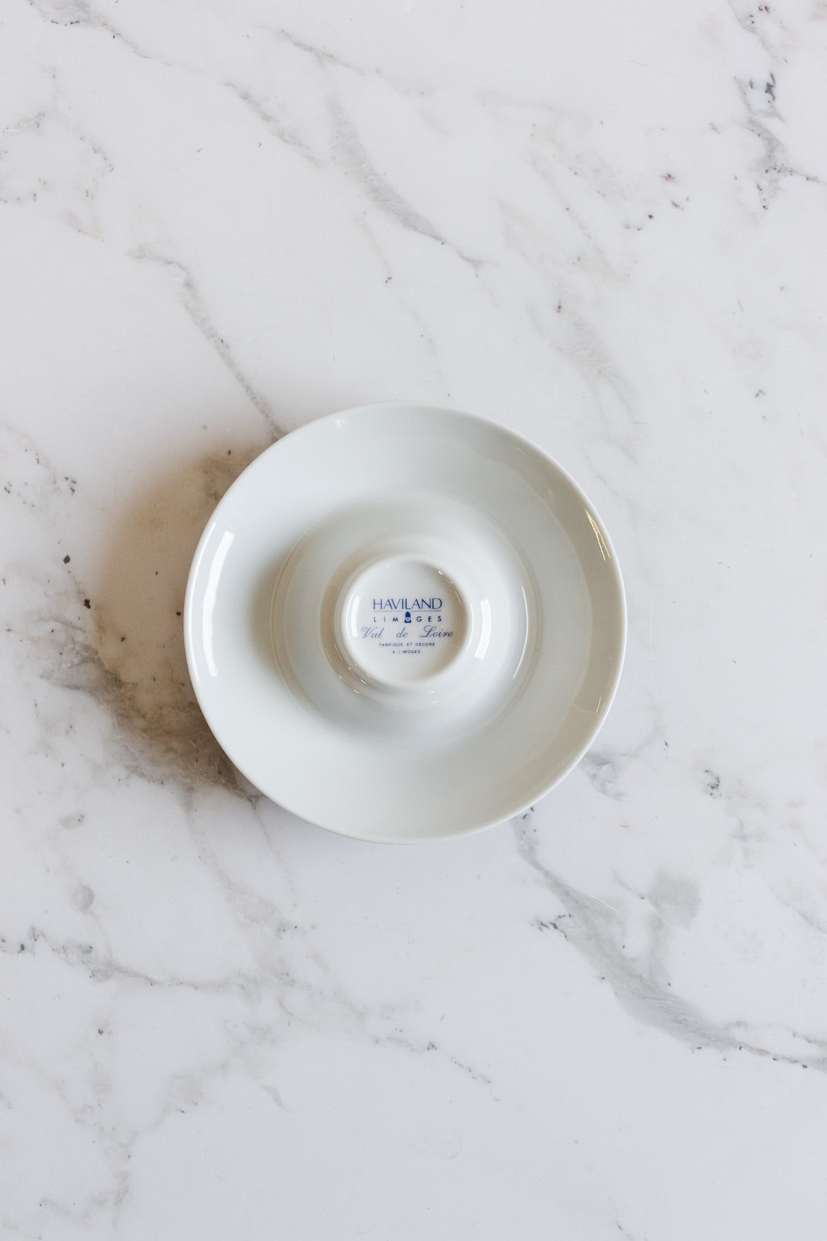 Vintage Val de l'Or Limoges porcelain ashtray with a circular form and an ornate, raised border. Originally designed for smoking accessories, it now serves beautifully as a catchall for jewelry or small trinkets. Sourced from a brocante in Marseille.