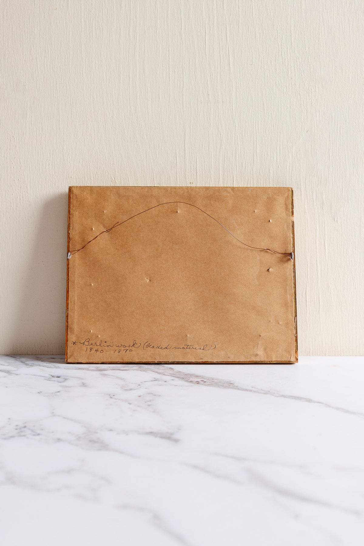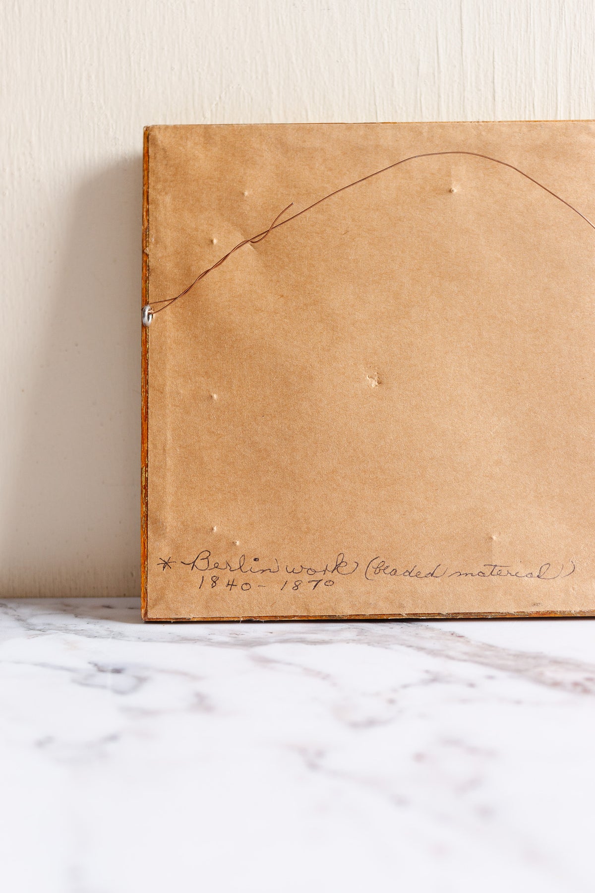 Featuring a gorgeous central tapestry floral image, surrounded and accented by glass beads, this stunning fragment is housed in its original gilt wood frame under glass, with the reverse backing recently refinished.