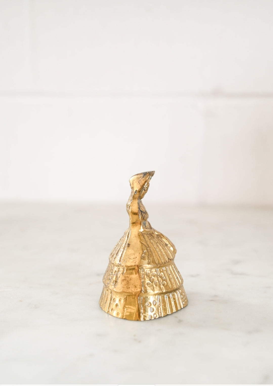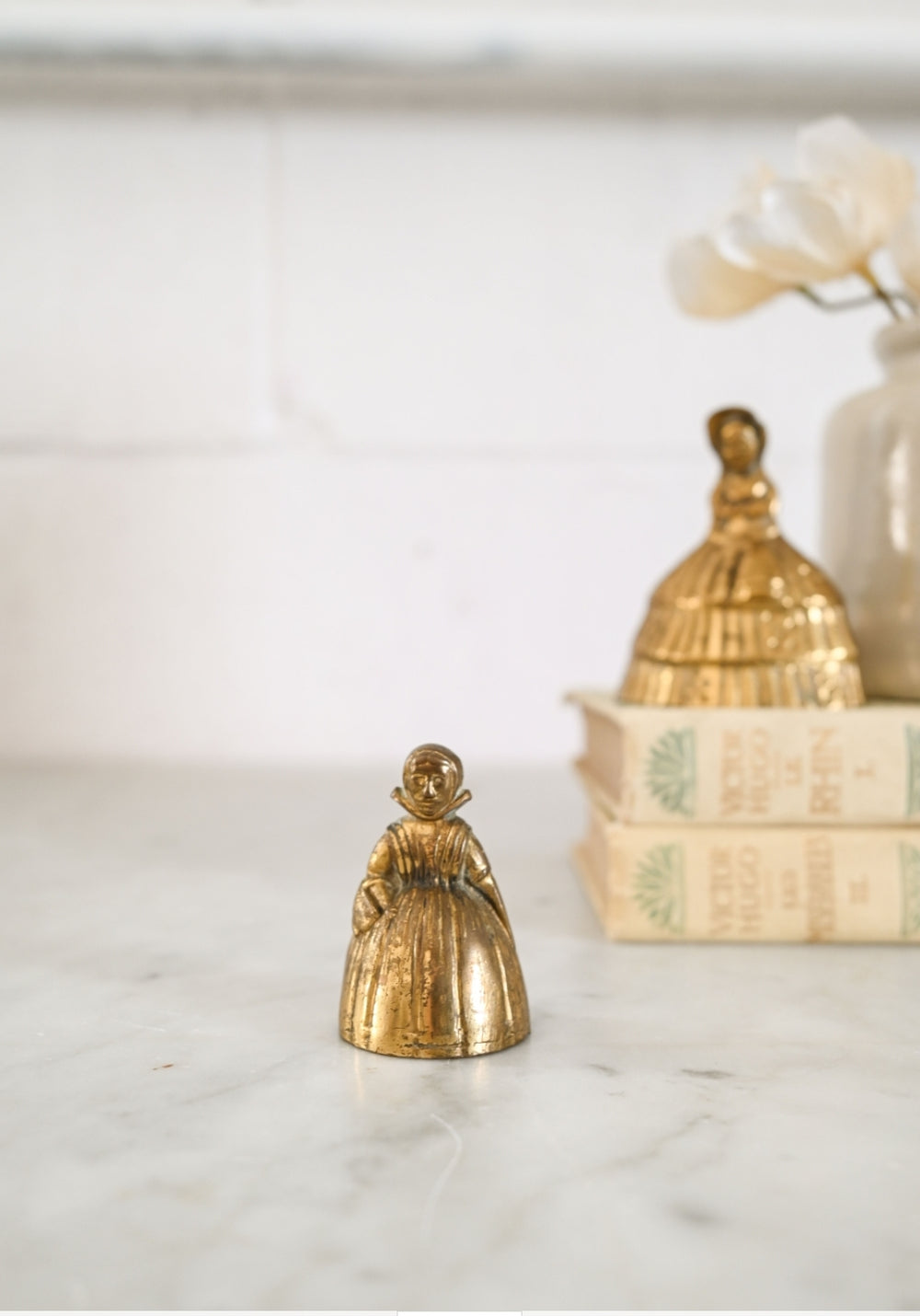A pair of sweet 1940s brass bell ladies. These carved solid brass ladies are bells! Stamped made in England on the underside.