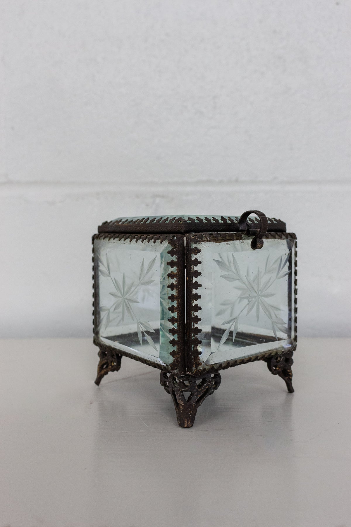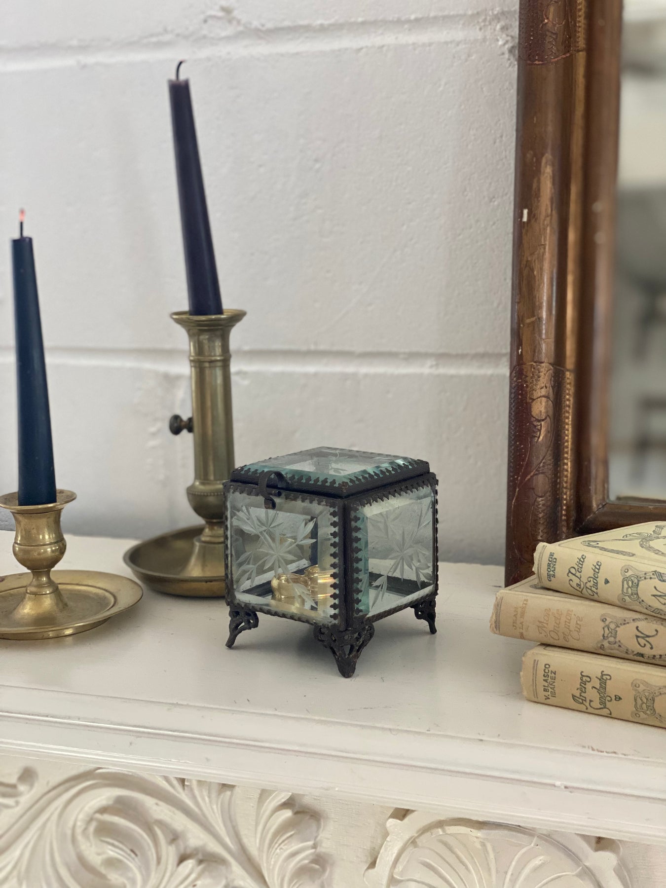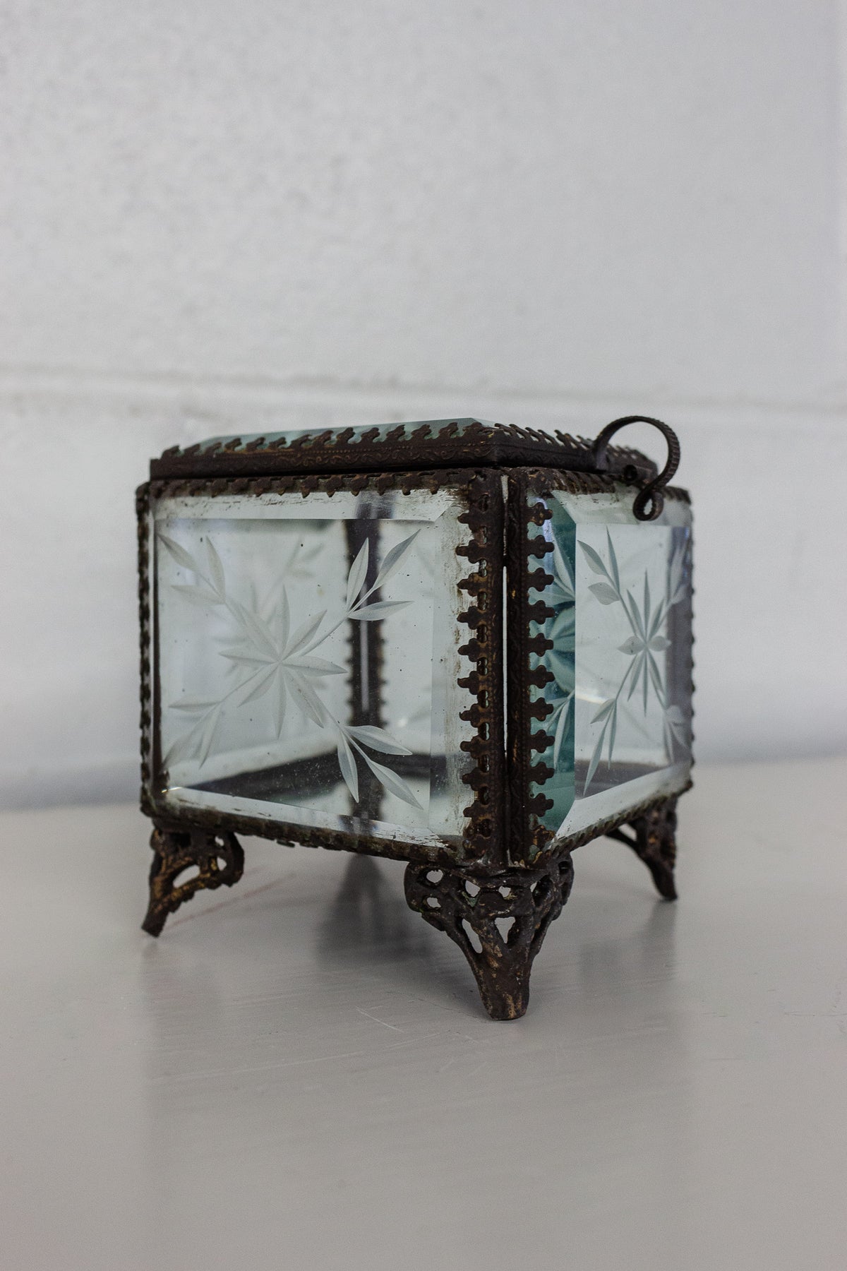 These turn of the century bijoux caskets are truly heirloom pieces, with their thick beveled glass and stamped ormolu details. This piece in particular is larger than most bijoux caskets we’ve found, and has an incredible etched design in the glass that we’ve rarely seen before.