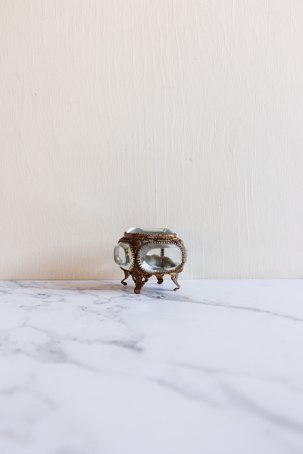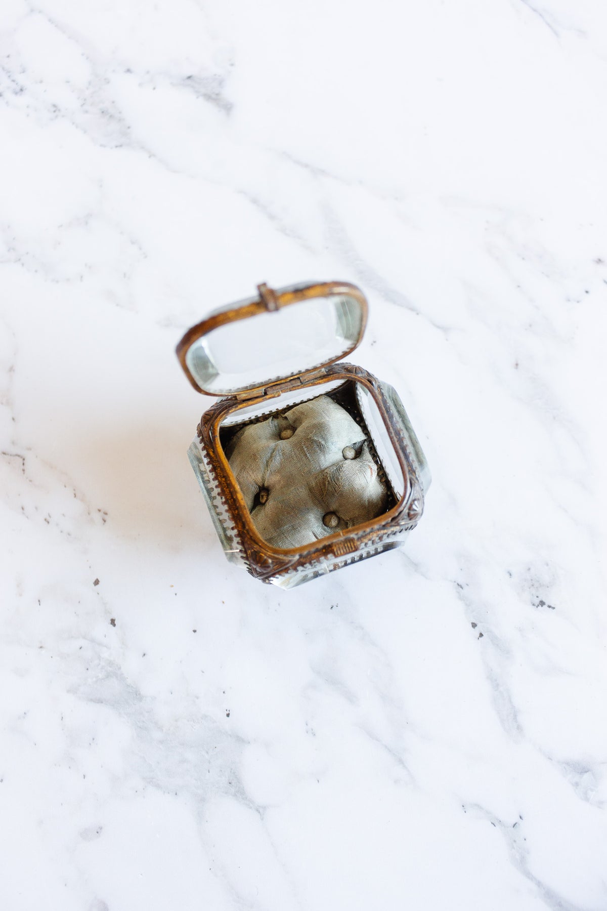 These turn of the century bijoux caskets are truly heirloom pieces, with their incredible craftsmanship, thick beveled glass and brass details. This piece features an original tufted fabric cushion base in a beautiful baby blue —it’s difficult to find the fabric of these cushions in such good condition!