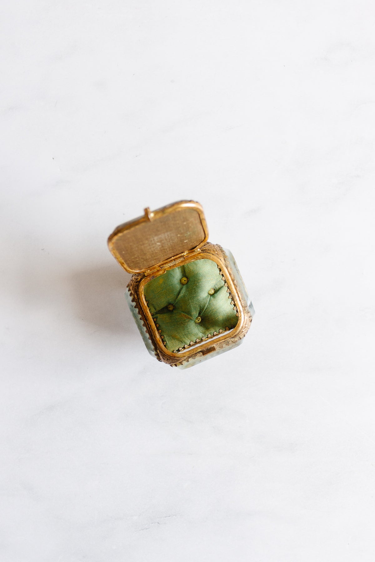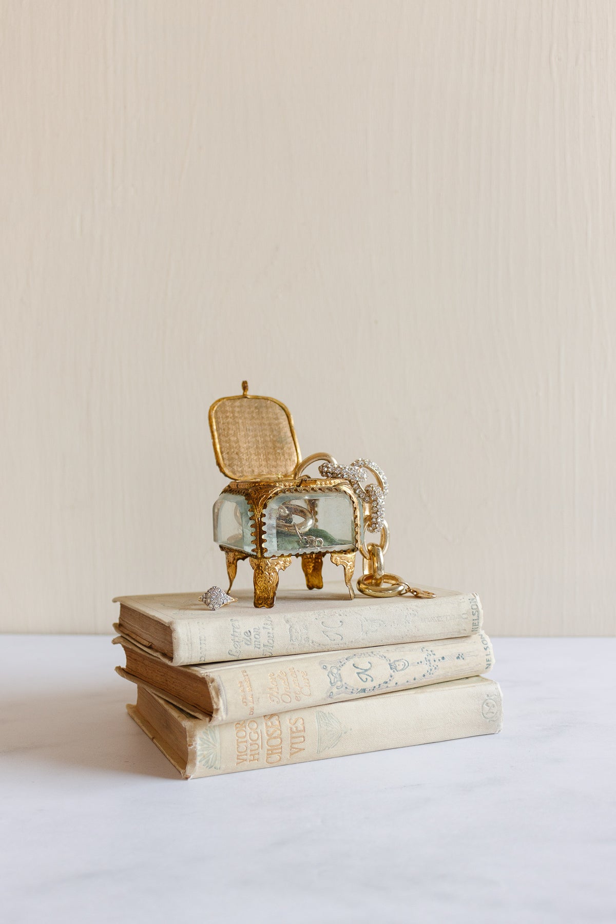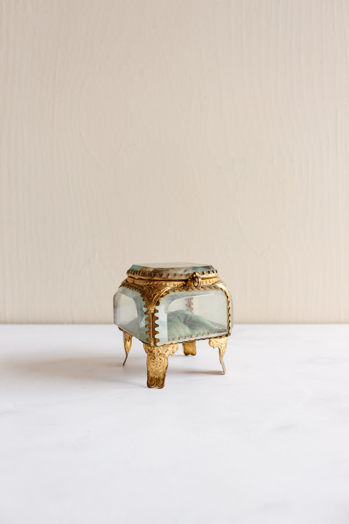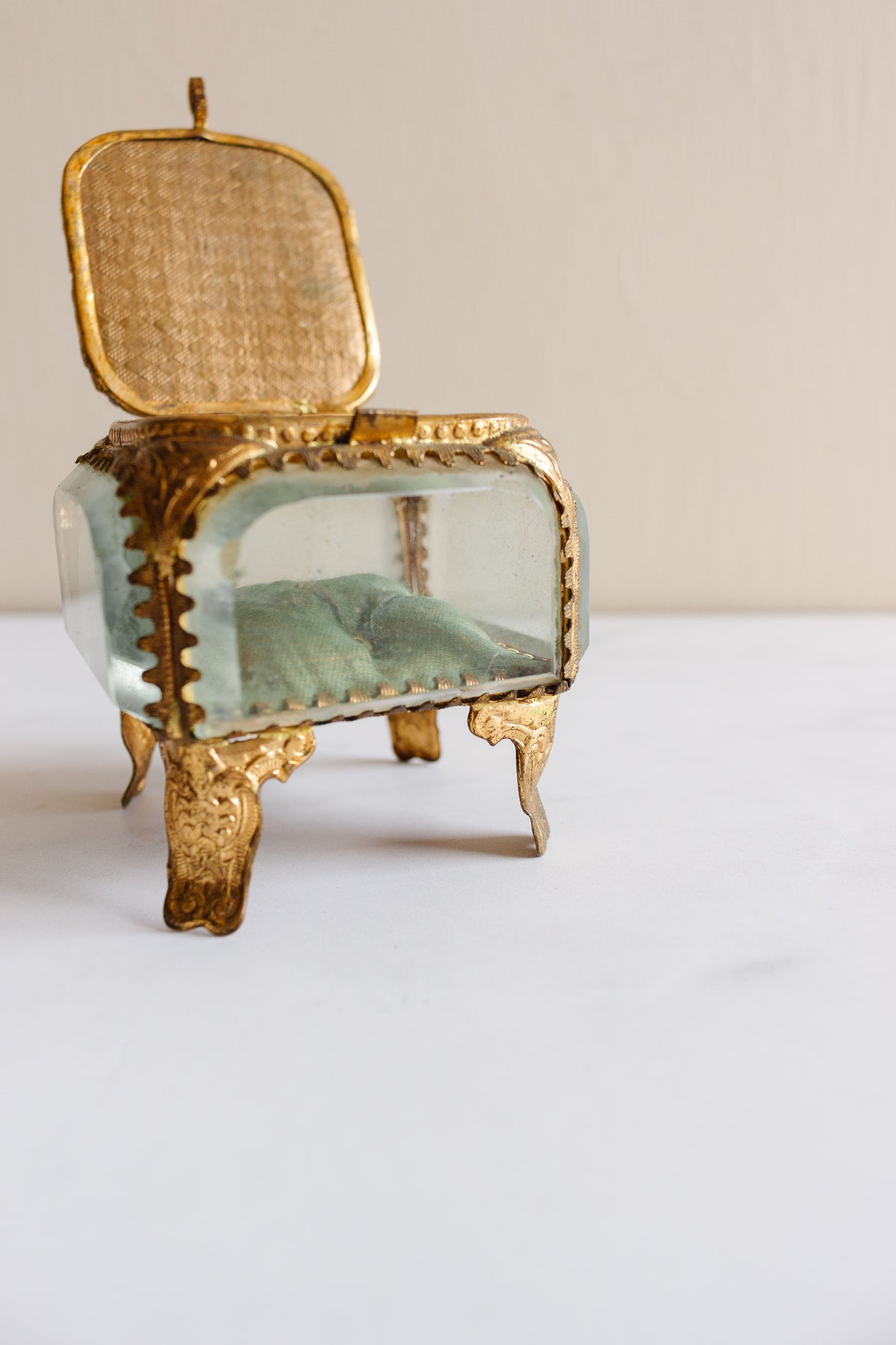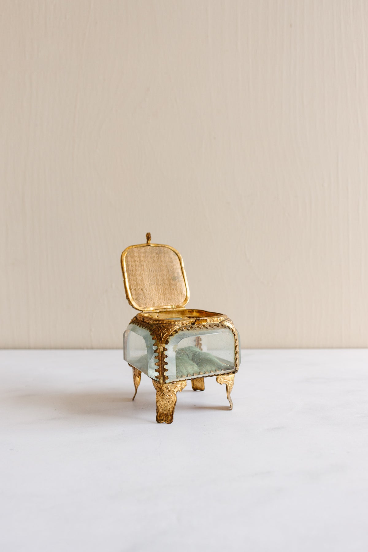 These turn of the century bijoux caskets are truly heirloom pieces, with their incredible craftsmanship, thick beveled glass and gilt ormolu details. This piece also features a beautifully preserved tufted fabric cushion base.