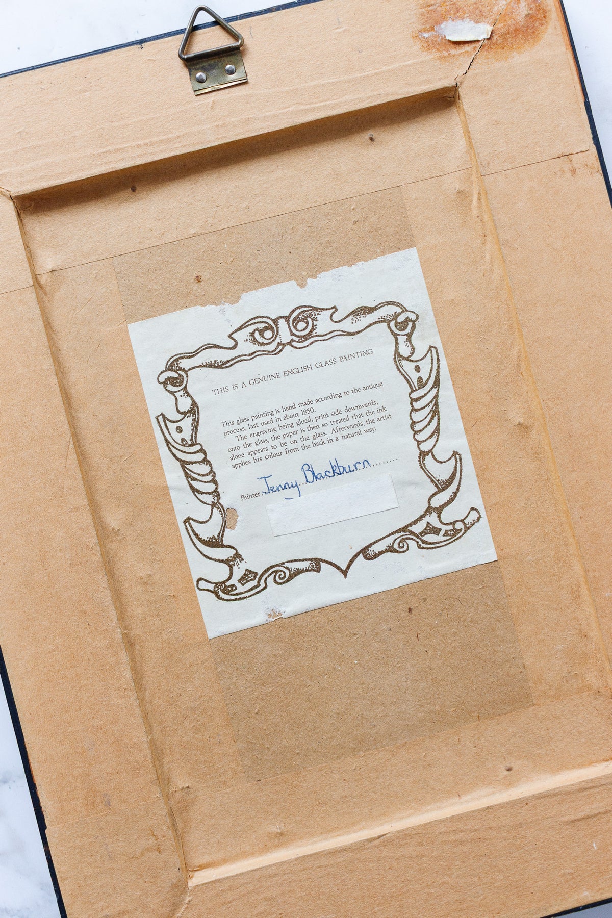 This glass painting is hand made according to the antique last used in about 1850.  The engraving being glued, print side downwards onto the glass, the paper is then so treated that the ink alone appears to be on the glass. Afterwards, the artist applies his colour from the back in a natural way. Sourced from a brocante in Marseille.