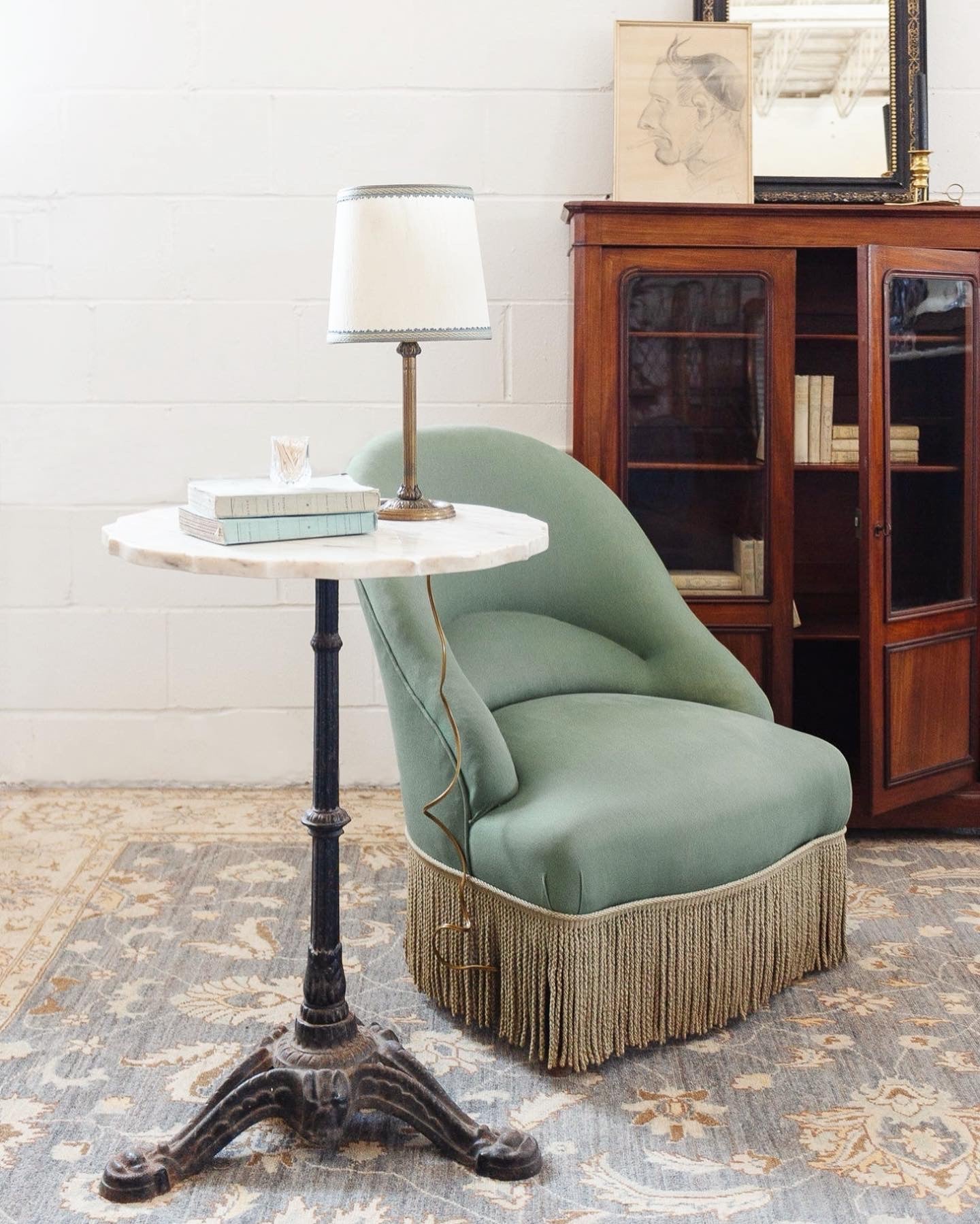 A pretty, petite table with a classic antique French cast iron base, and a scalloped edge marble top. While the marble top is not original to the base, we think the addition of the edge is such an unexpected and sweet detail, creating a one of a kind table.