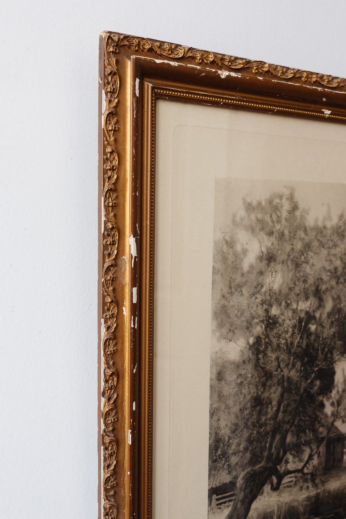 A stunning large scale piece, featuring a summer scene in soft black and white details. Housed in its original gilt wood and plaster frame that has been wonderfully worn and weathered, with a gorgeous time earned patina.
