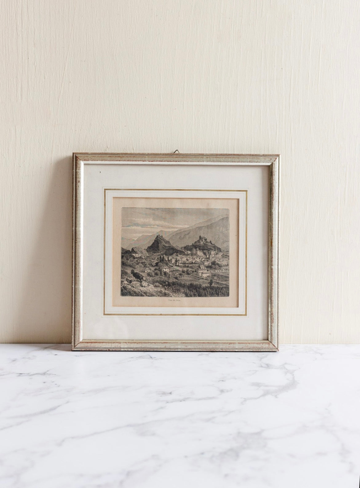 An incredible antique French engraving circa 1845, “Vue du Sion” was done after the original painting by Gabriel Lory (1784-1846). It is beautifully housed in its original frame with incredible French matting, and the back plate has been recently replaced. An incredible heirloom piece of art, ready to cherish for another lifetime.