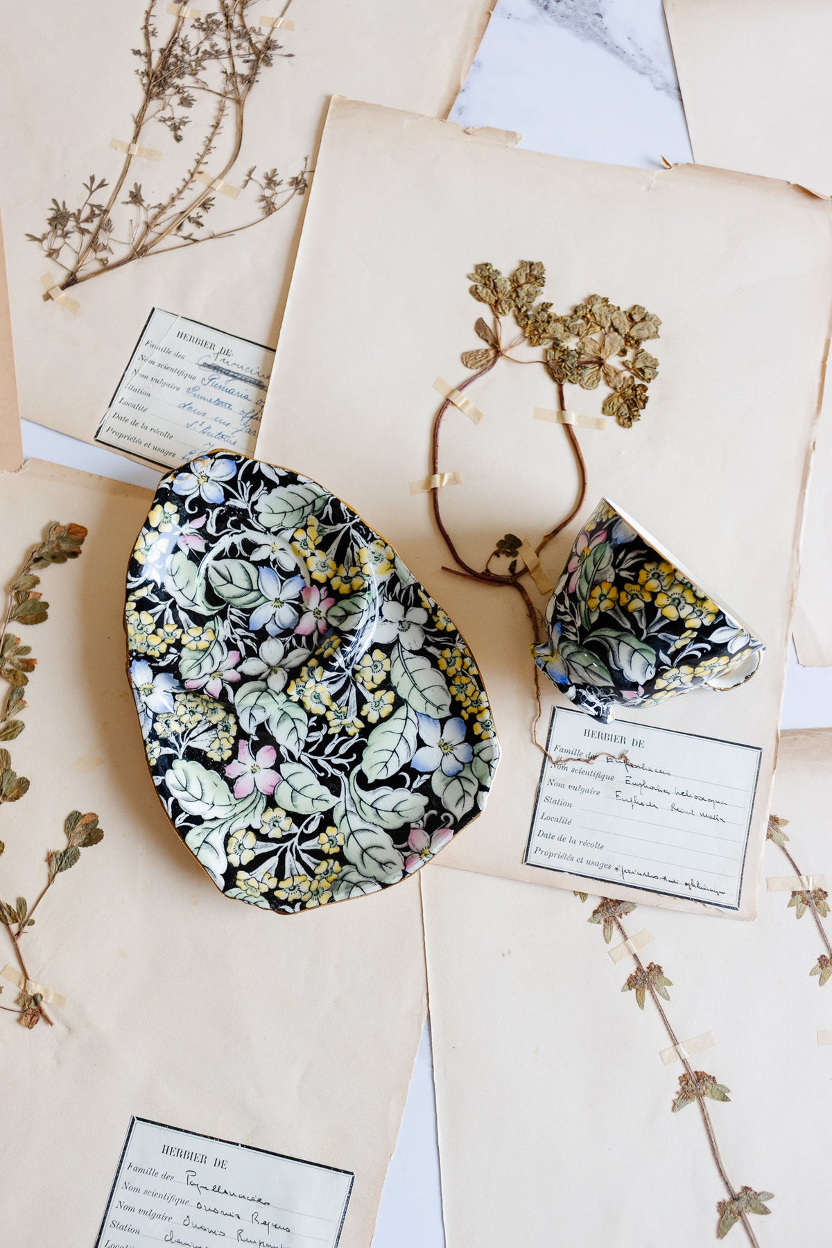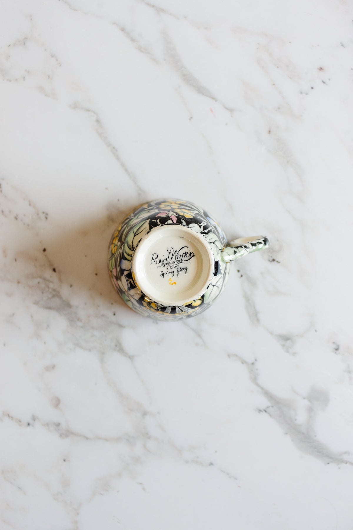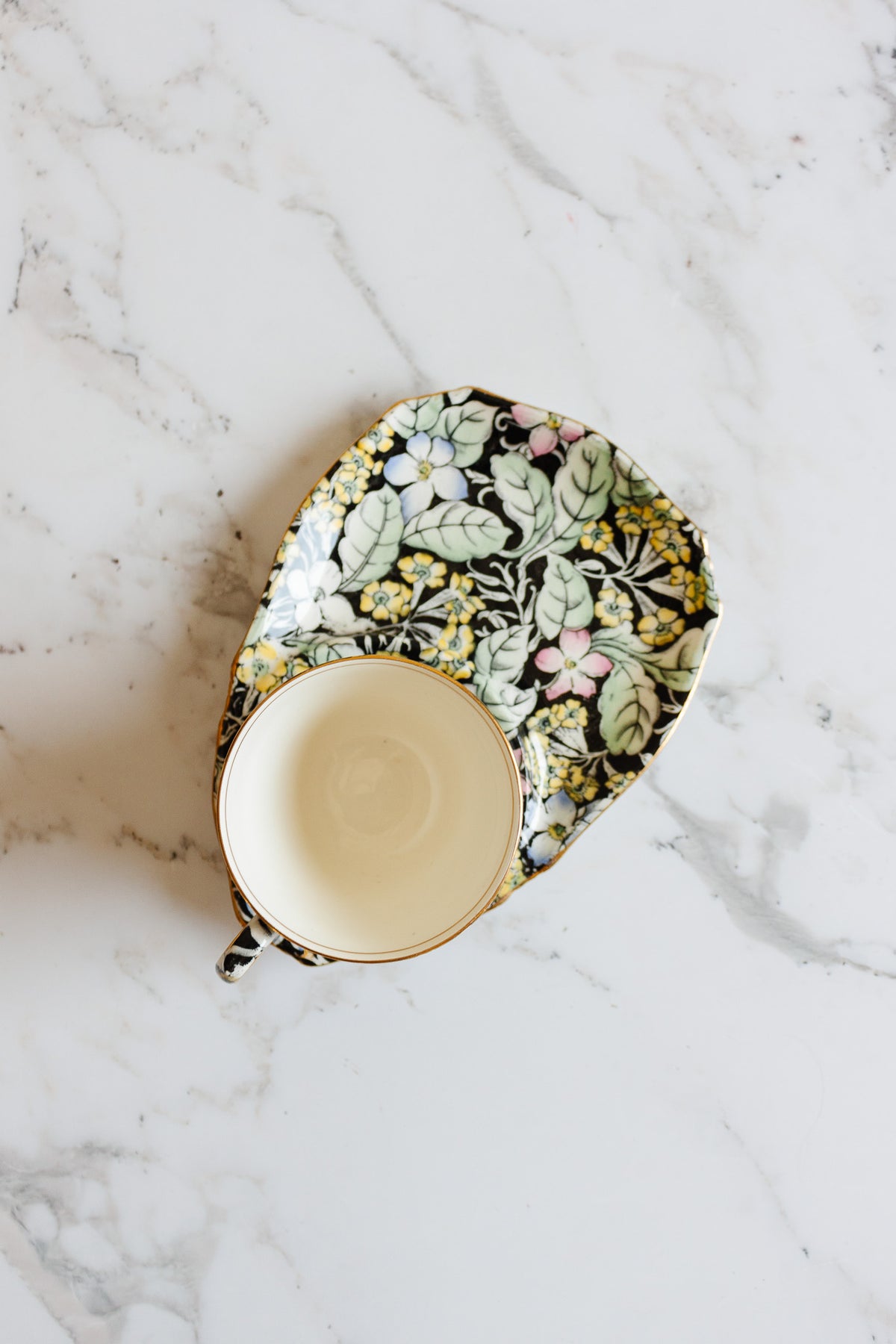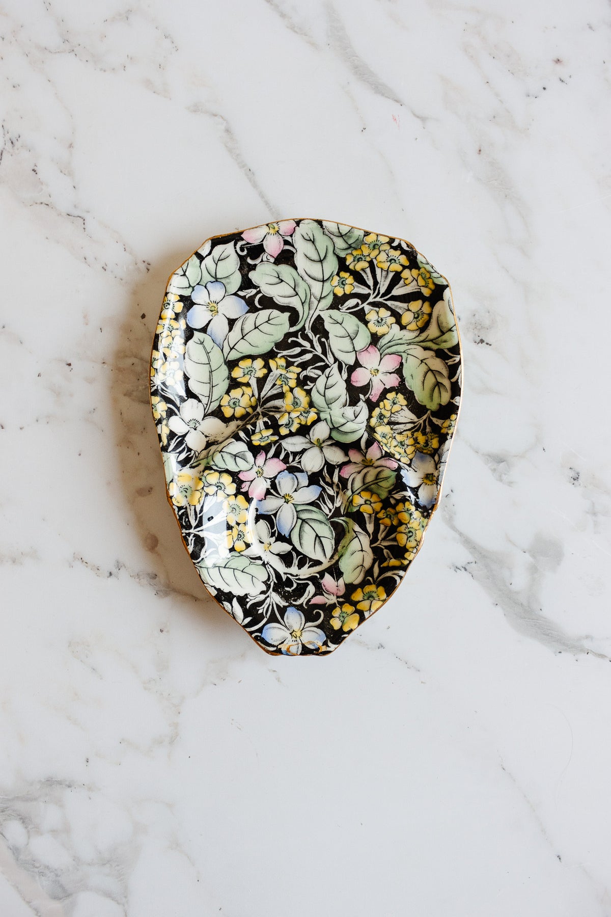 This rare chintz design is eye catching! The Royal Winton "Spring Glory" pattern was introduced in 1938. This pattern features a vibrant and colorful chintz design, typical of Royal Winton's style during that era. The "Spring Glory" pattern became quite popular and remains a sought-after design.