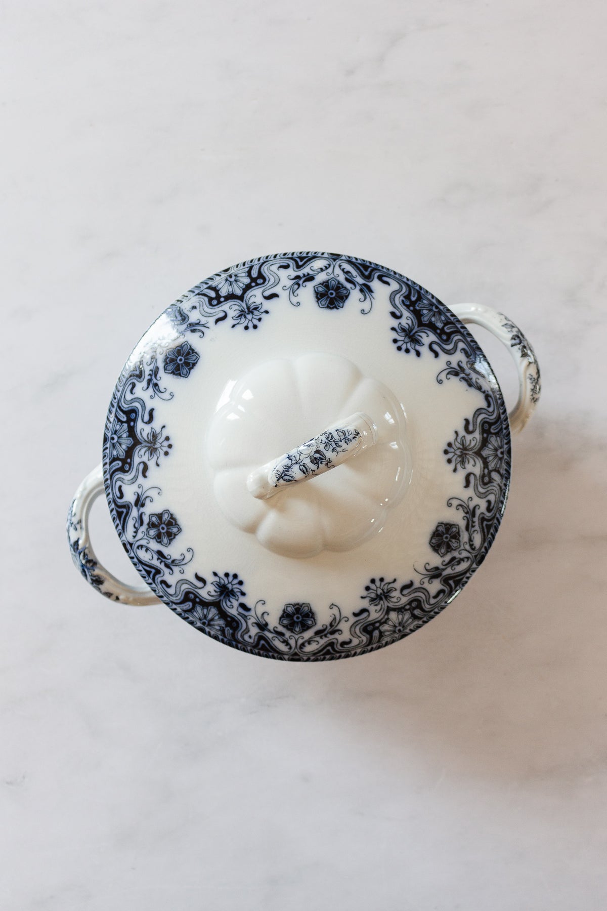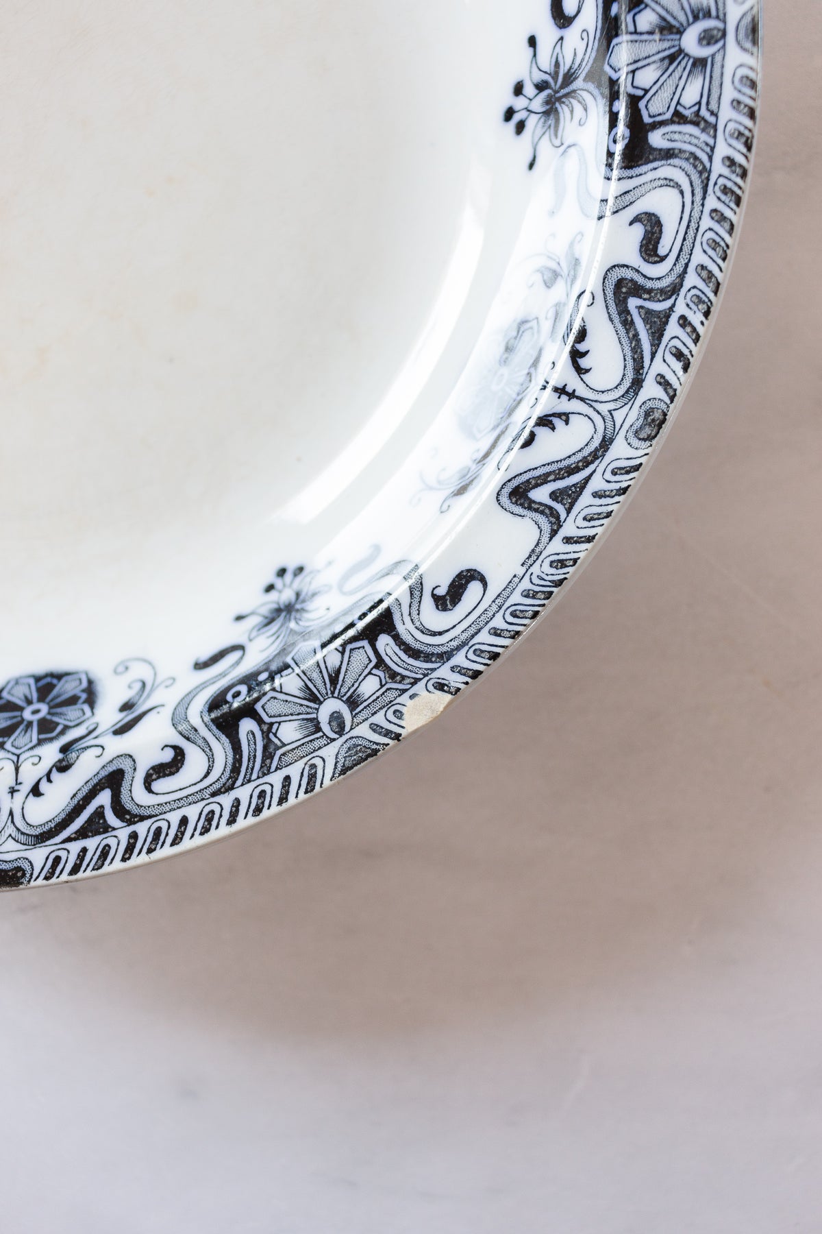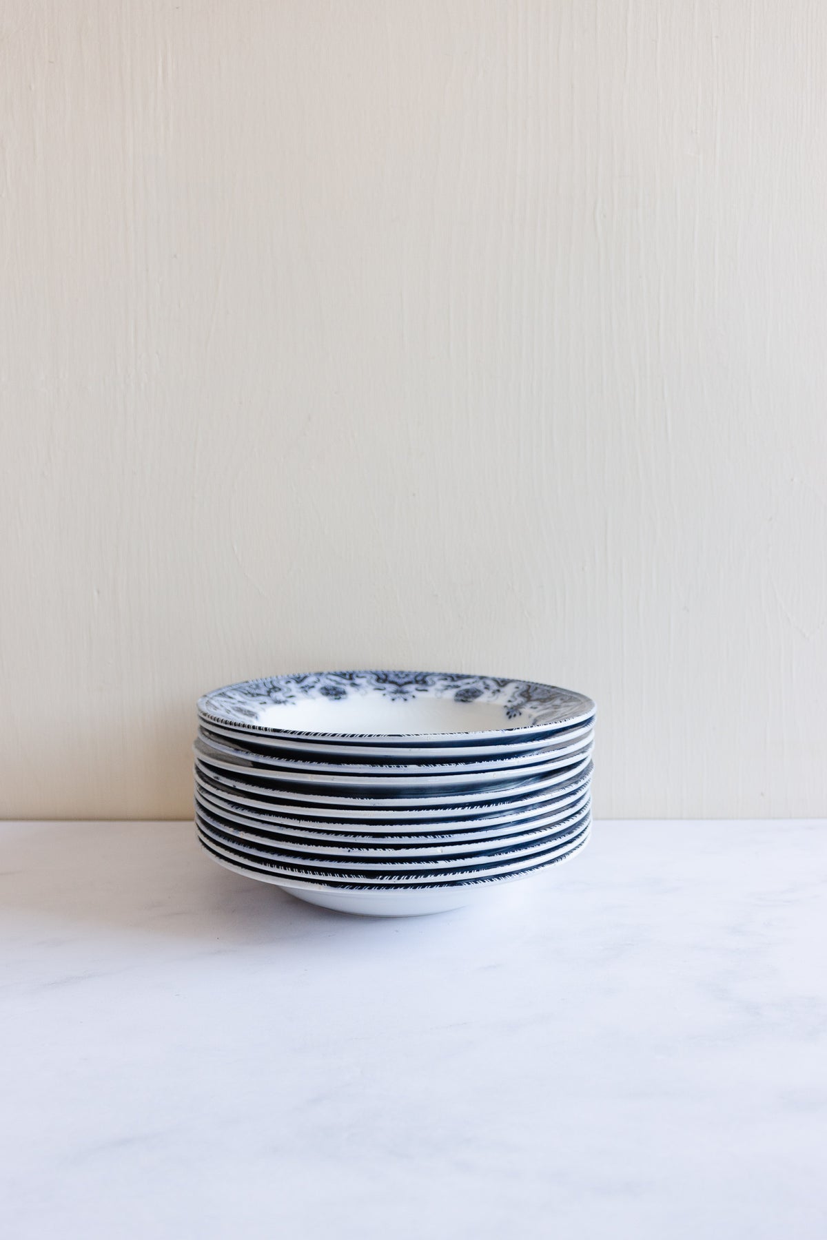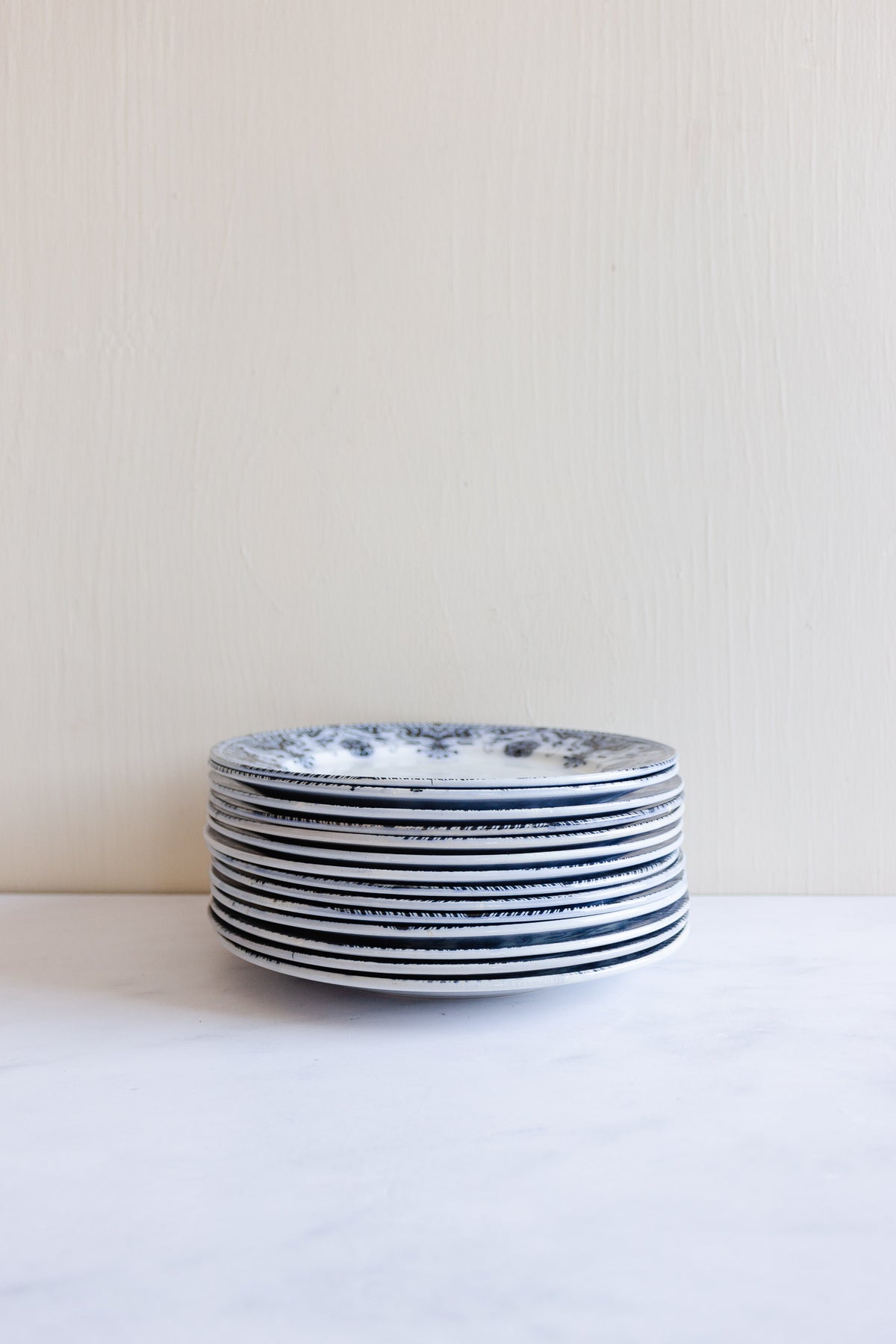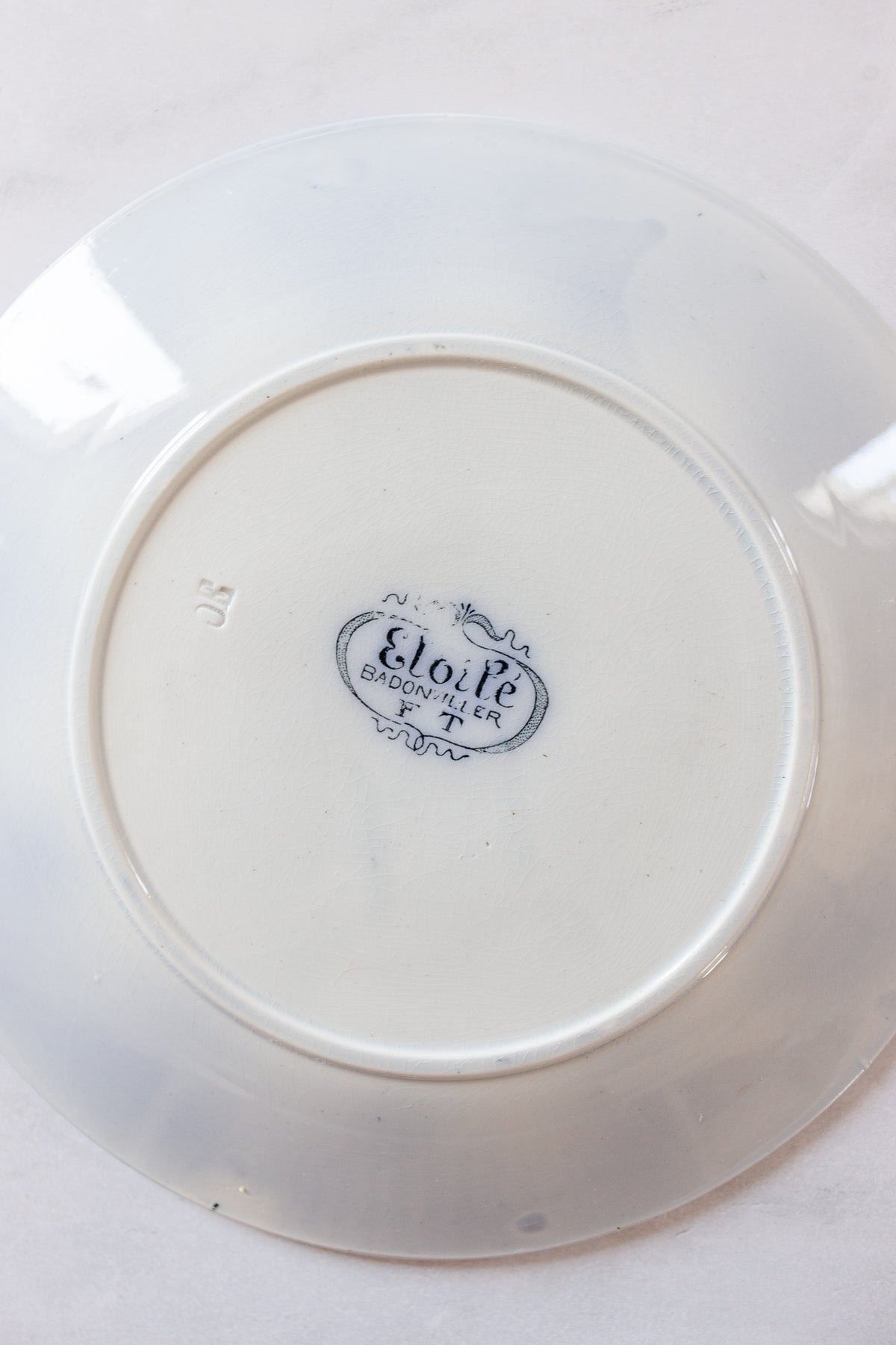 An exquisite set of 42 antique french transferware by Badonviller; stamped on the bottom by the maker. This set once lived in a home in Normandy.  Use this as an every day set - forget about storing china for a special occasion.  See below for a breakdown of included pieces. Note there are some.minor chips as pictured to a few items. Priced accordingly.