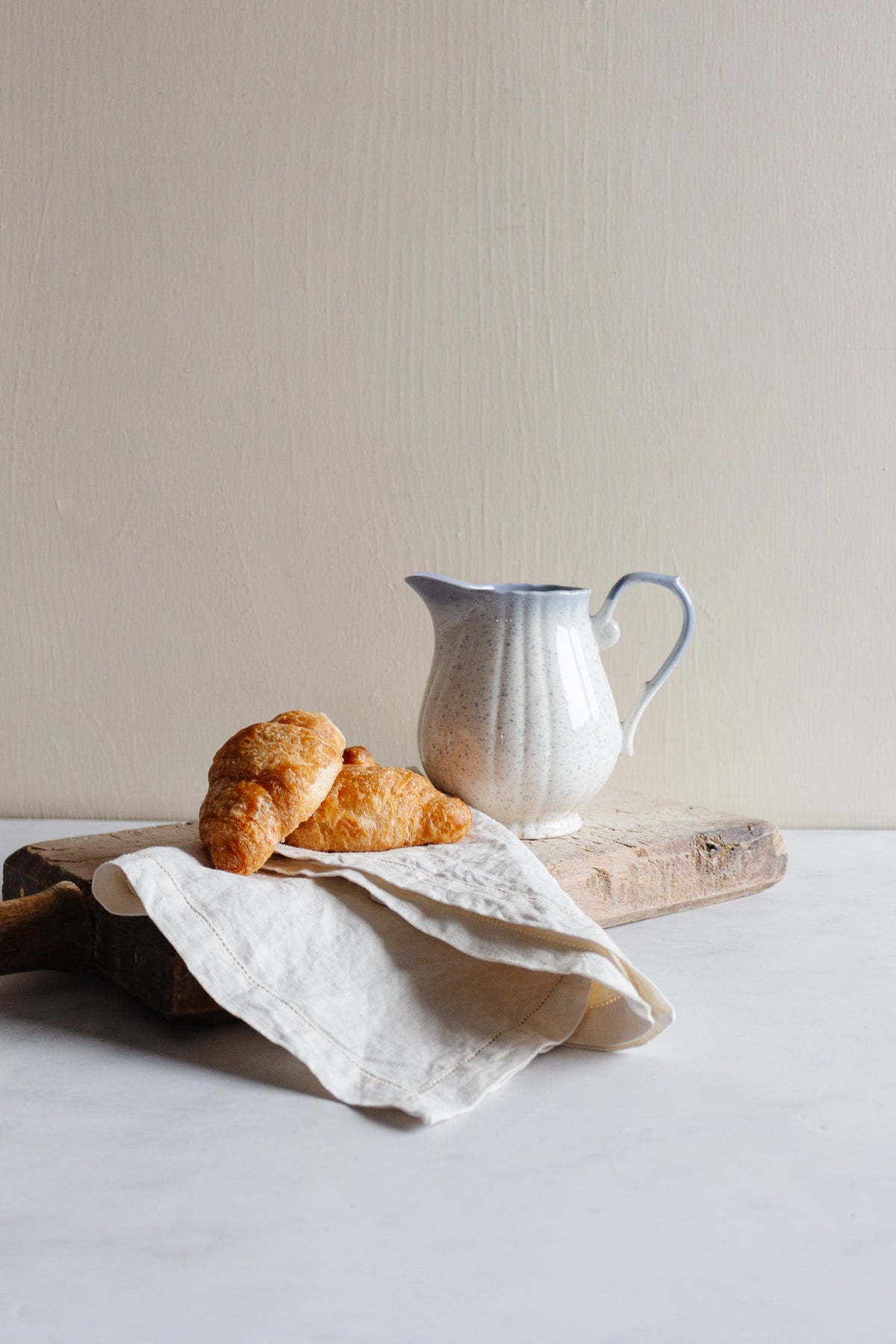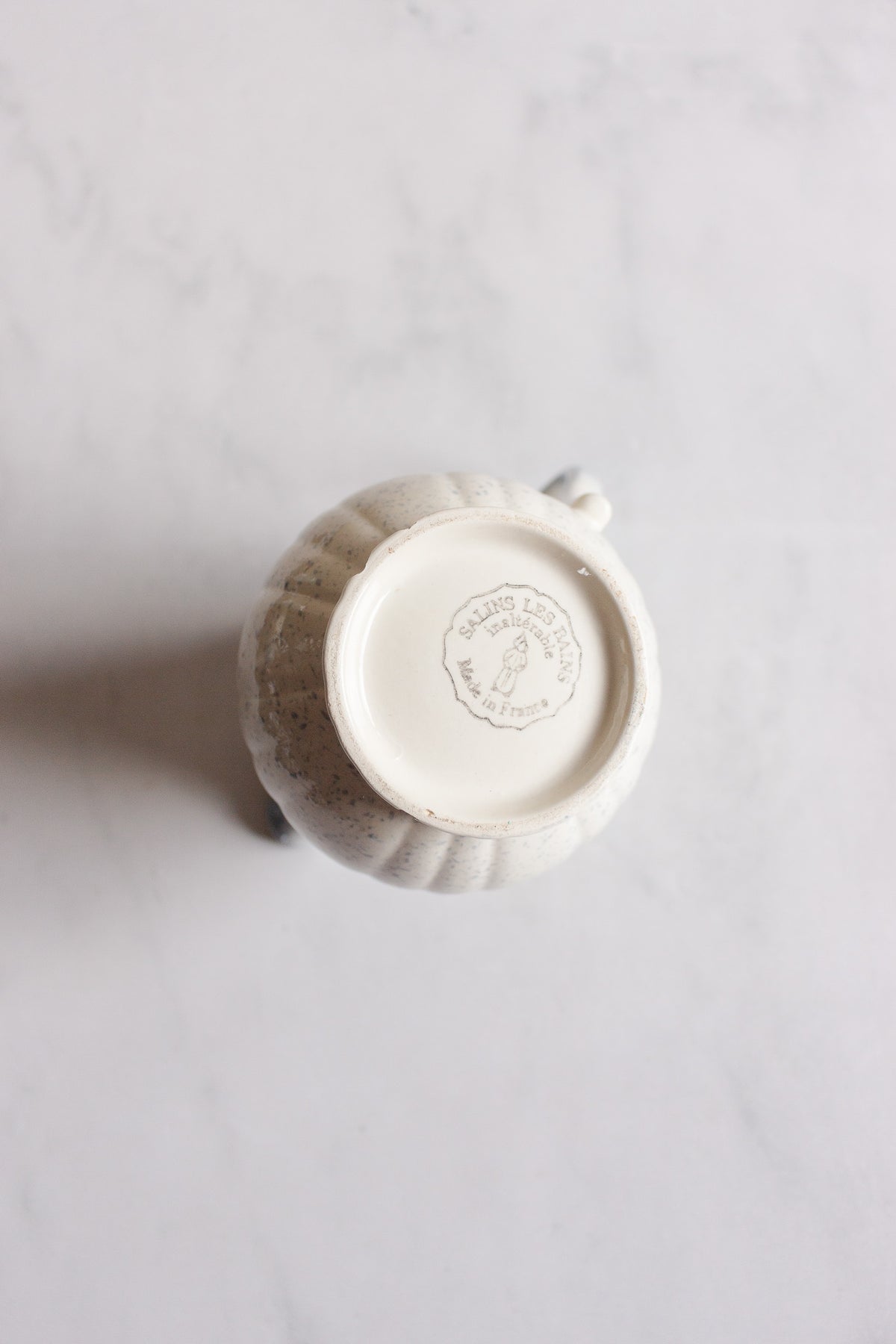 A beautifully crafted little pottery pitcher from Salins pottery, with stunning blue and white speckled majolica glaze.
