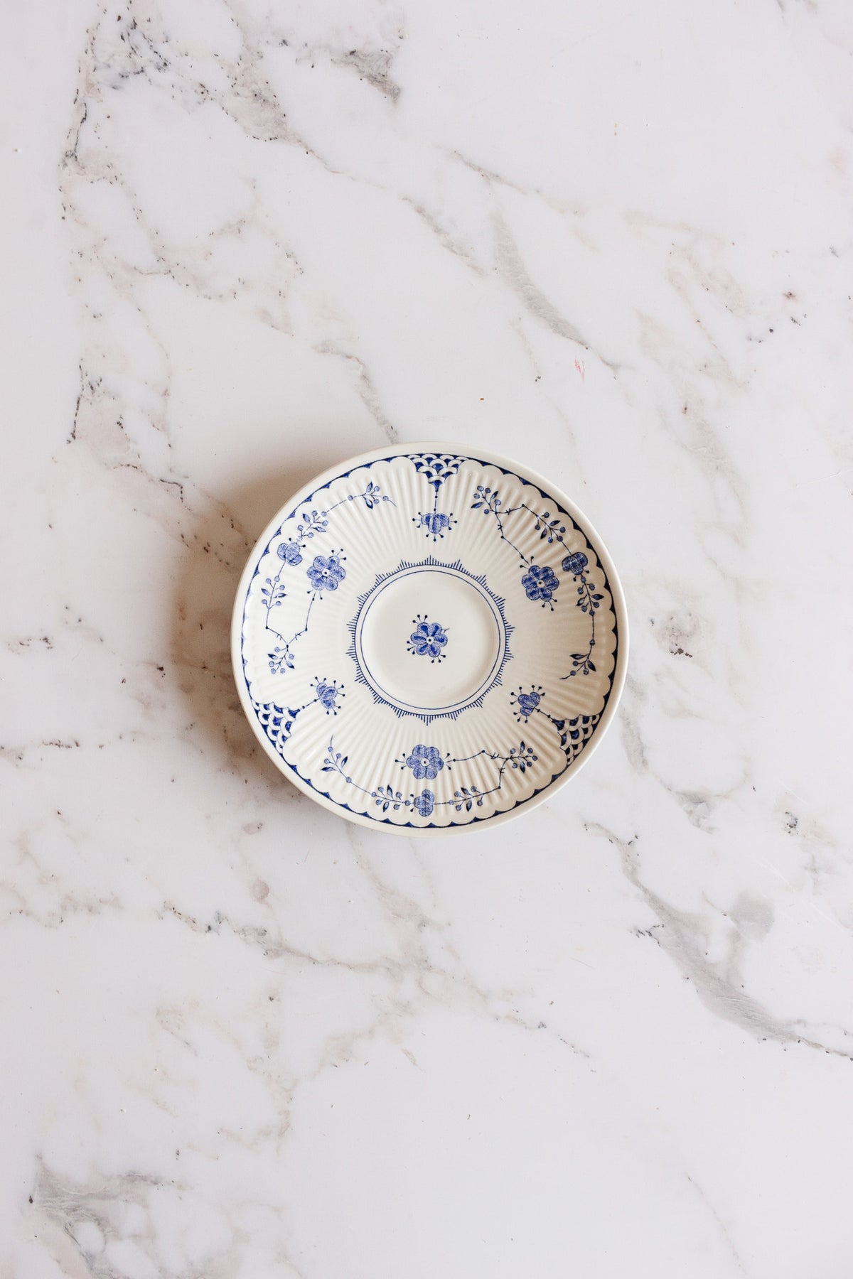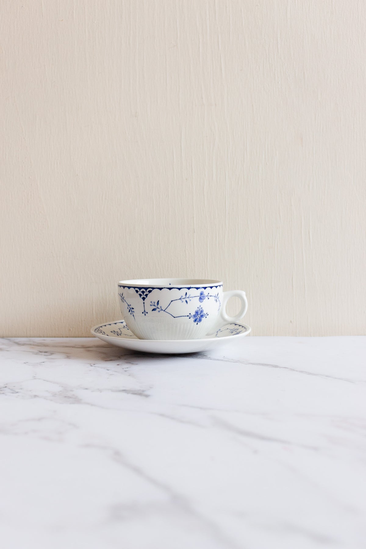 These teacups, in the "Blue Denmark" pattern, were inspired by traditional Danish designs, and are especially iconic. The "Blue Denmark" pattern by Furnivals is relatively old and has a rich history.  The exact age of the pattern can be traced back to as early as the 1900s through to the mid-20th century, reflecting its Victorian-era origins and subsequent popularity in the 20th century.