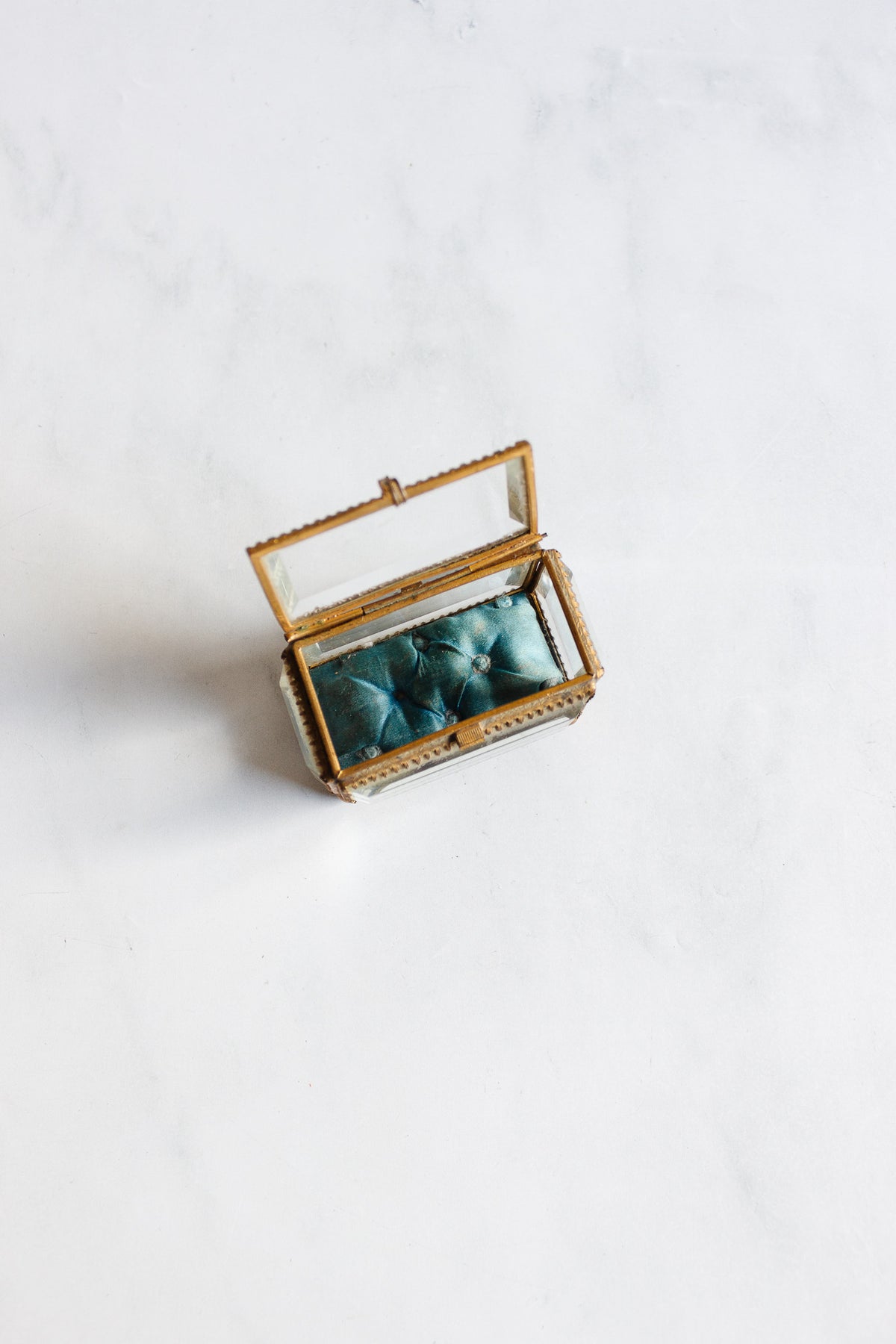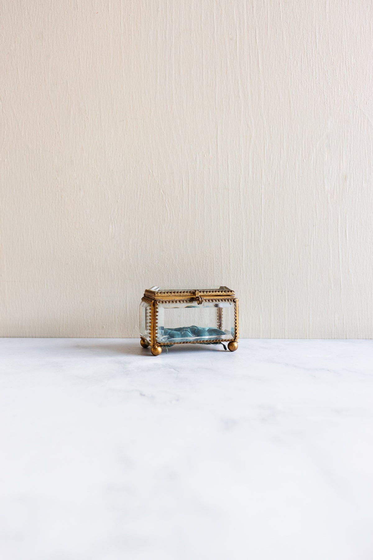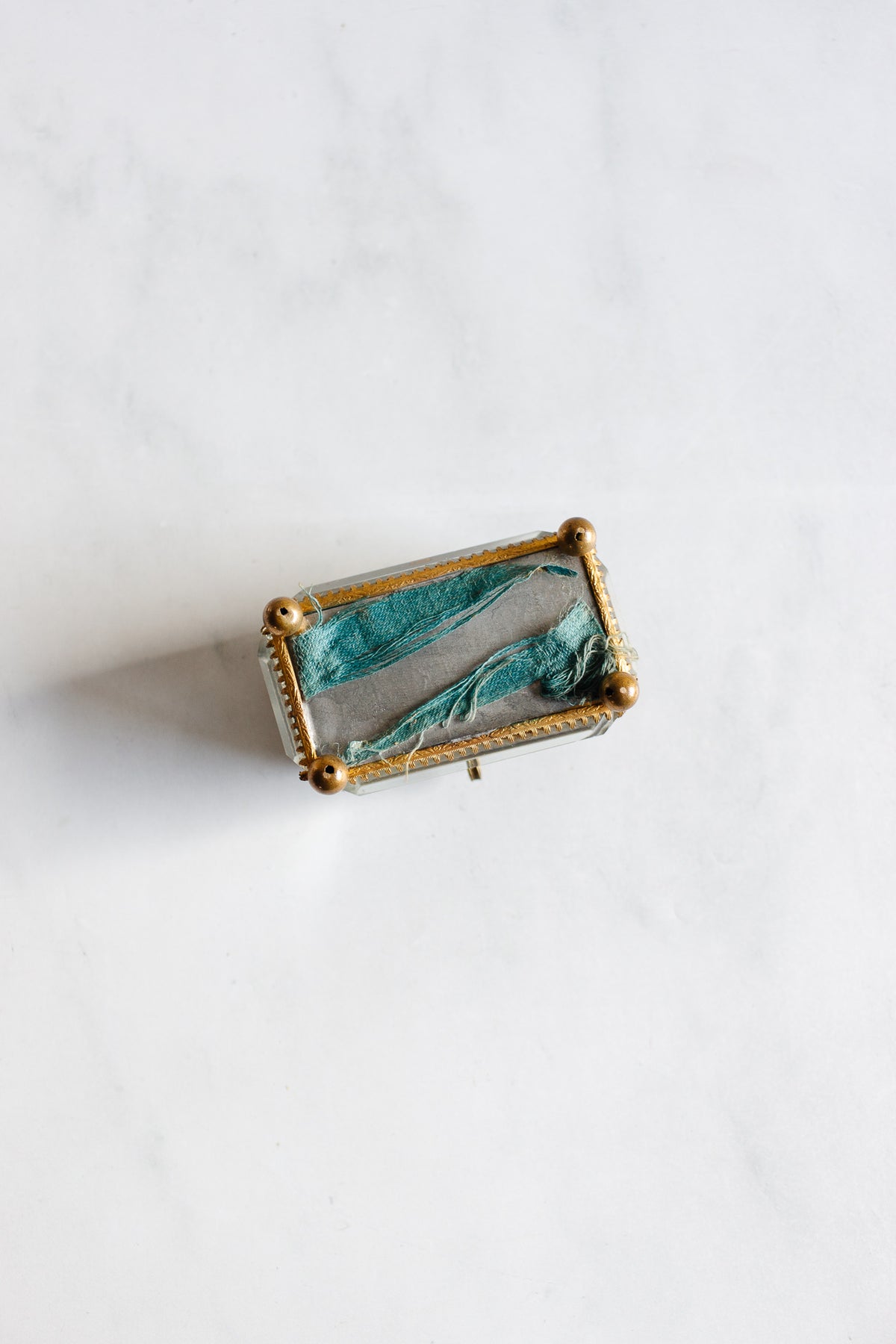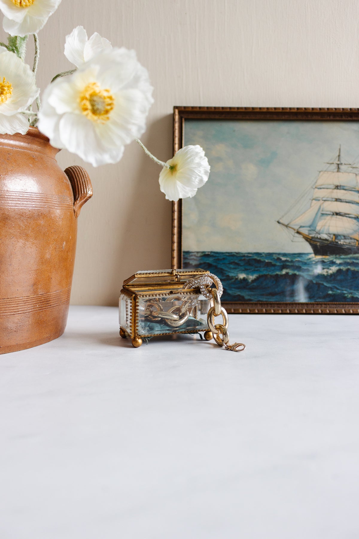 These turn of the century bijoux caskets are truly heirloom pieces, with their thick beveled glass and stamped ormulou details.