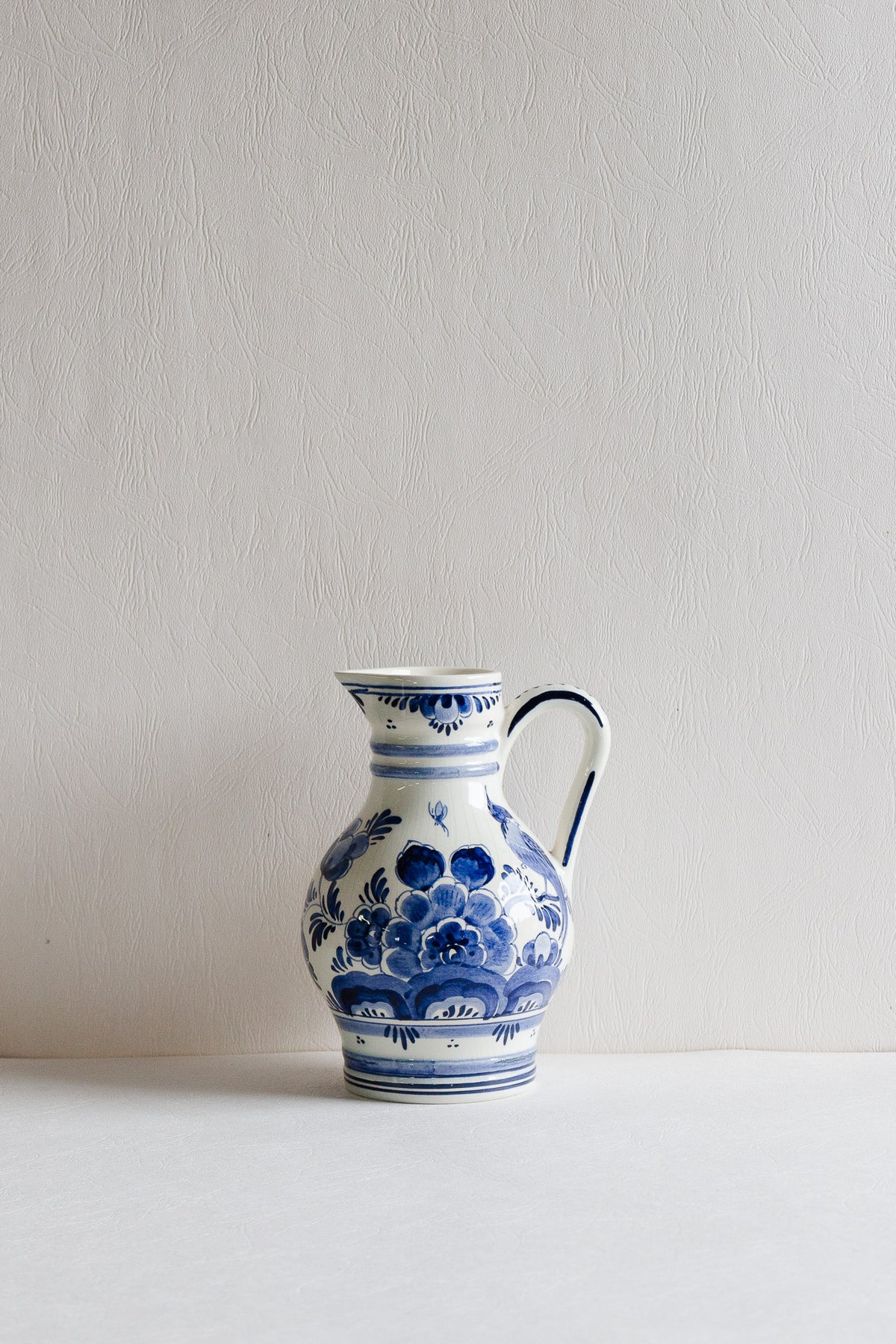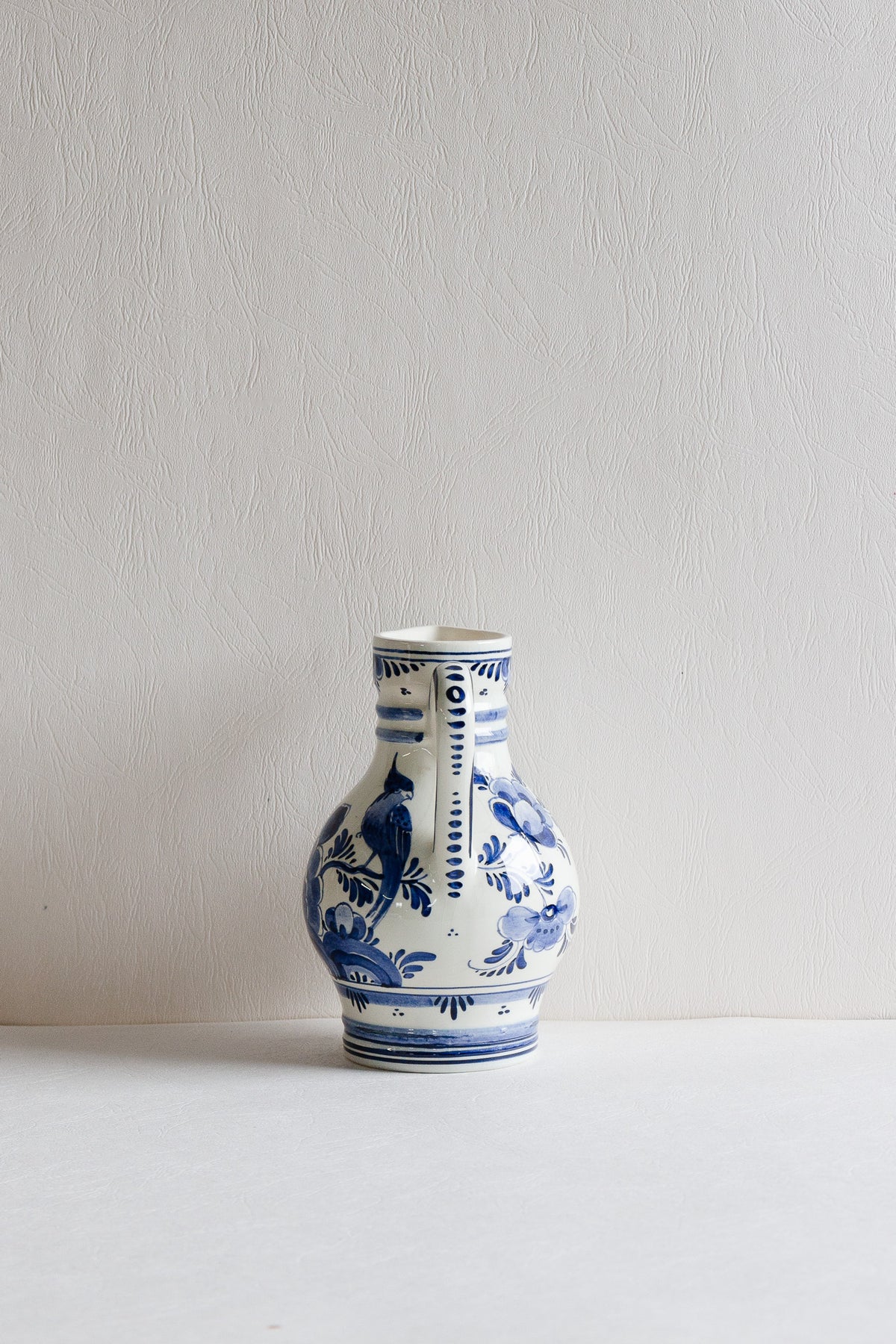This vintage pitcher is crafted in the traditional Delftware style, originating from Delft, Netherlands. It is made of tin-glazed earthenware, featuring a white base decorated with intricate hand-painted blue floral patterns.