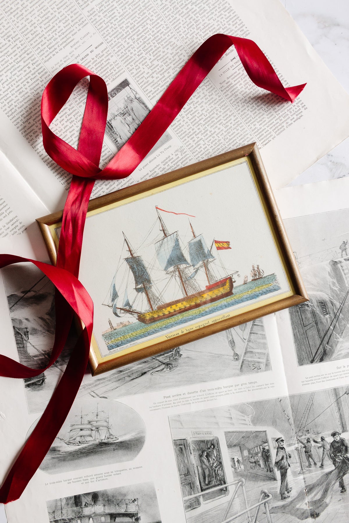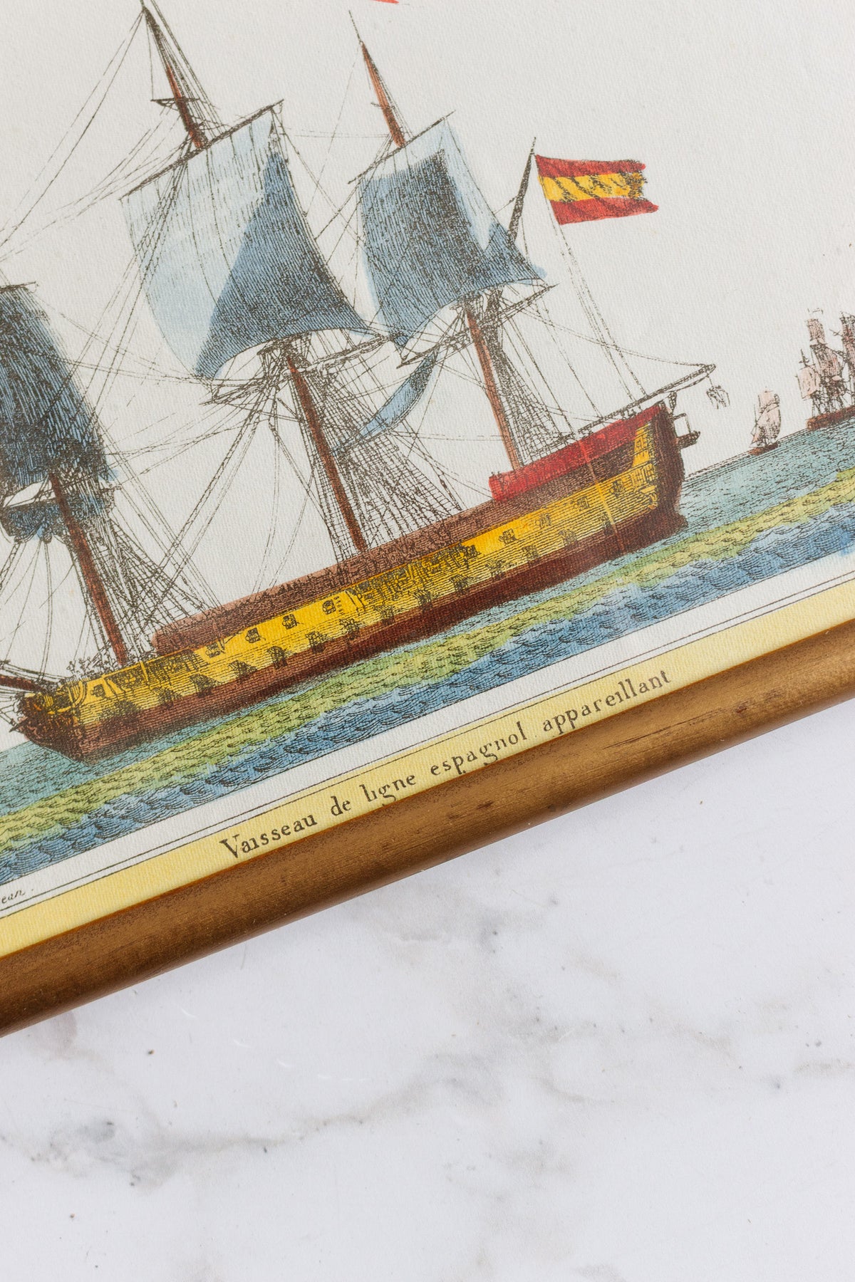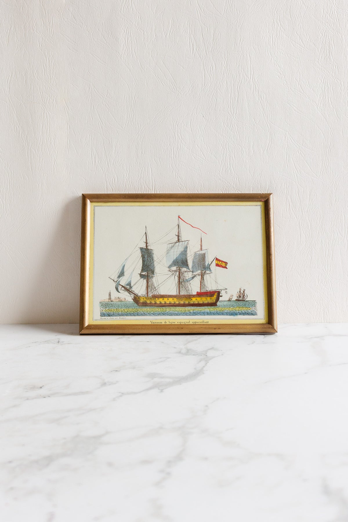 A striking antique hand-coloured engraving depicting a Spanish ship preparing to set sail, rendered with beautiful period detailing and soft washes of colour. The scene captures the drama and anticipation of departure, making it a compelling addition to any nautical or historical collection. Sourced from a brocante in Marseille.