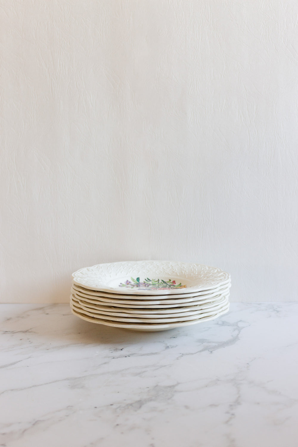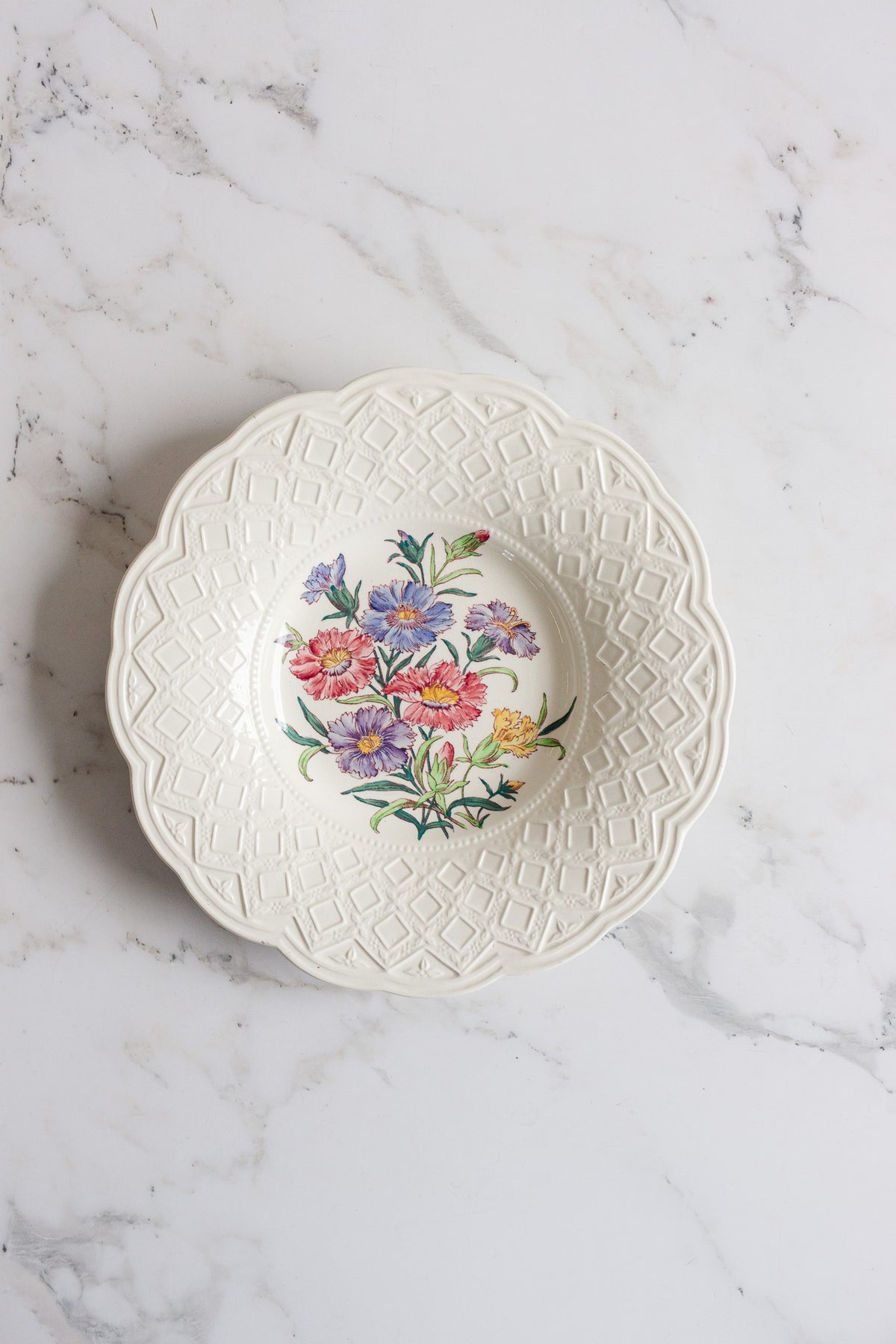 Set of eight vintage Wedgwood Barlaston “Dianthus” bowls, crafted in fine English china with gently scalloped rims. Each bowl showcases a unique floral variation from the Dianthus series, making the set especially striking when displayed or used together. Shallow in form, they’re perfect for serving soups, pastas, or light courses with elegance. Discontinued and increasingly hard to find as a complete set, these bowls bring both beauty and versatility to the table. Minimal signs of age and use.