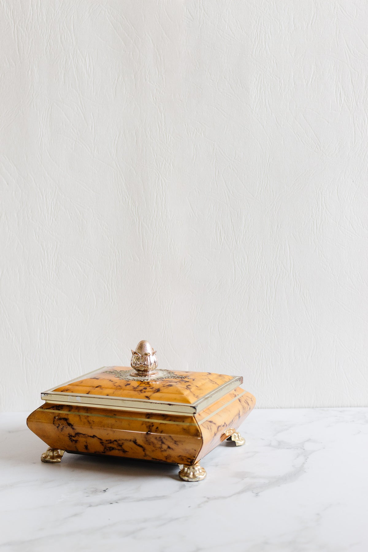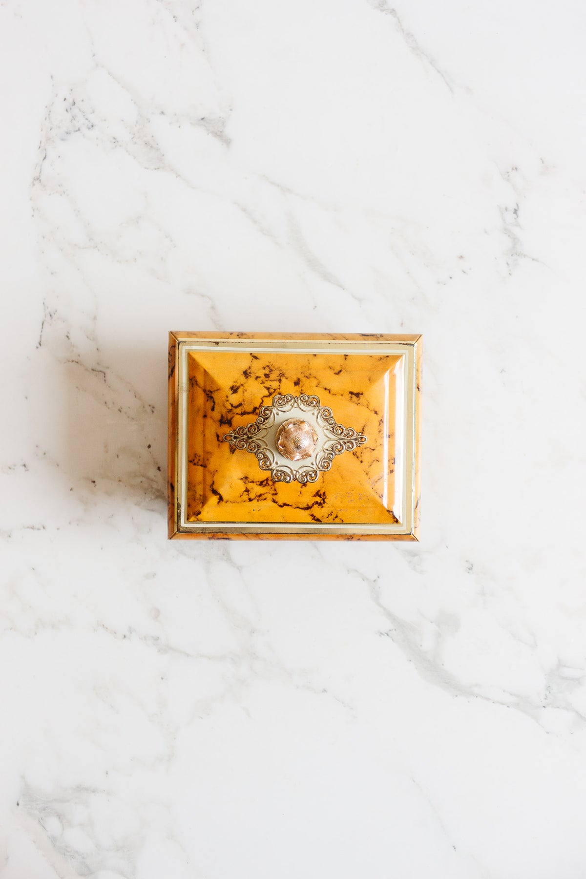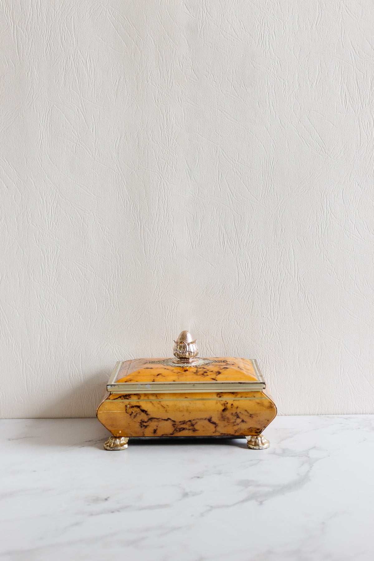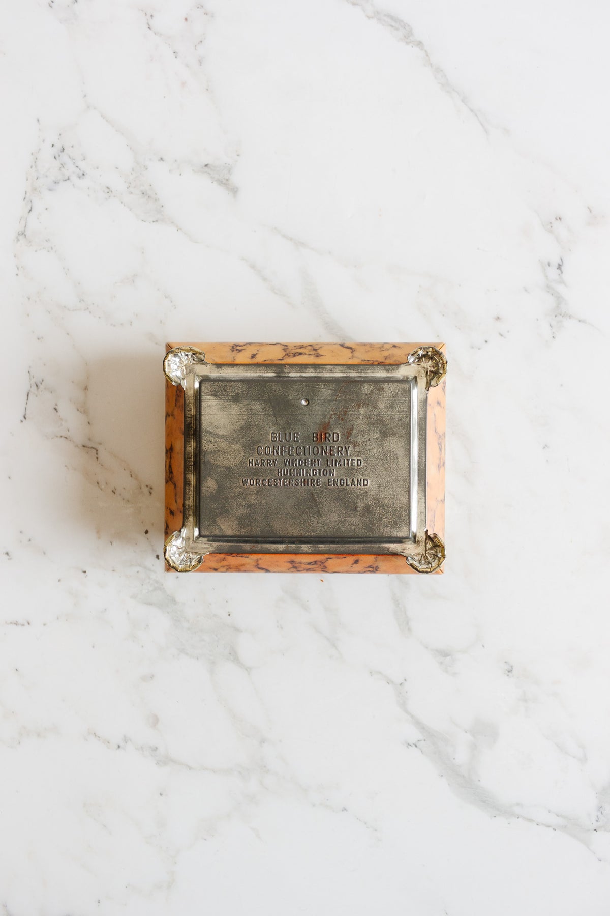 Vintage Blue Bird confectionery tin box by Harry Vincent Ltd., crafted in England, UK. Featuring a charming blue bird design on an orange marble background, this collectible tin showcases early 20th-century decorative packaging. Ideal for display or storage, it reflects classic British confectionery style.