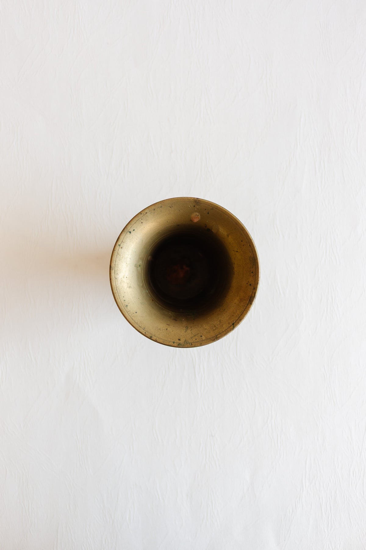 Antique French heavy brass mortar with thick walls and a solid, weighty feel that speaks to its original use in the kitchen or apothecary. The warm patina has developed beautifully over time, highlighting the subtle casting marks and rounded rim. Once used for grinding herbs and spices by hand, it now makes a striking decorative object on a countertop, shelf, or layered into a vignette. Sourced from a brocante in Marseille.