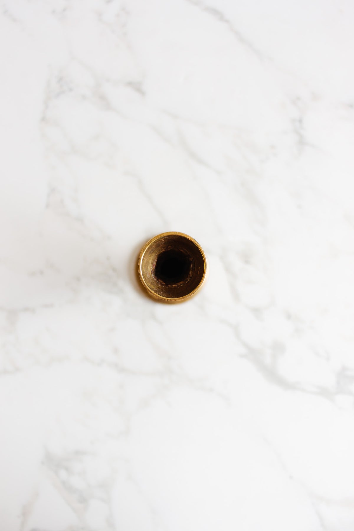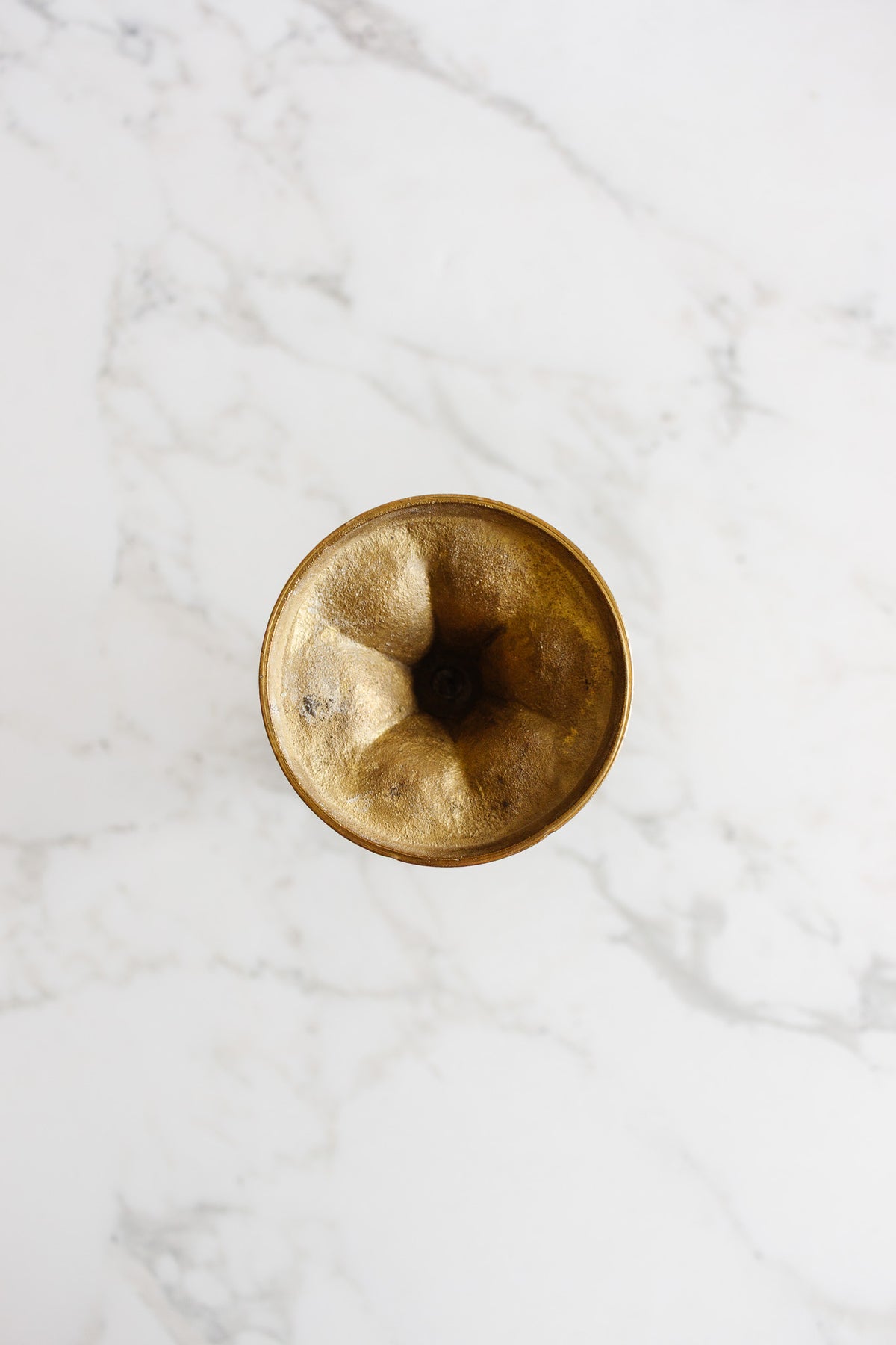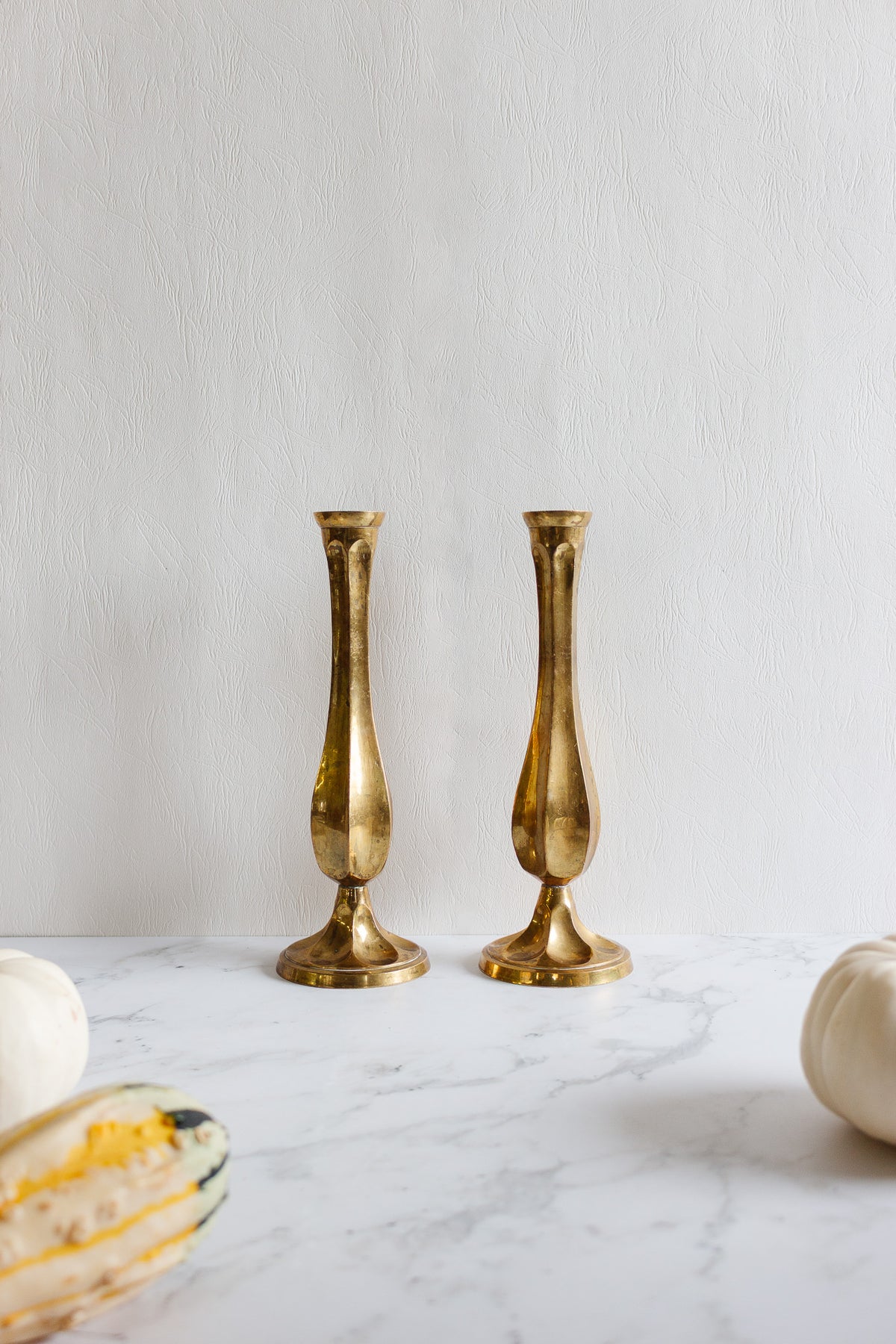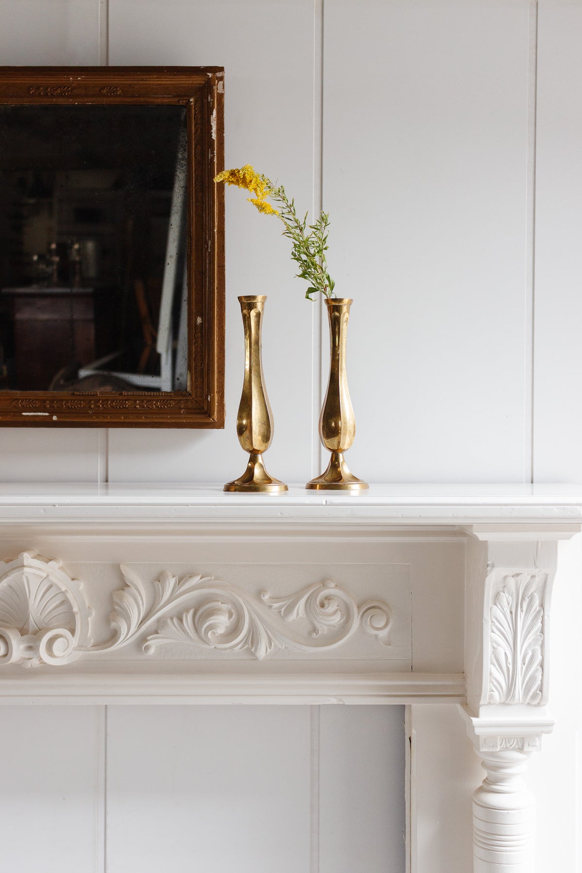 A pair of vintage French brass bud vases, sourced from a brocante in Marseille. Their slender forms and warm, timeworn patina lend a refined simplicity, perfect for holding single stems or branches. Equally striking displayed empty, they bring a touch of understated French elegance to any vignette or tabletop.