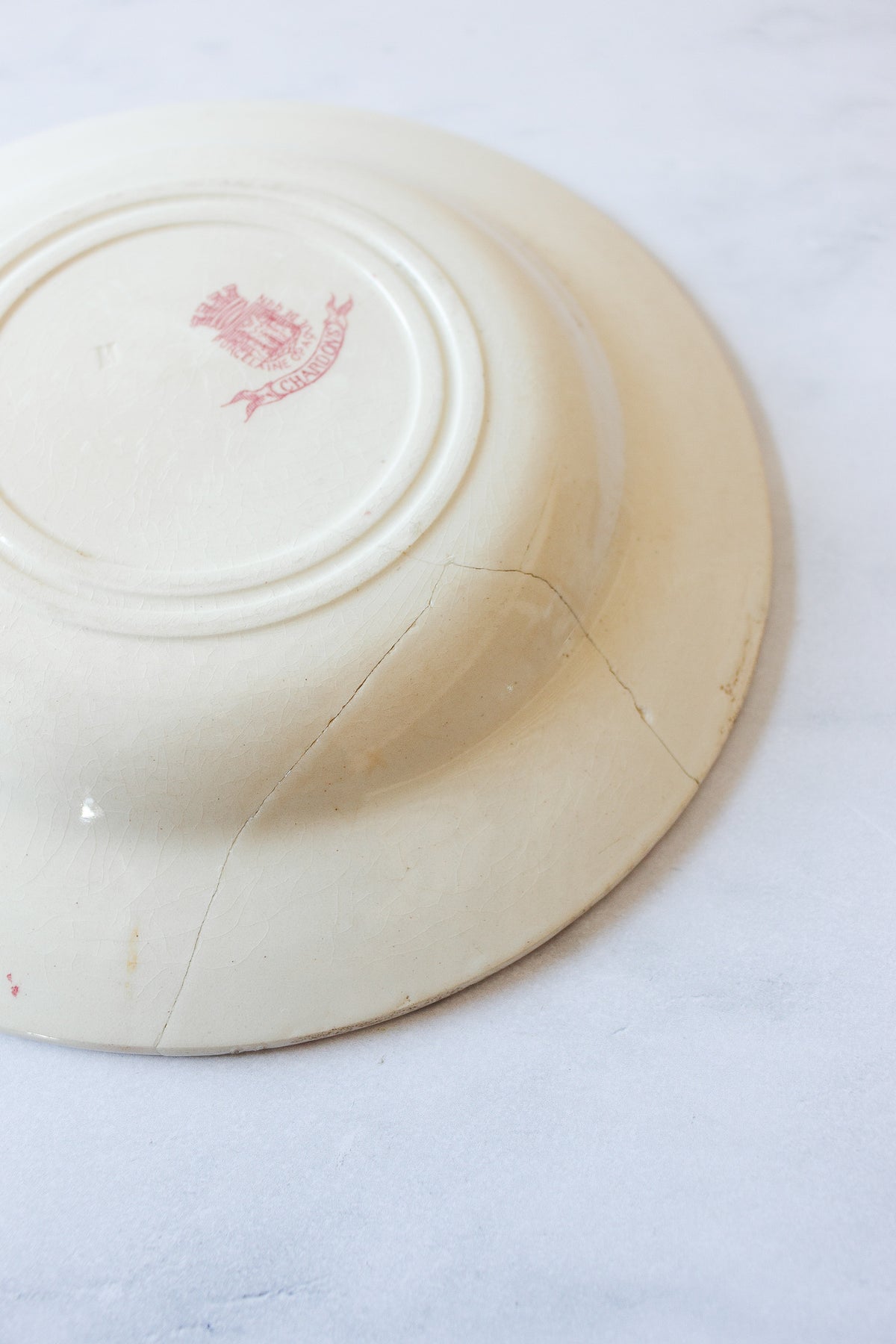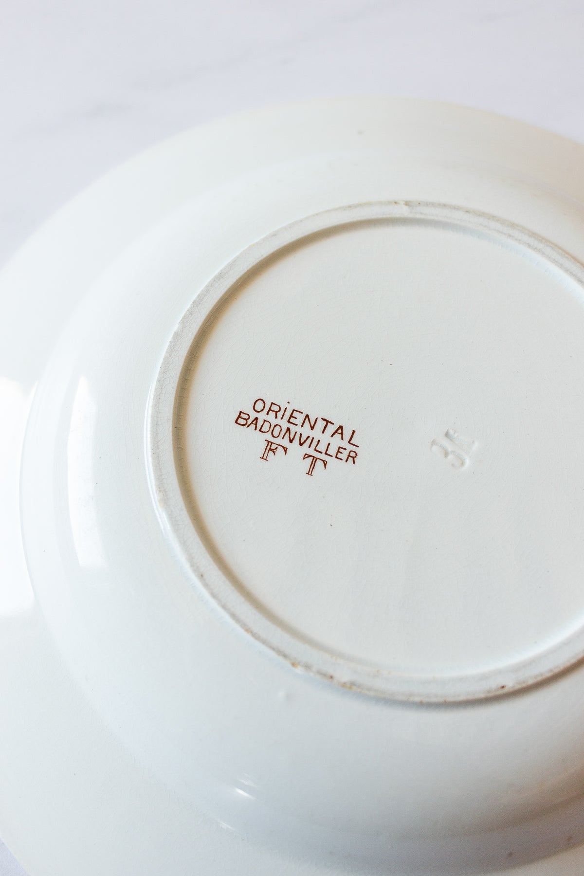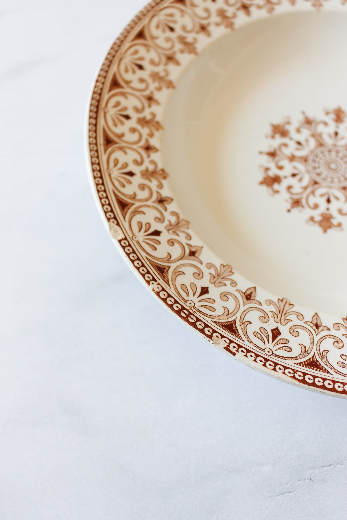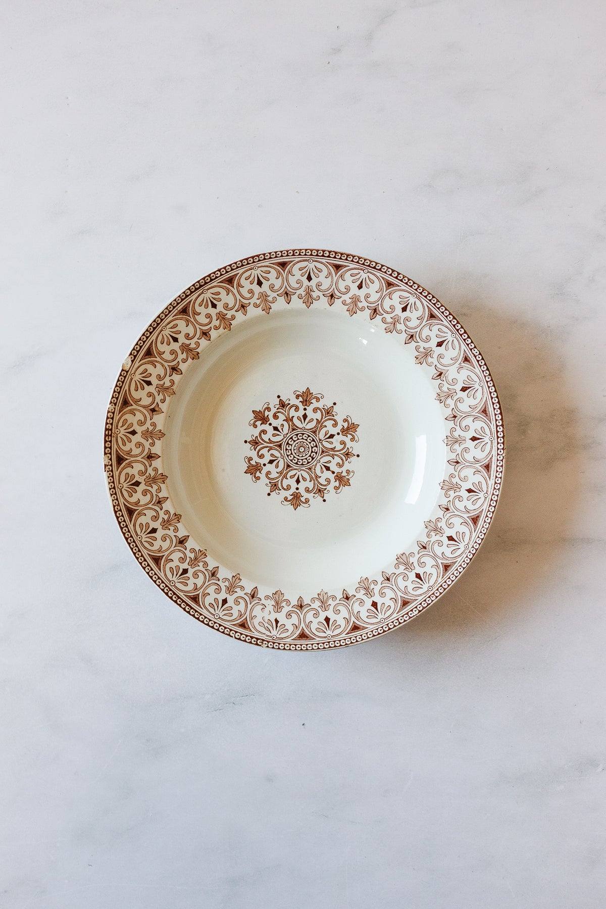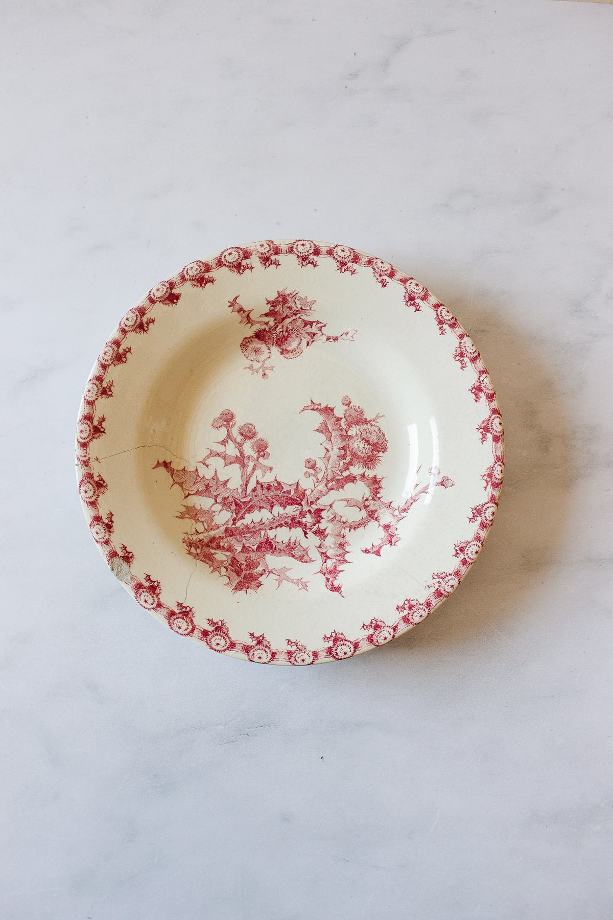 What we love about antique French ironstone is the incredible heirloom quality of each piece, and timeless transferware designs. These gorgeous turn of the century plates were crafted in the loveliest red and brown colours, with stunning floral and art deco designs. They once hung on the wall beside the kitchen fireplace at a farmhouse in Marseille. In excellent condition with no chips or cracks.
