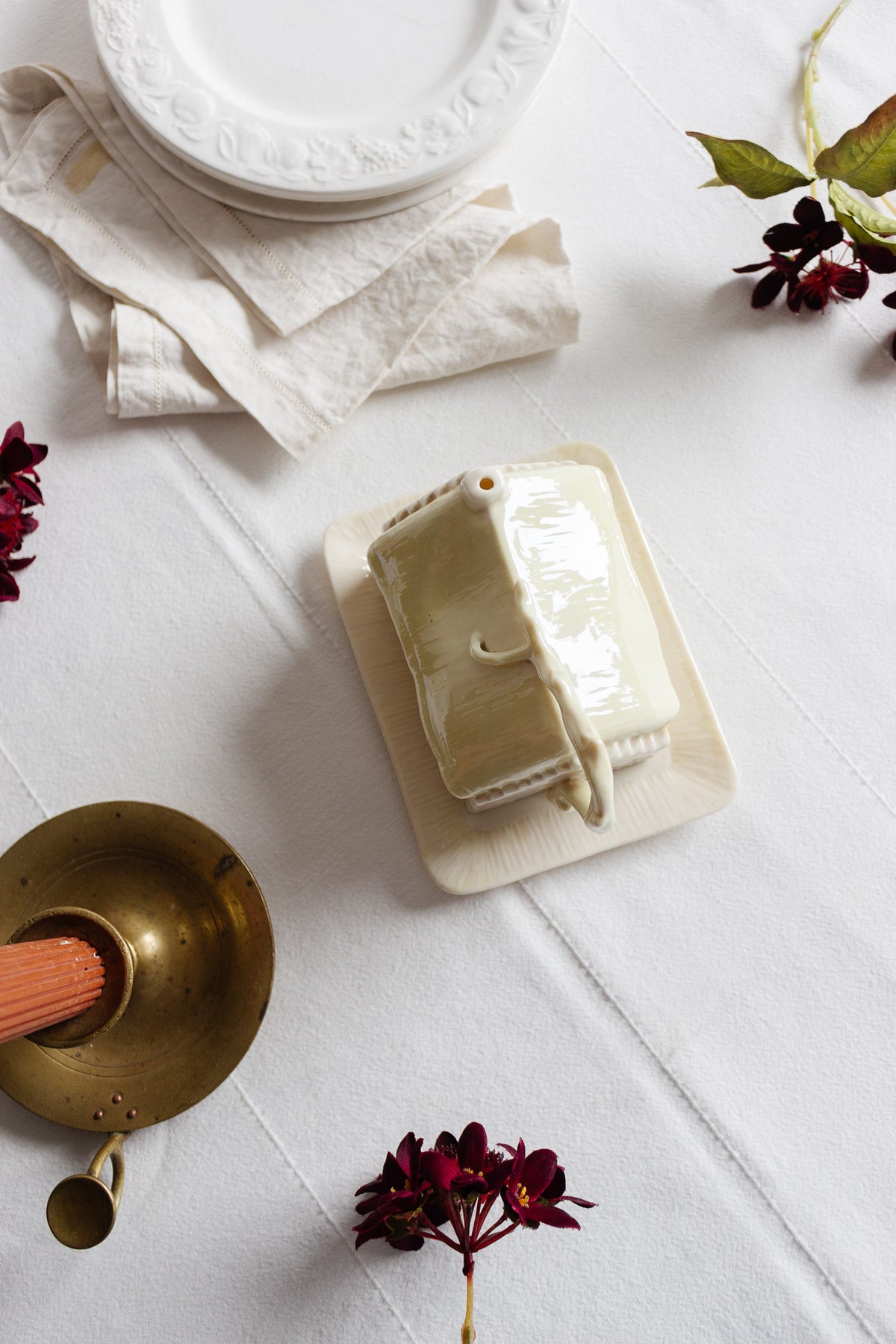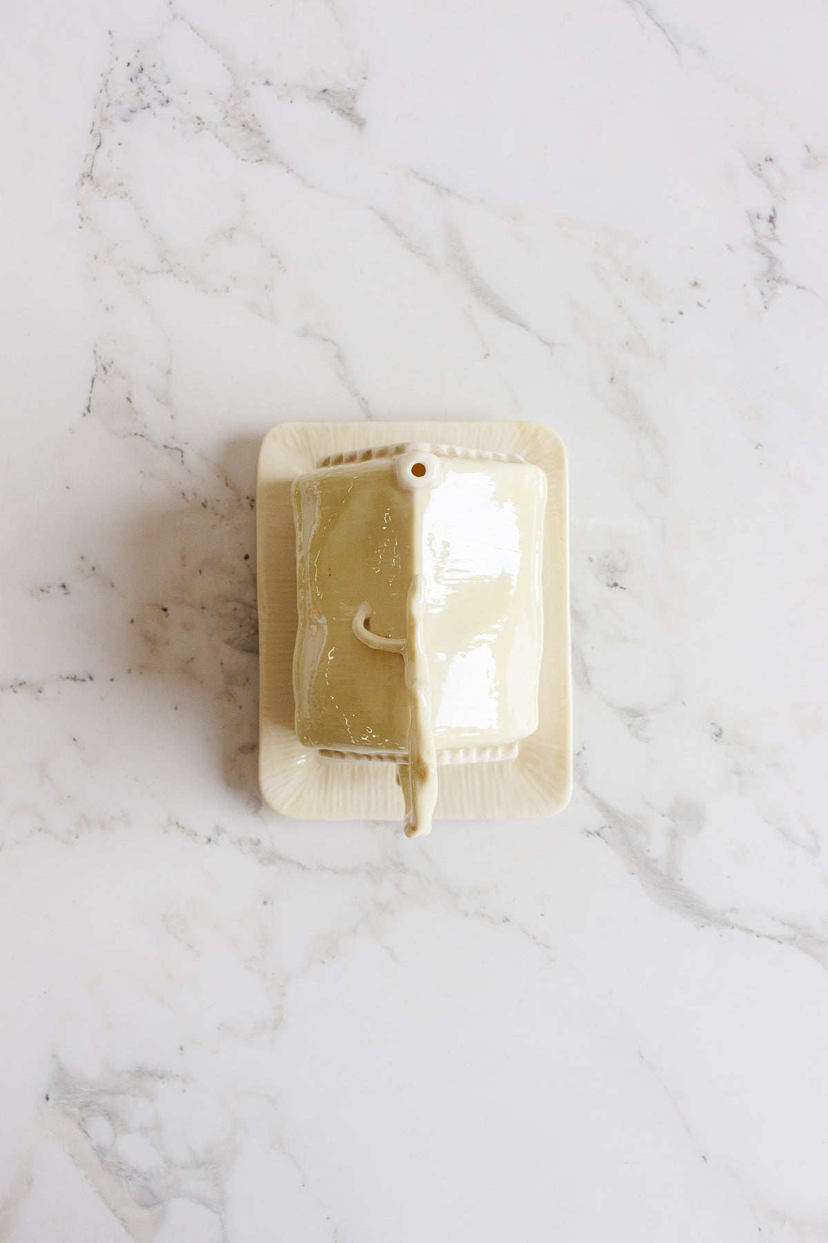 A vintage Belleek Cottage covered butter dish, crafted in Ireland between 1965 and 1980 and sourced from a brocante in Marseille. Shaped as a thatched Irish cottage, it carries the delicate translucence for which Belleek porcelain is renowned, paired with whimsical charm and fine detail. Rarely found today, especially outside Ireland, this piece stands as both a functional table accessory and a collectible treasure.
