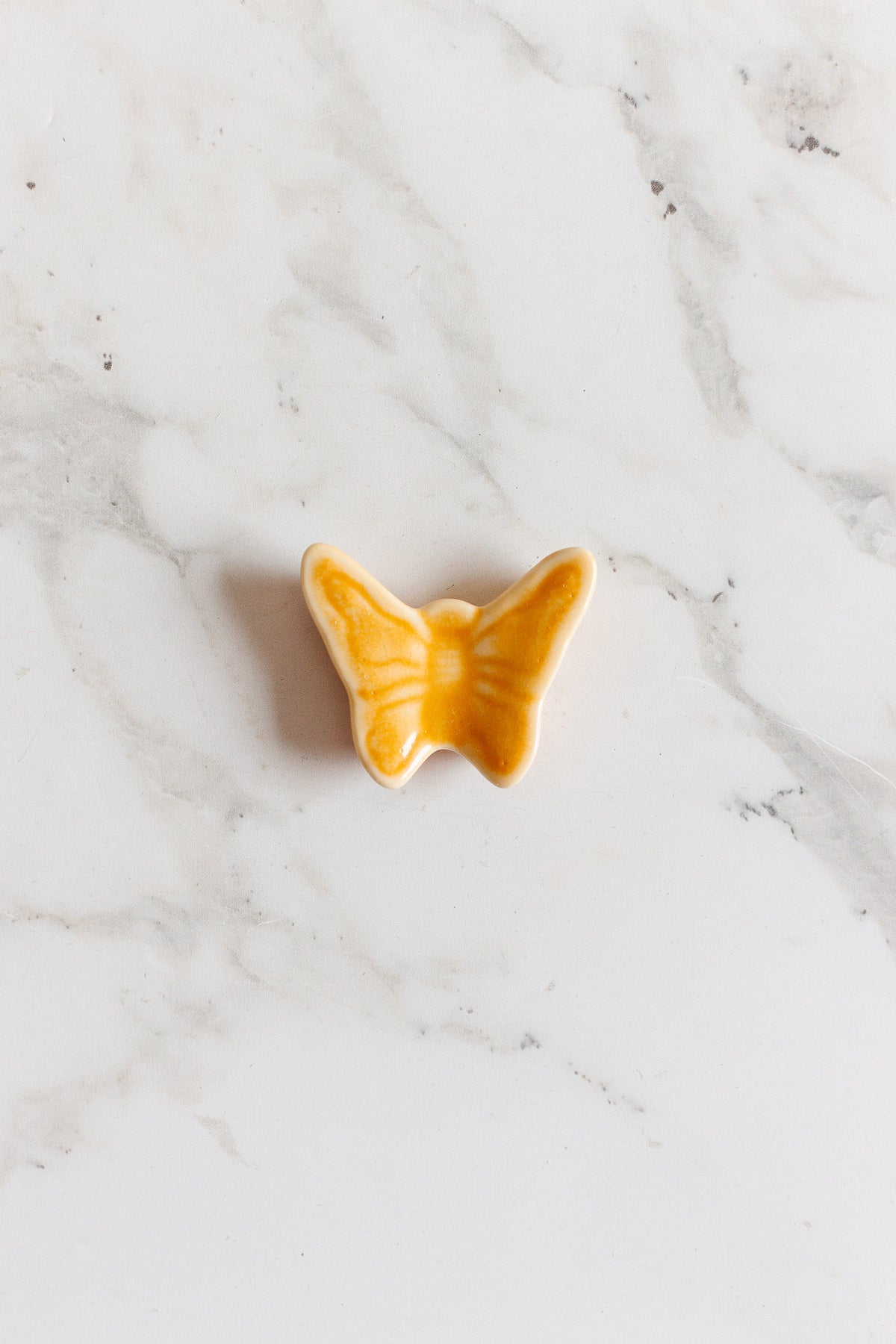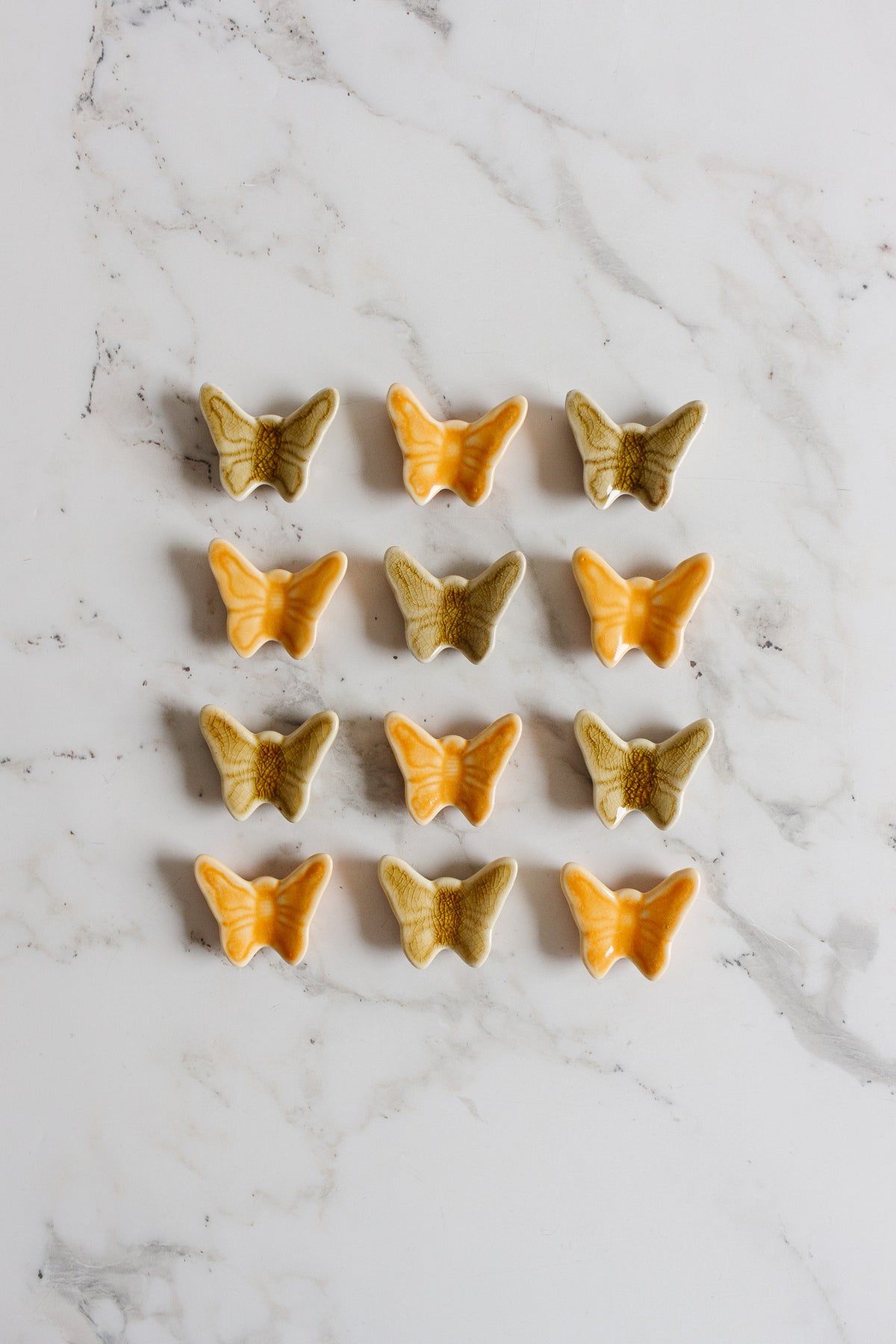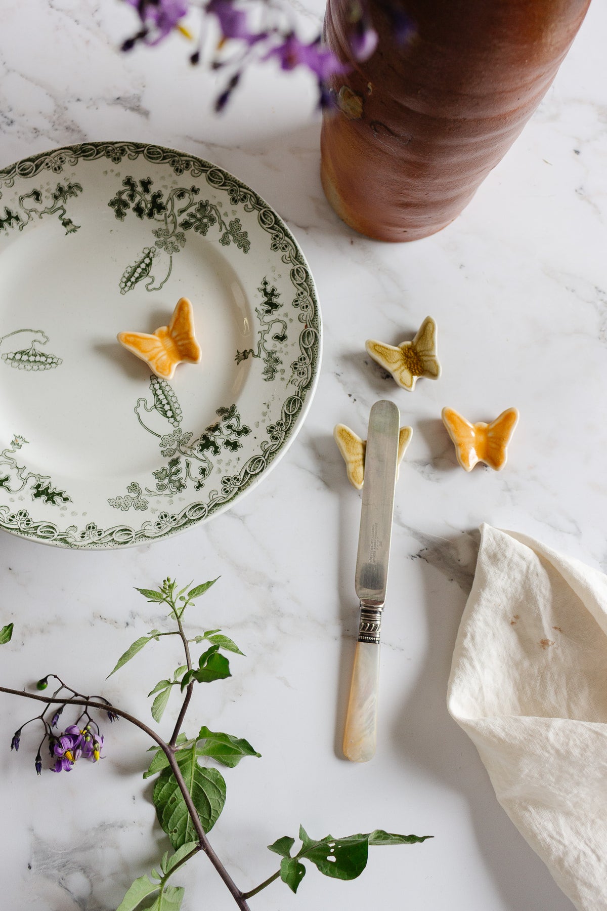Set of 6 vintage French “Papillon” knife rests, each shaped like a butterfly and crafted in glazed pottery. Both functional and decorative, knife rests are placed beside each setting to keep knives or other utensils from touching the table or tablecloth between bites. A charming addition to any table. Sourced from an estate in Aix-en-Provence.