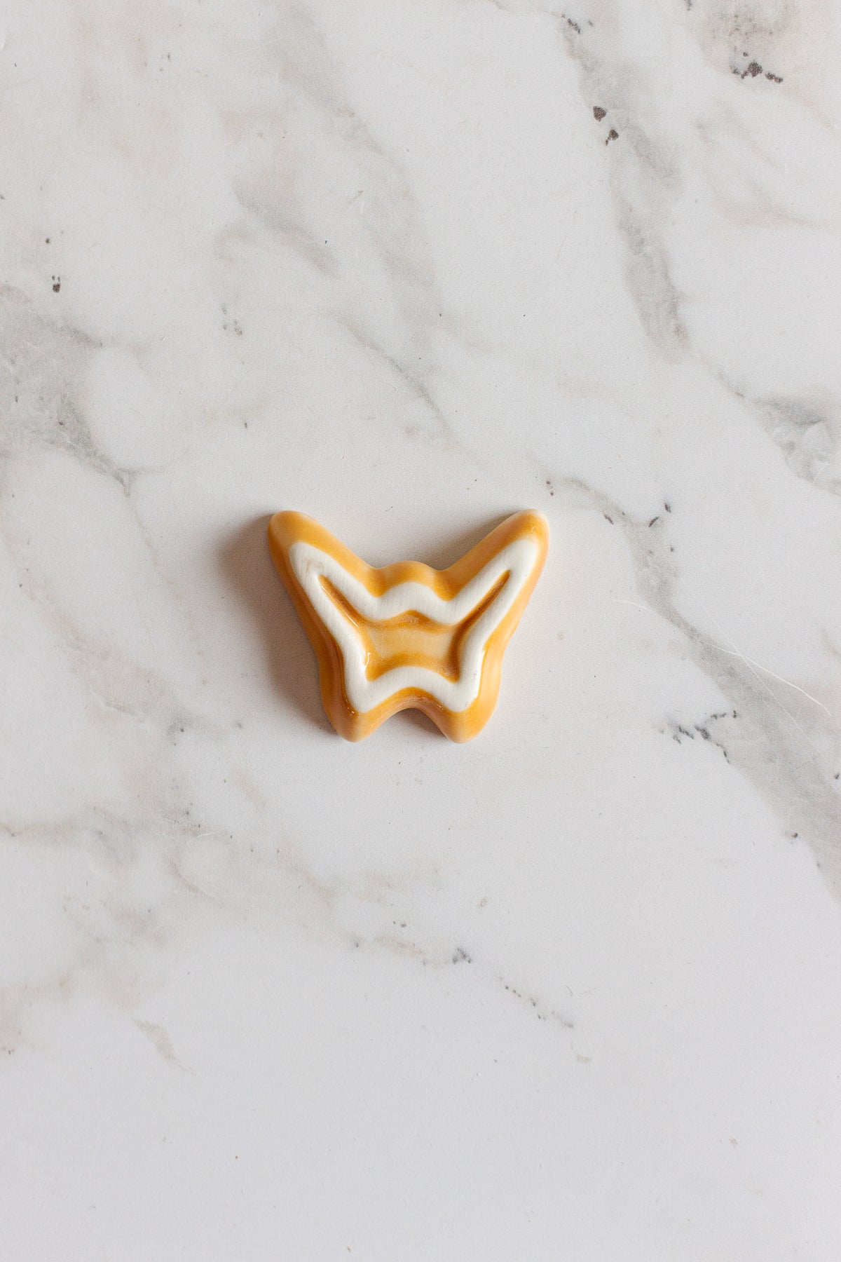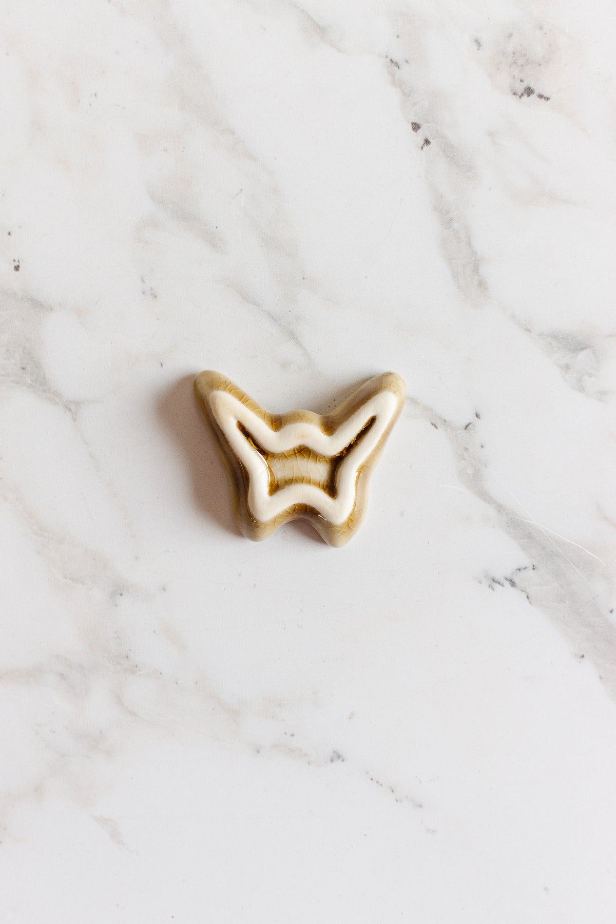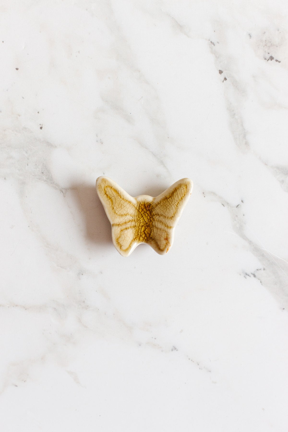 Set of 6 vintage French “Papillon” knife rests, each shaped like a butterfly and crafted in glazed pottery. Both functional and decorative, knife rests are placed beside each setting to keep knives or other utensils from touching the table or tablecloth between bites. A charming addition to any table. Sourced from an estate in Aix-en-Provence.