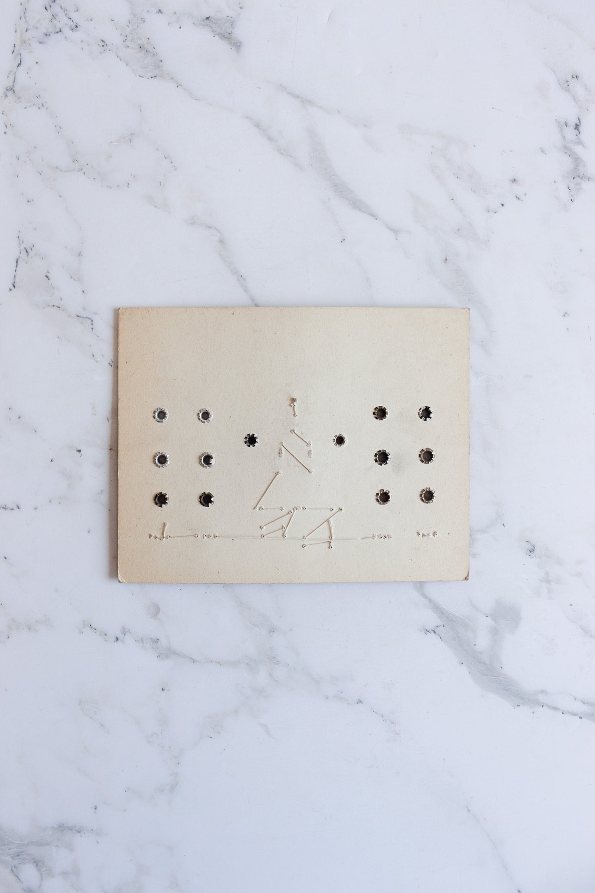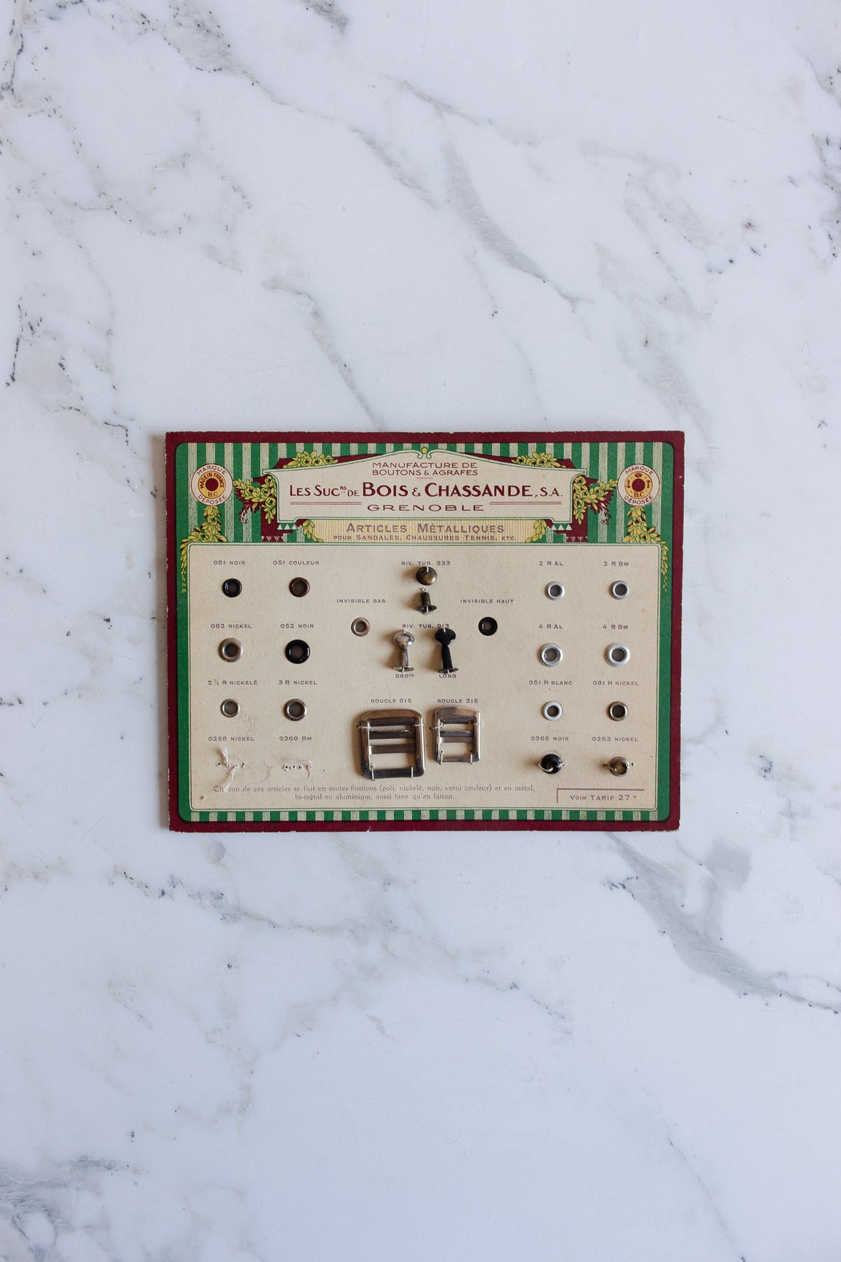 The card’s colorful design, exquisite typography, and reference to “VOIR TARIF 27” highlight its historical use as a sales tool. A couple of eyelets are missing, adding character and charm to this collectible piece of French industrial history. Sourced from a brocante in Marseille.