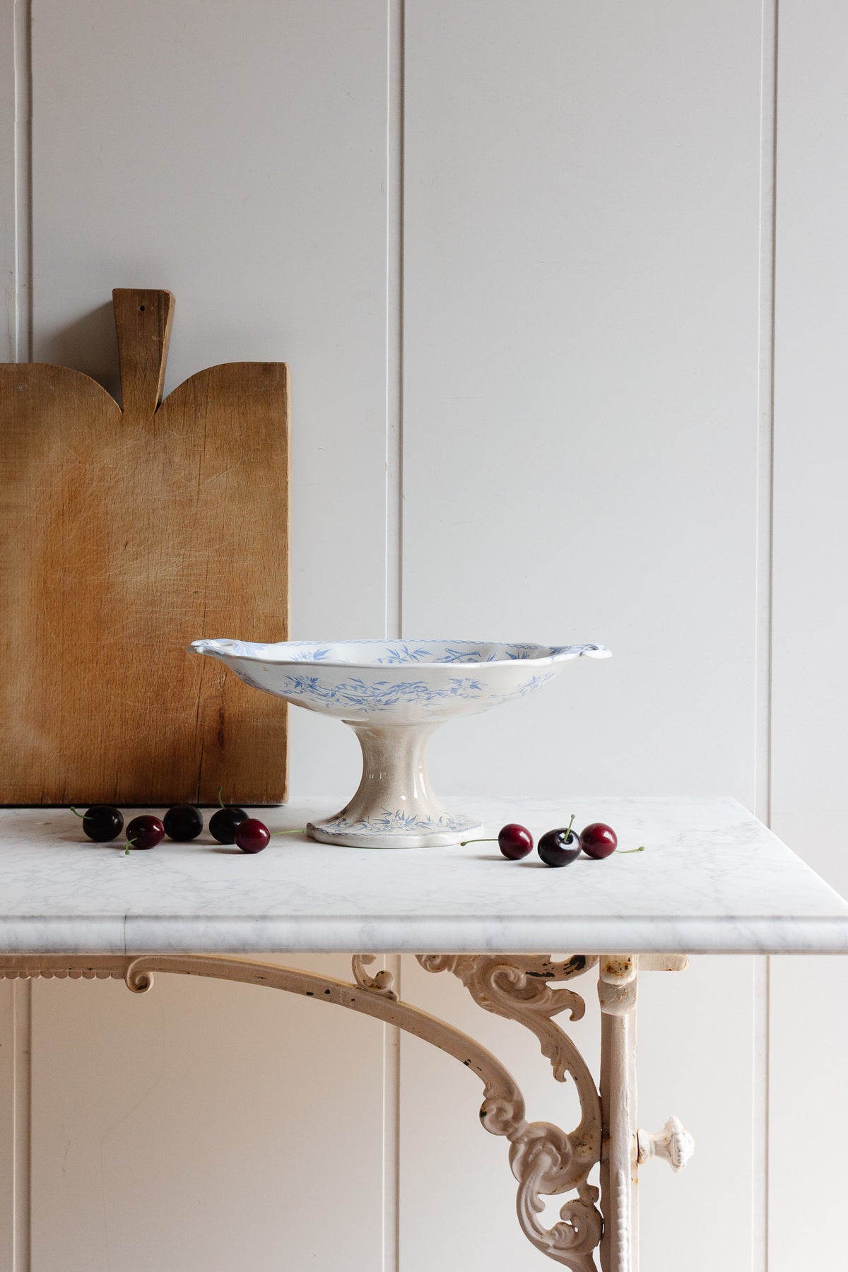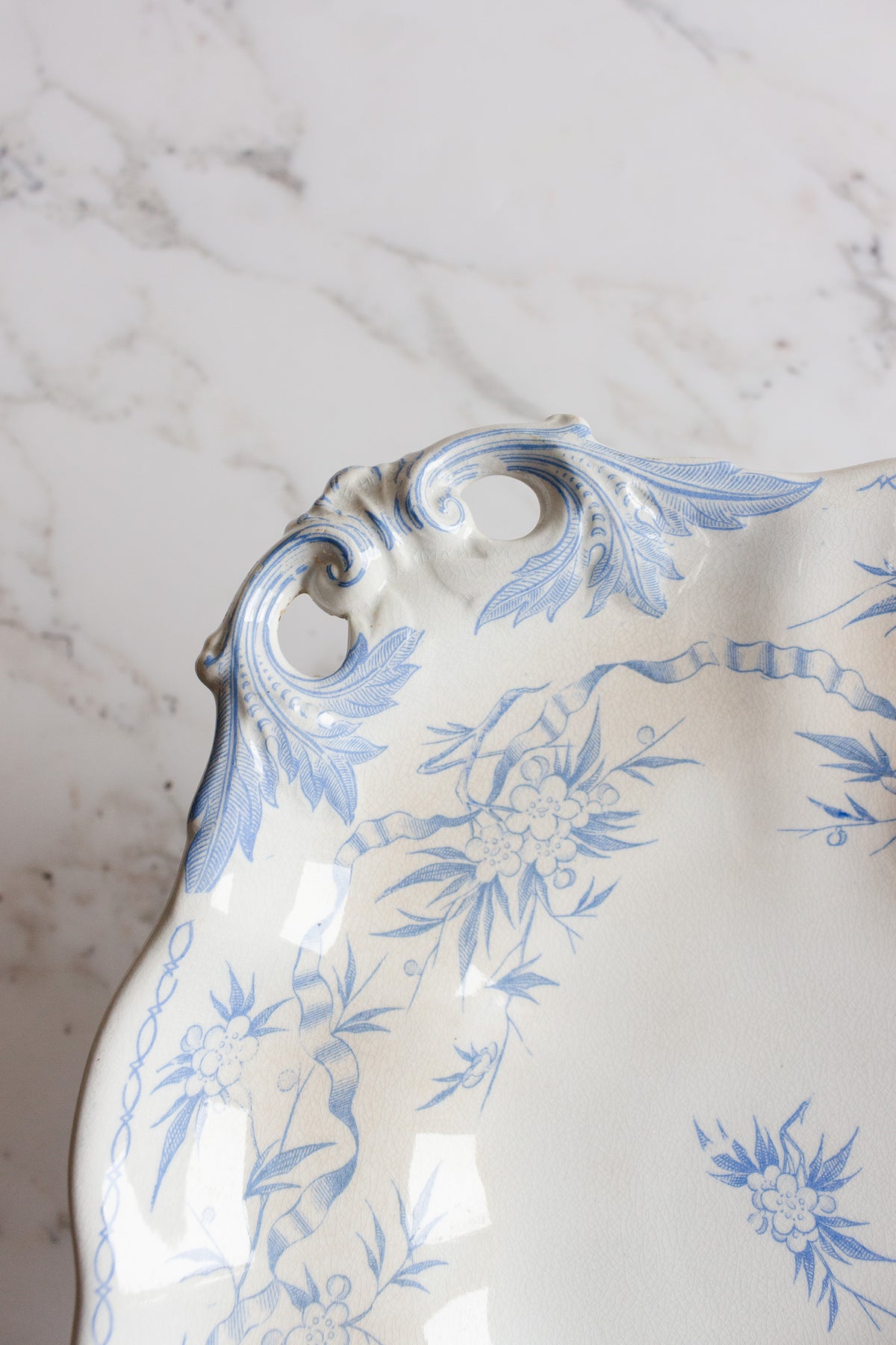 Elegant raised cake plate in classic blue and white transferware, marked “Épine” by U&Cie Sarreguemines, a renowned French faience manufacturer. The plate features delicate floral detailing, rare reticulated handles, and a pedestal base, perfect for serving cakes or pastries with charm. Stamped on the underside, this piece dates from the late 19th to early 20th century and was sourced from an estate in Aix-en-Provence. A refined addition to any collection of French tableware or as a statement piece for entertaining.