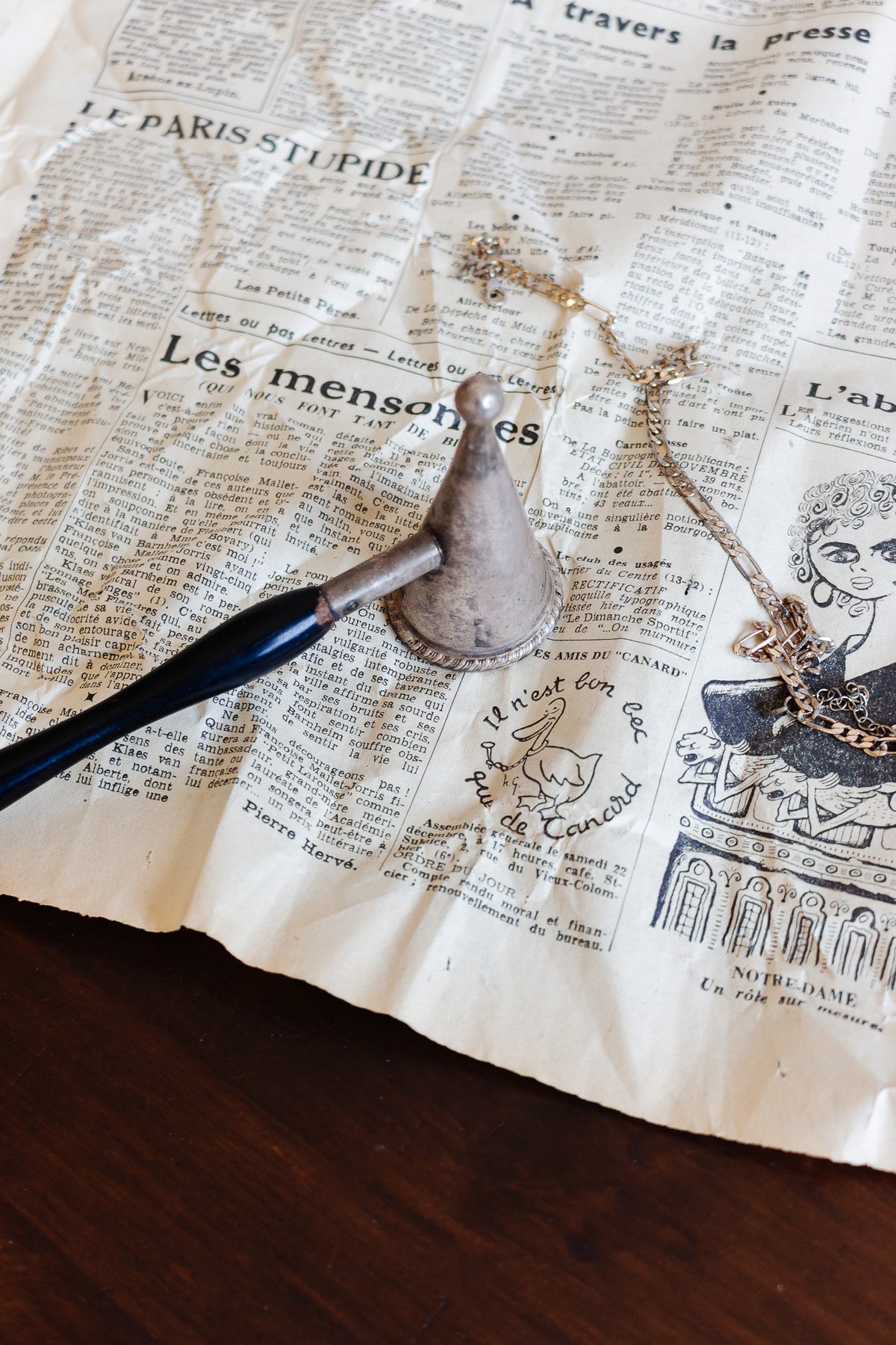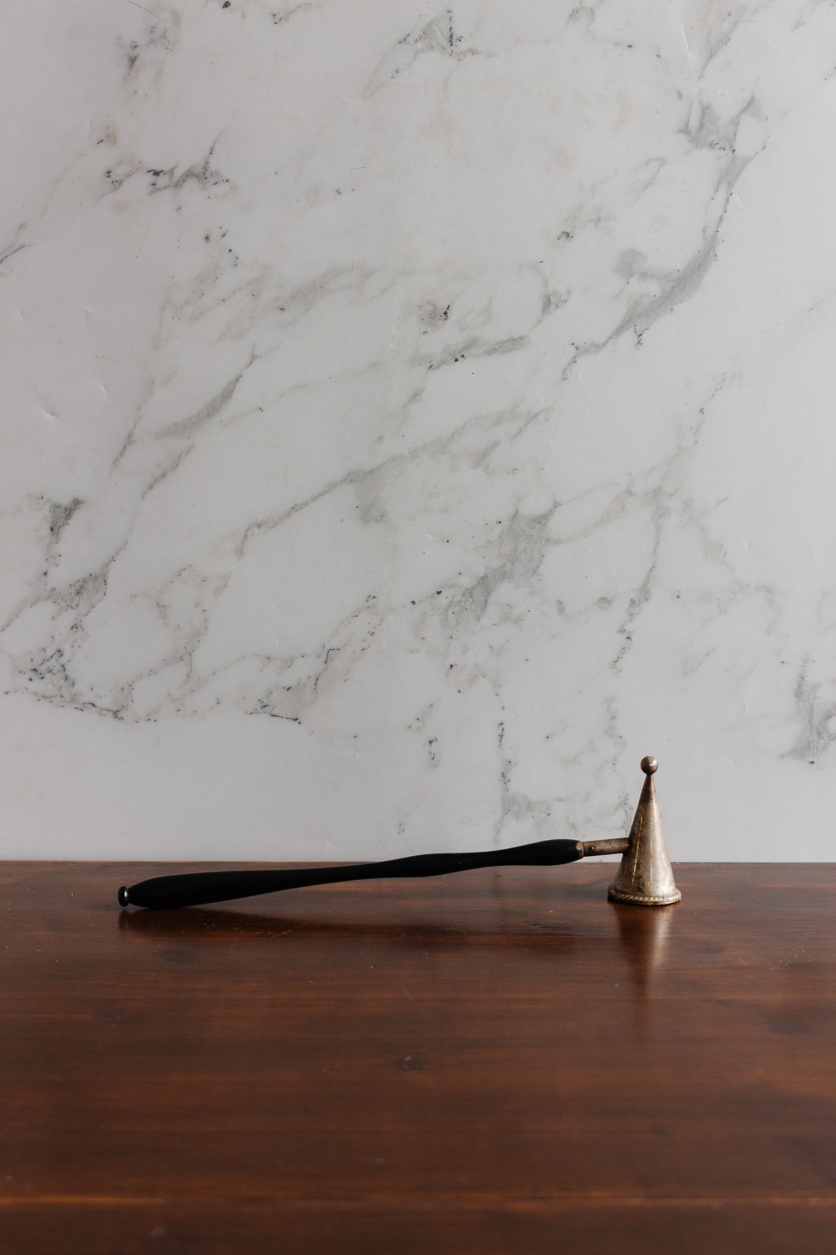 This antique European candle snuffer features a turned wooden ebony handle paired with a metal bell designed to gently extinguish candle flames. A practical household tool before modern lighting, it was used to preserve wicks and prevent smoke. A sculptural and functional accent for a mantel or tablescape, sourced from a brocante in Marseille.