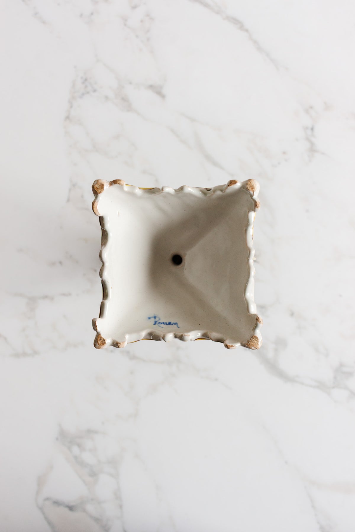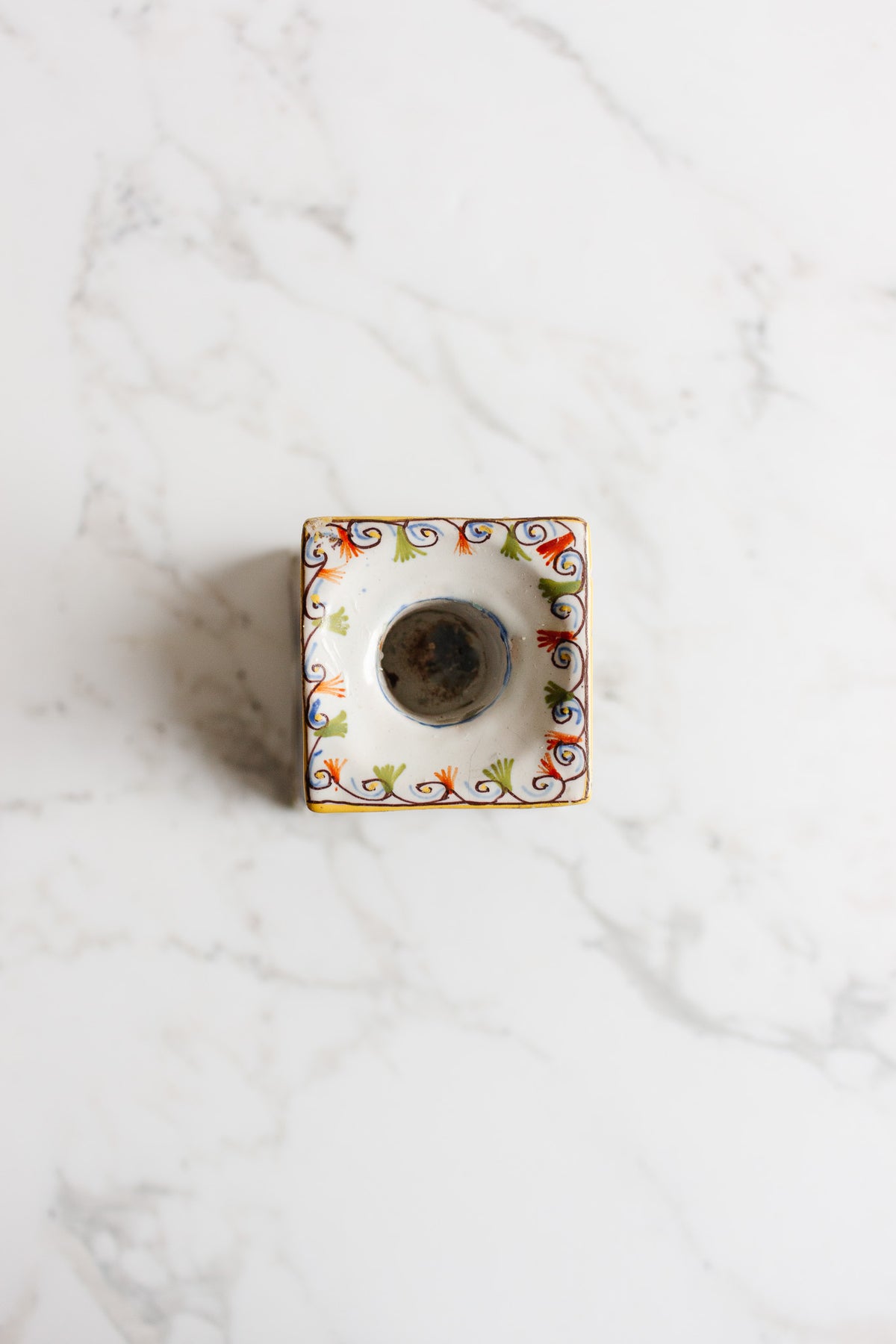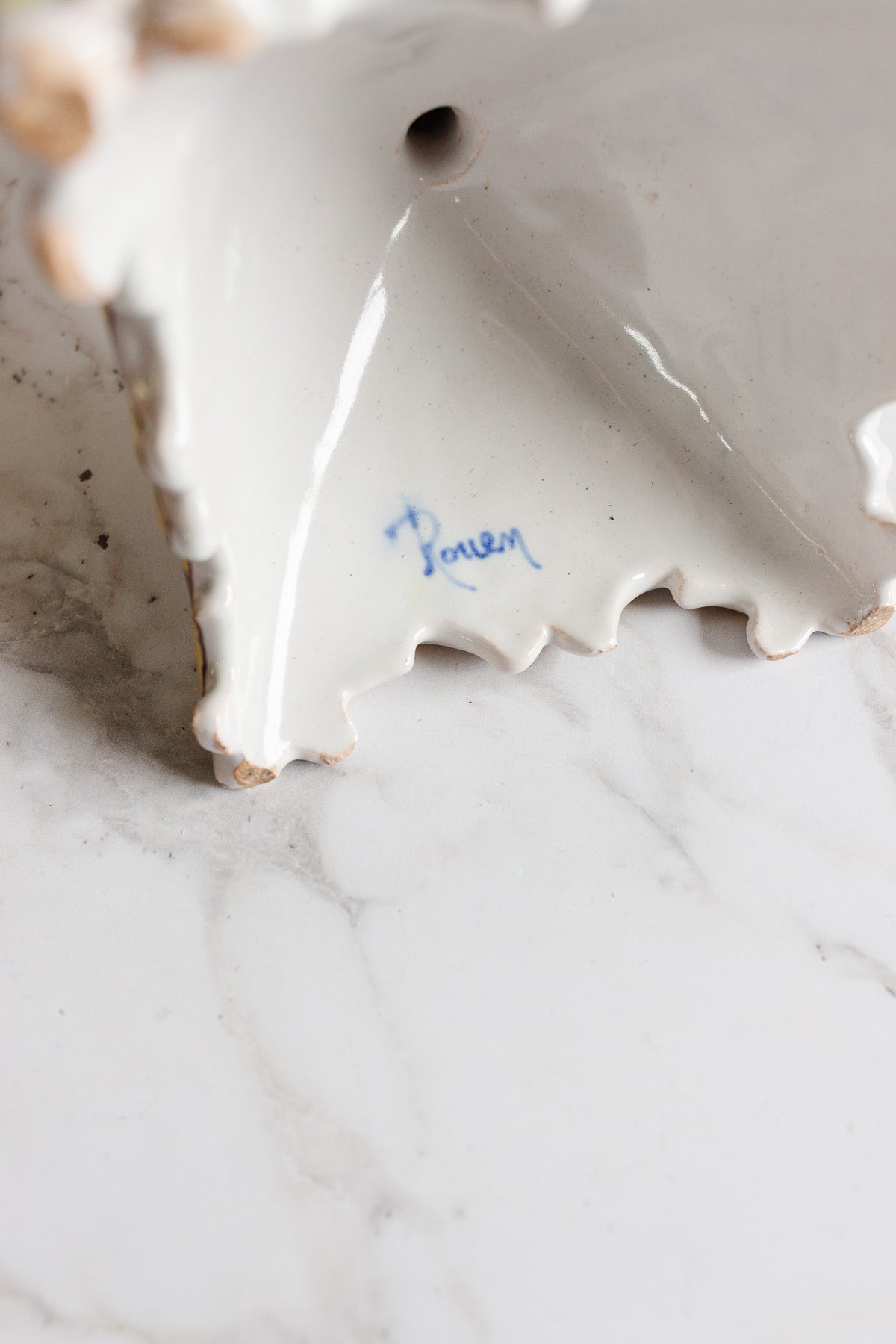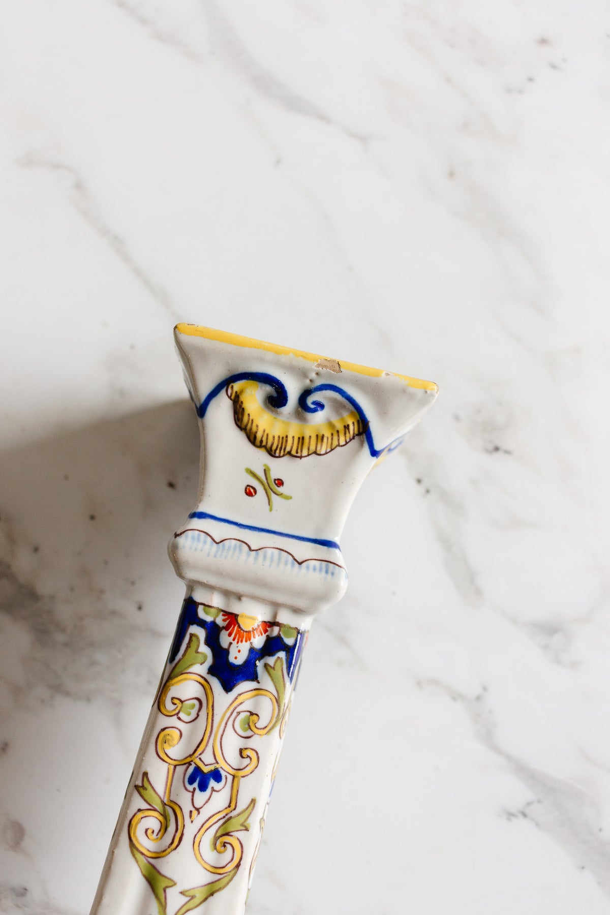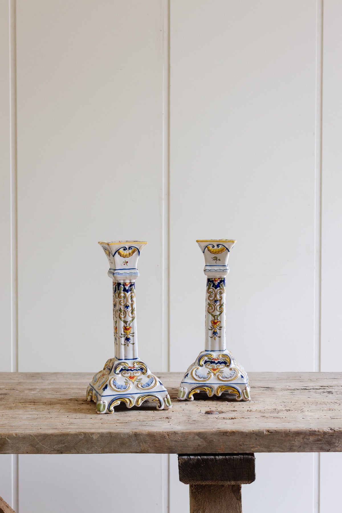 Exquisite pair of 19th century French Rouen candlesticks, signed and sourced from a brocante in Barjac. Hand-painted in rich, traditional Rouen tones with delicate floral motifs, each bears the soulful marks of time—small imperfections that only add to their allure. Rare to find as a pair, they bring instant character and romance to any table, mantel, or collector’s cabinet. A true treasure for lovers of French heirlooms.