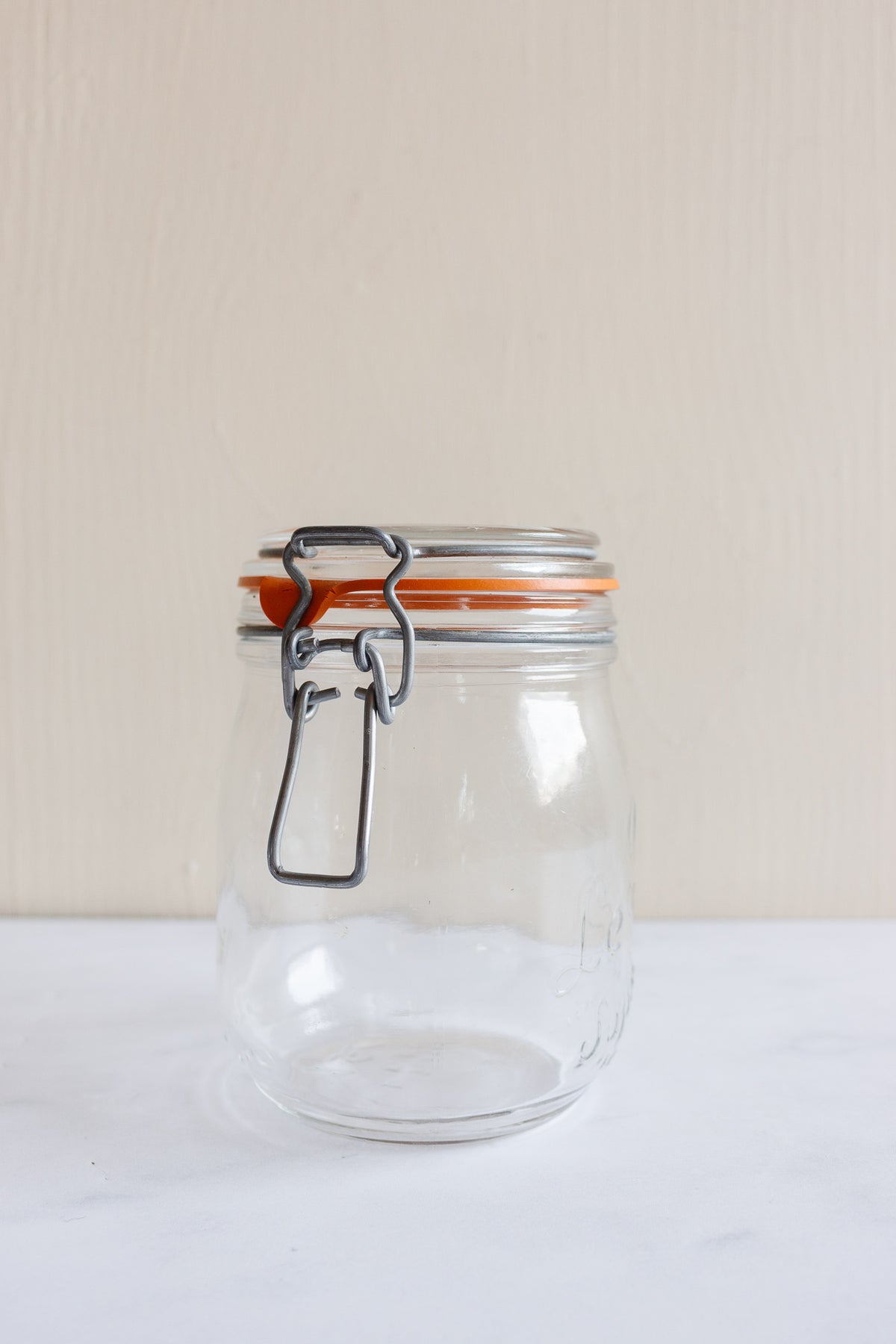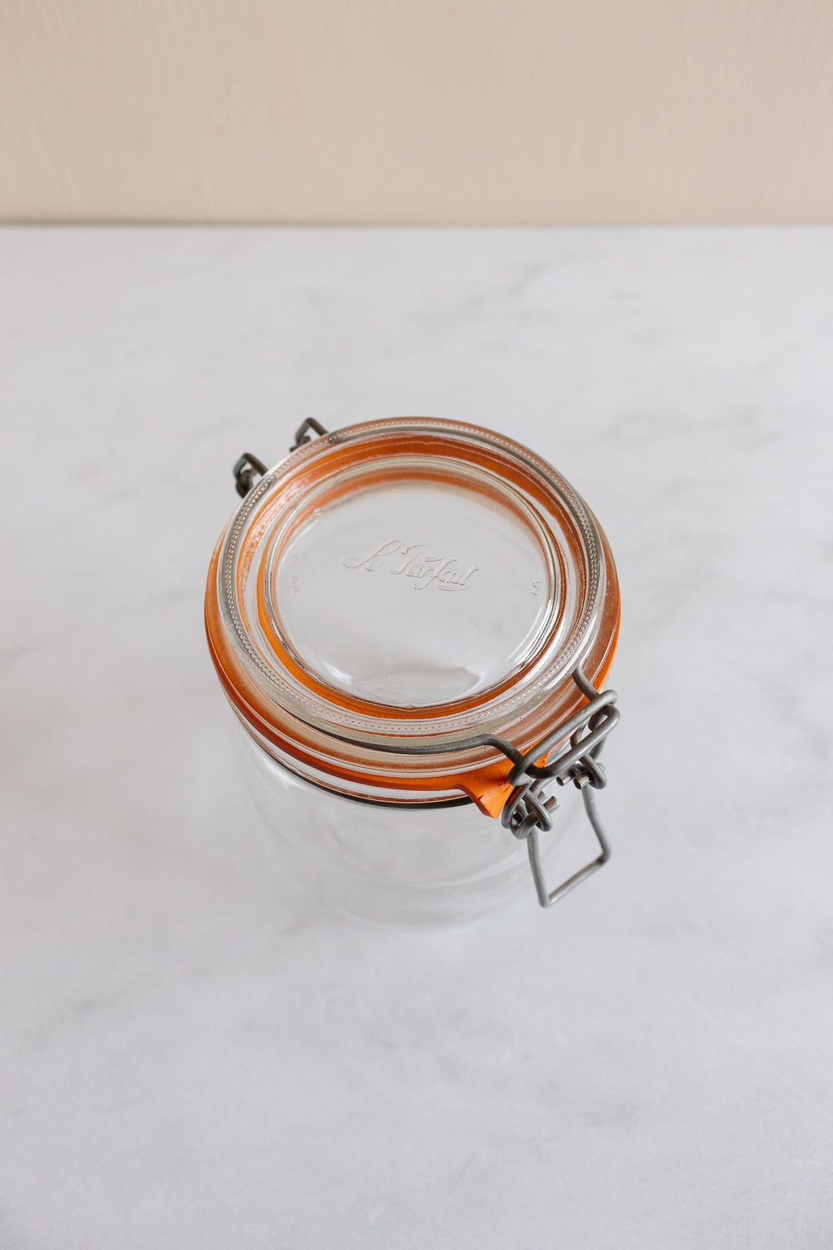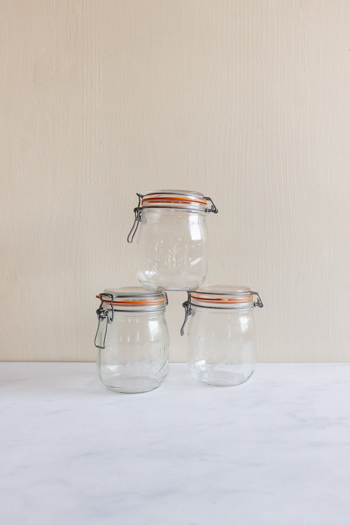 Le Parfait was founded in the early 1930s in Reims, France, at Verreries Mécaniques Champenoises (VMC), a major glass-making company. With a steady production of high-quality wares and a product line that has continuously evolved to meet consumers’ changing needs and desires, Le Parfait served the glass jar market throughout the 20th century.  Sourced from a brocante in Aix-en-Provence. Sold individually.