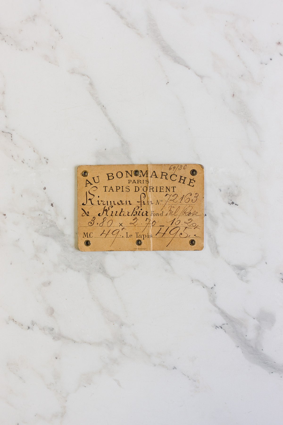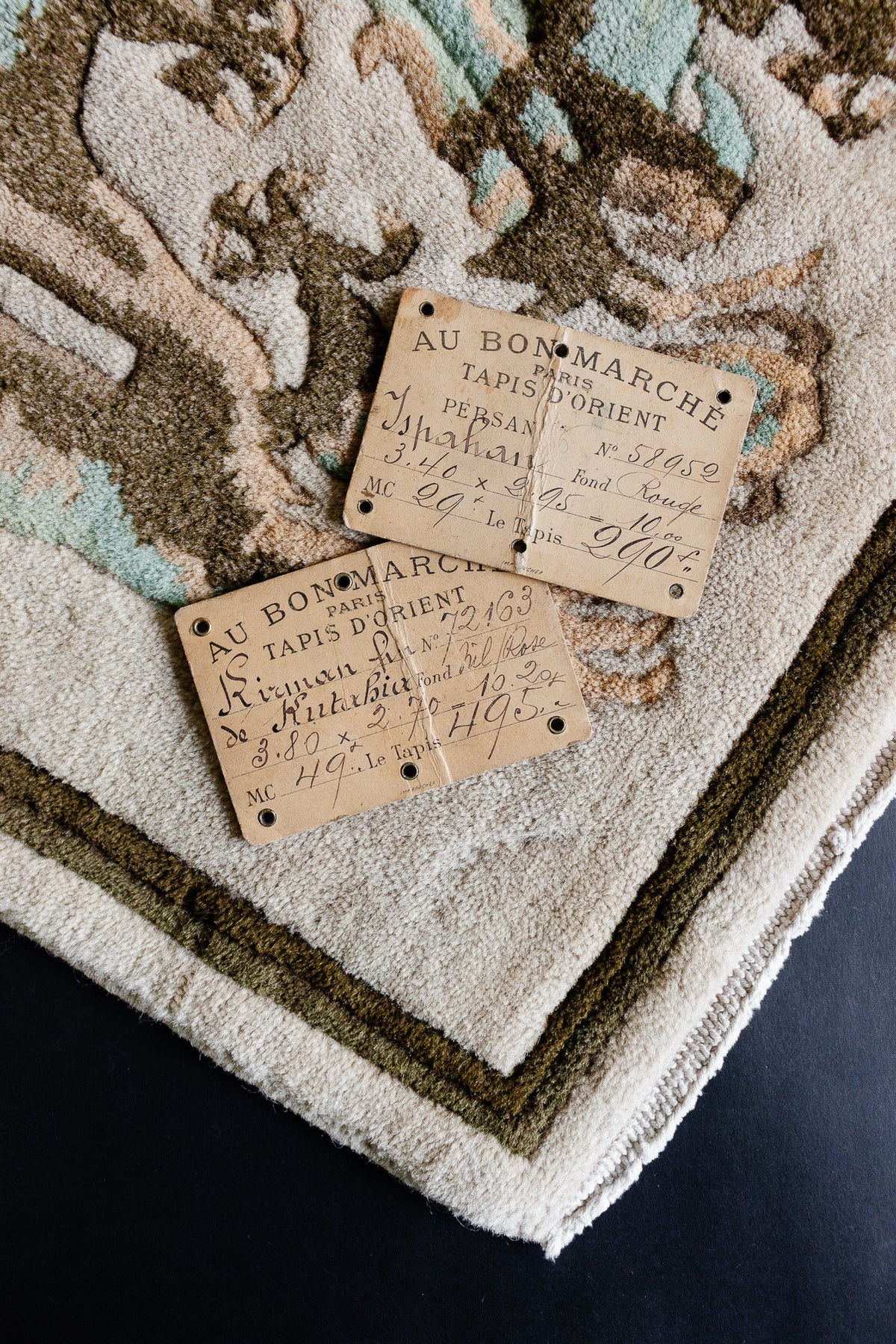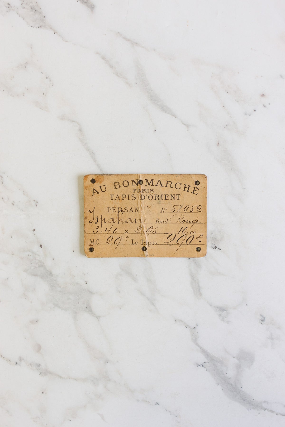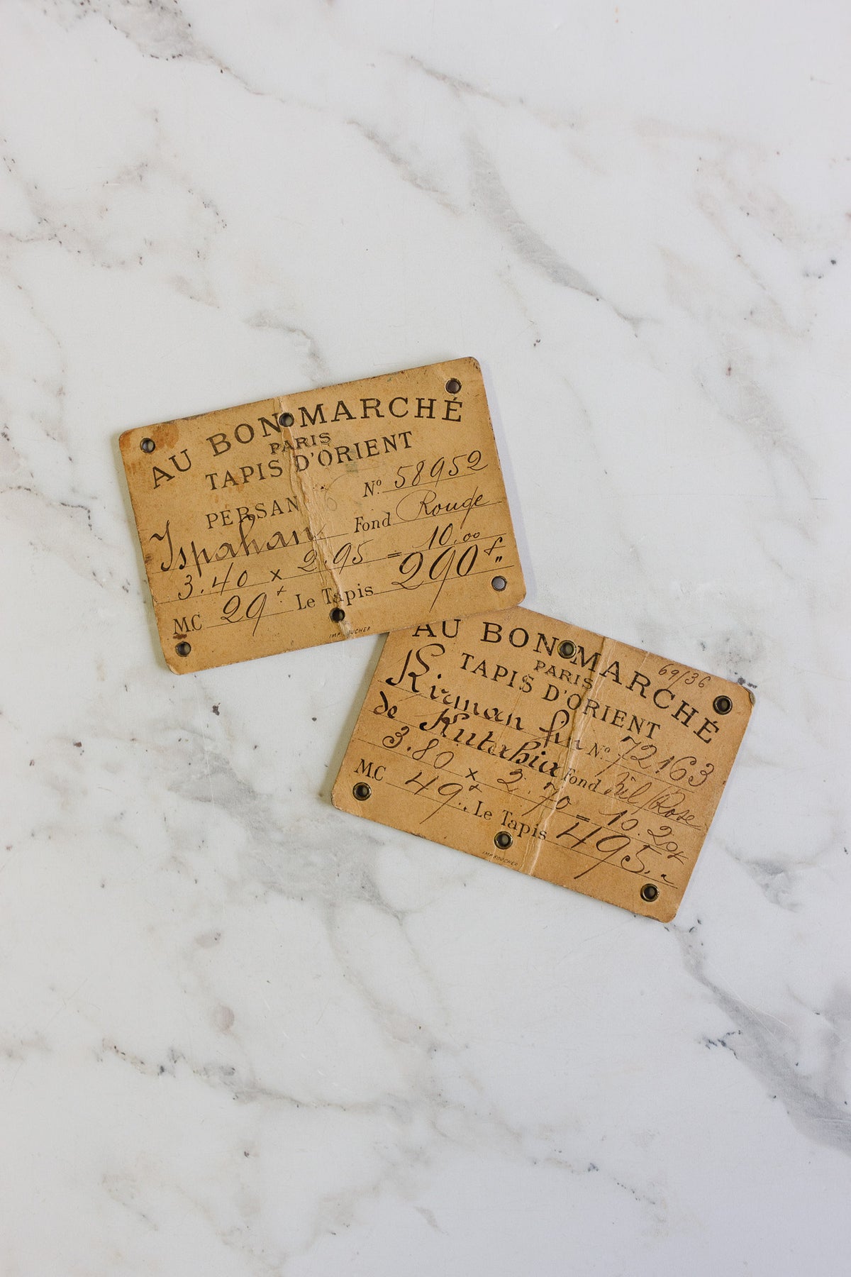 A rare pair of antique French “Au Bon Marché” carpet price tags, printed on thick cardstock and finished with original handwritten details. These tags once accompanied fine Oriental and Persian carpets sold at Au Bon Marché, Paris, one of the world’s first modern department stores, and list carpet origins, dimensions, qualities, and prices in beautifully aged ink. Complete with original punched holes and rich patina from decades of handling, they offer a fascinating glimpse into early 20th-century French retail history. Sourced from a brocante in Le Mans, these authentic ephemera pieces make exceptional decorative objects for framing, styling, or display in an interior inspired by textiles, design history, or French commerce.