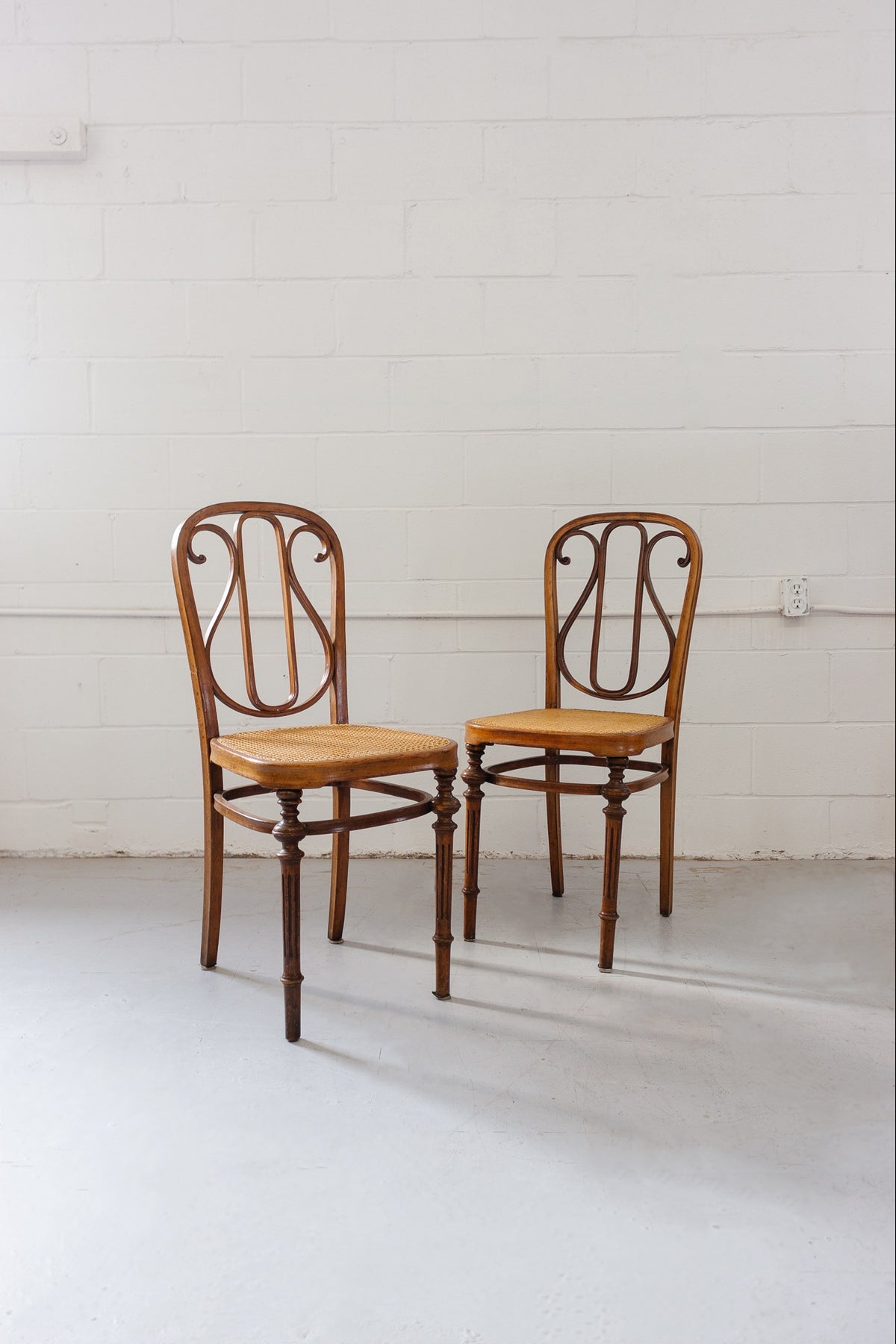 We’ve never come across such a unique seatback design in a bentwood chair before. Paired with classic lines and cane seats, they’re the perfect accent chairs to really make a statement. In very good antique condition, with some superficial signs of wear and age as pictured.